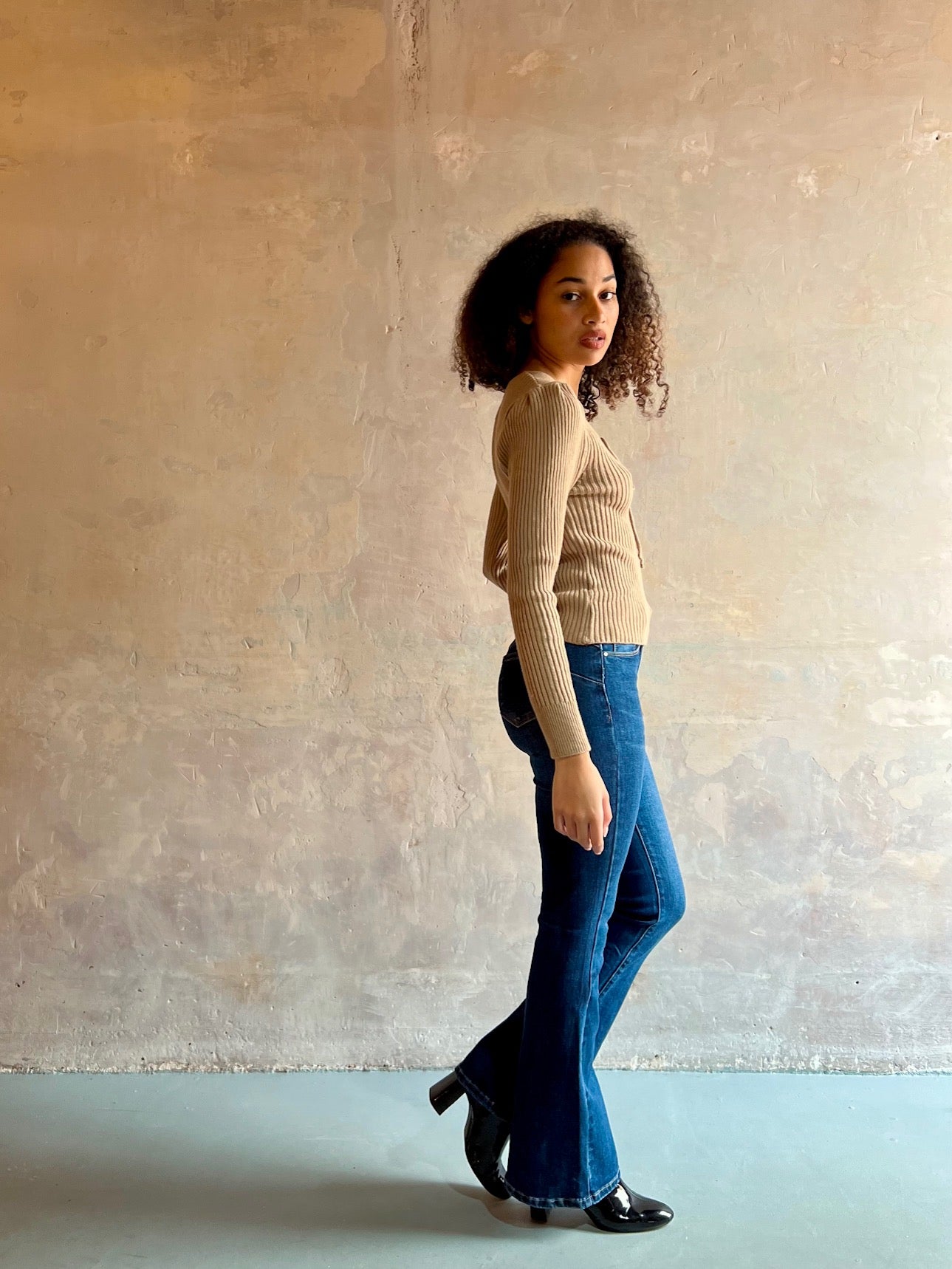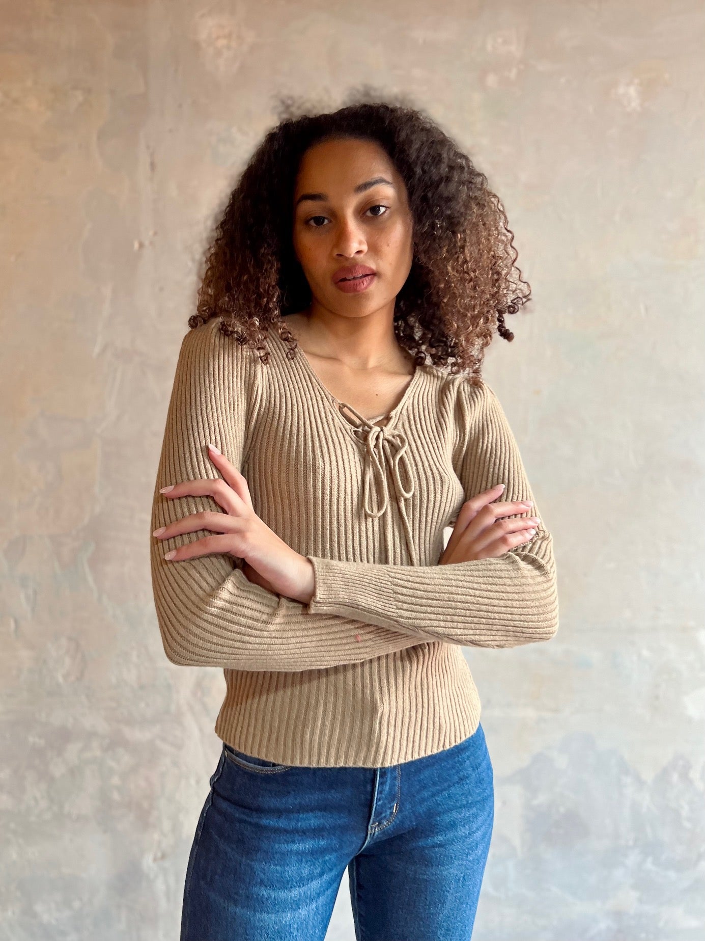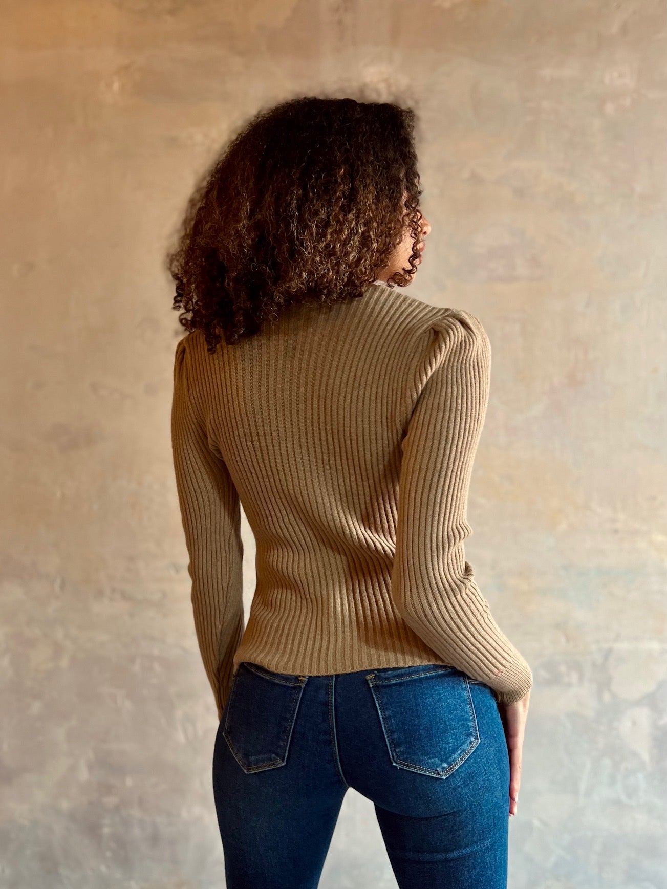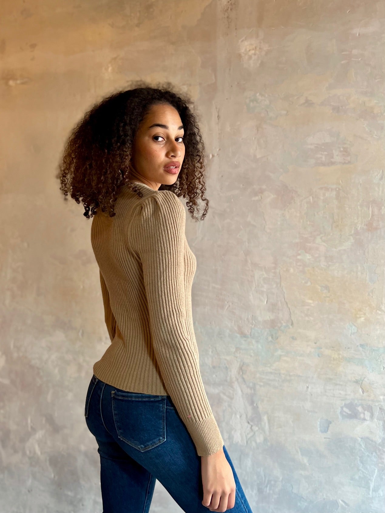 Jersey de canalé con escote pico y lazada. Manga larga abullonada.