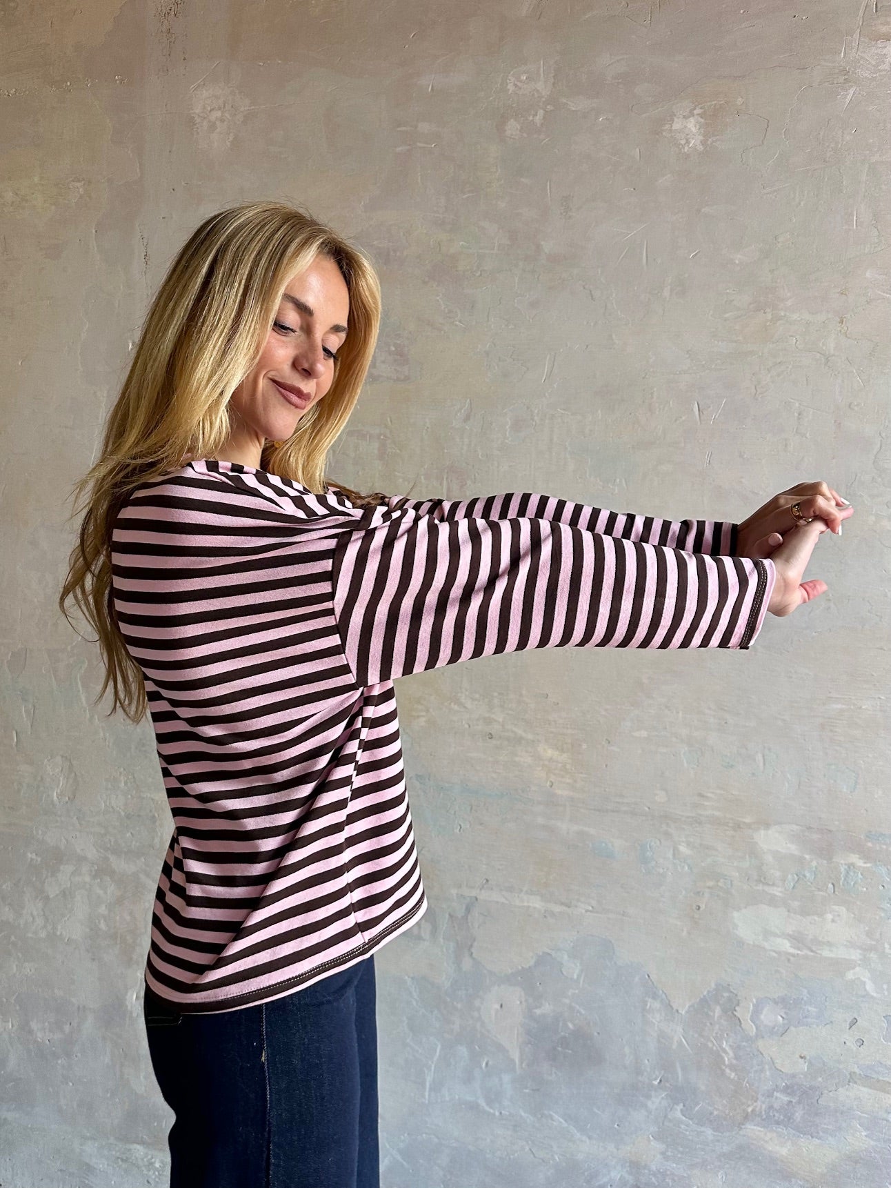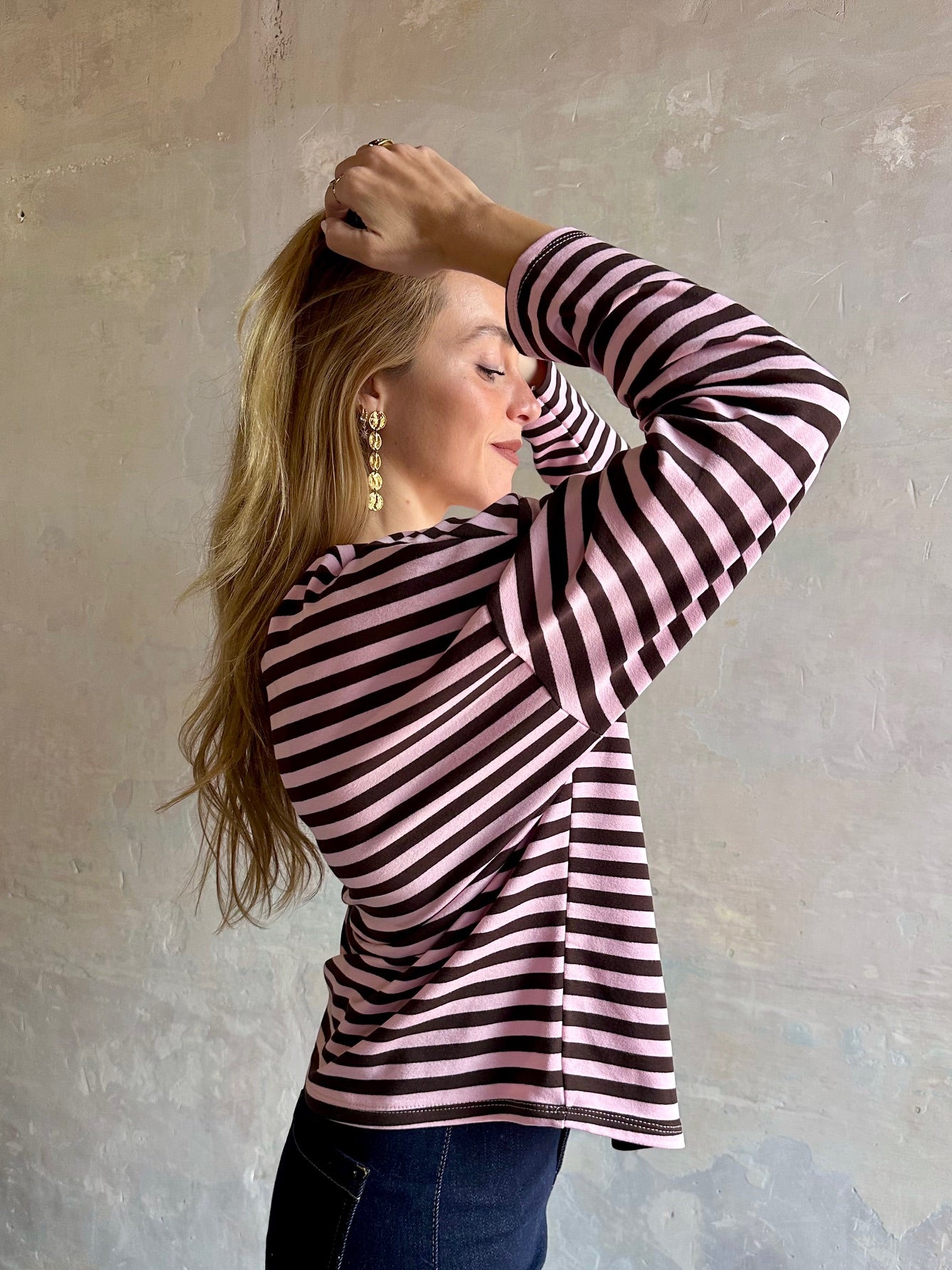 Sudadera de rayas con cuello redondo y manga larga. Su corte amplio le da un toque relajado pero con estilo —perfecta para looks casuales, días cómodos o planes espontáneos. 💫❤️