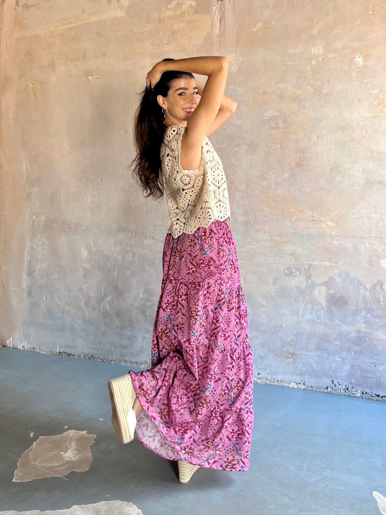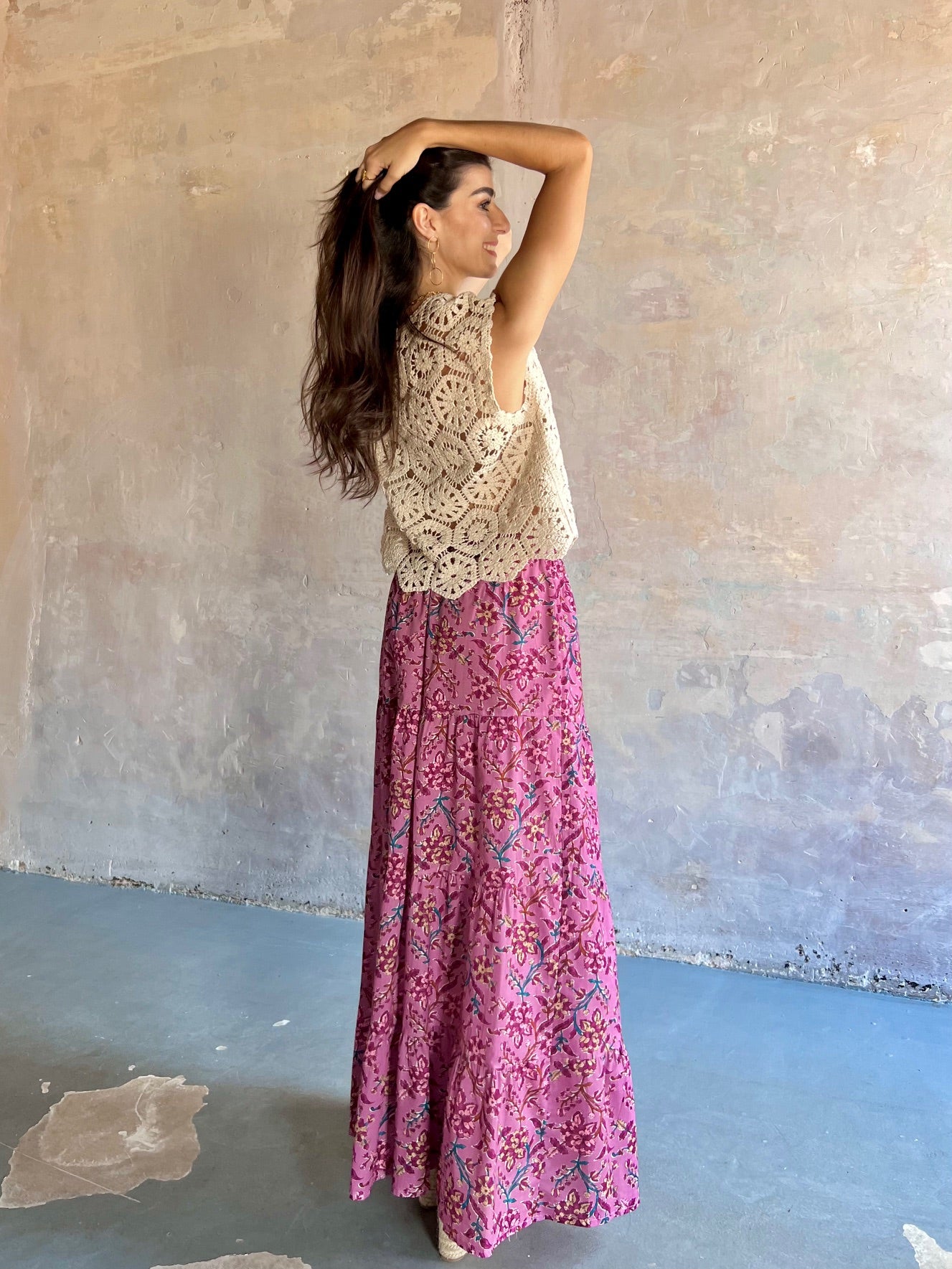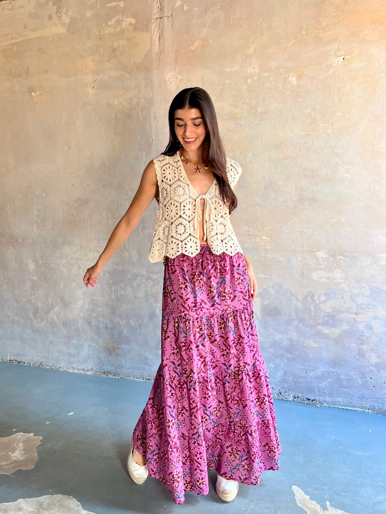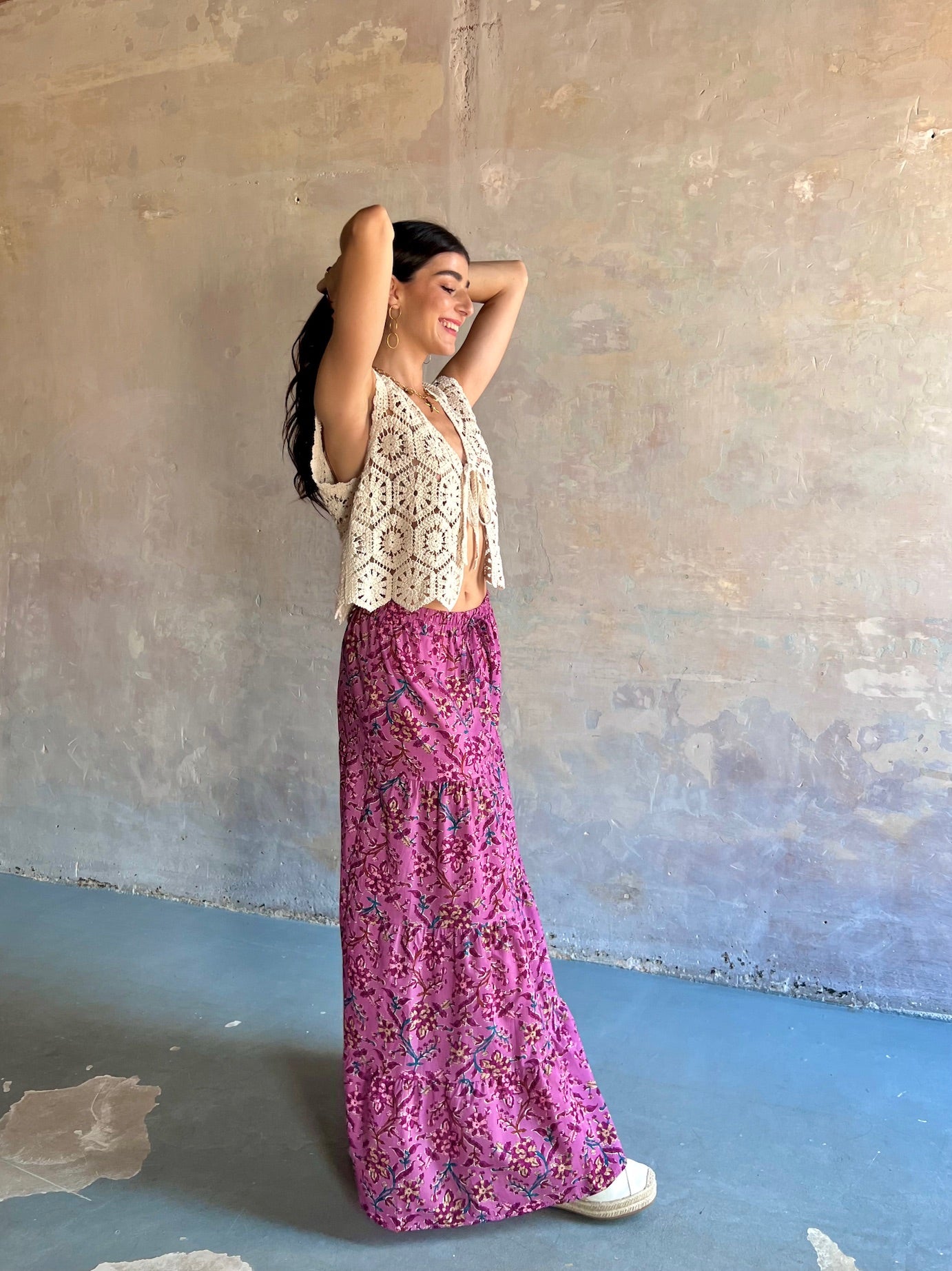 Falda larga, con goma en cintura ajustable. Bajo acabado en volantes.