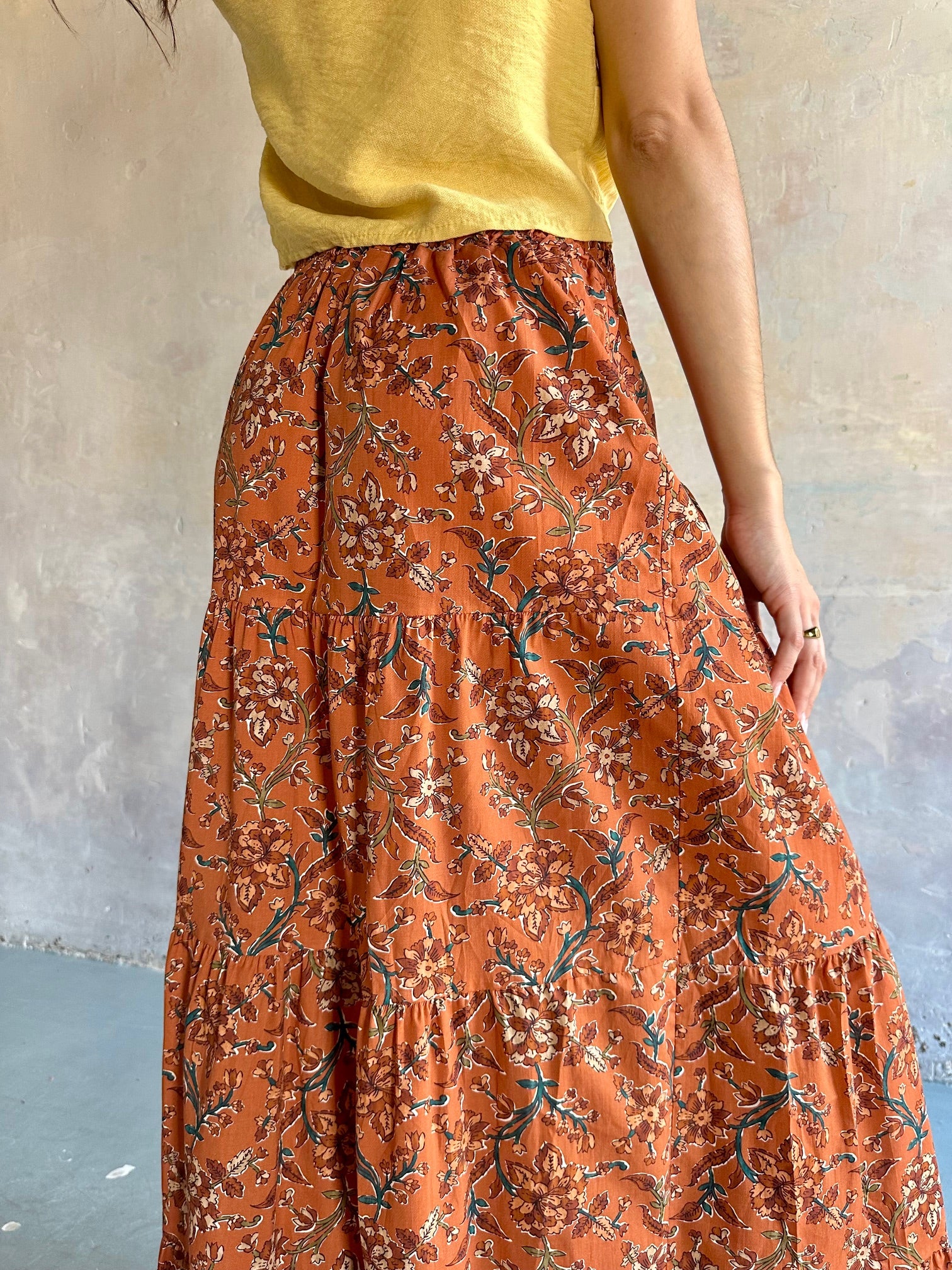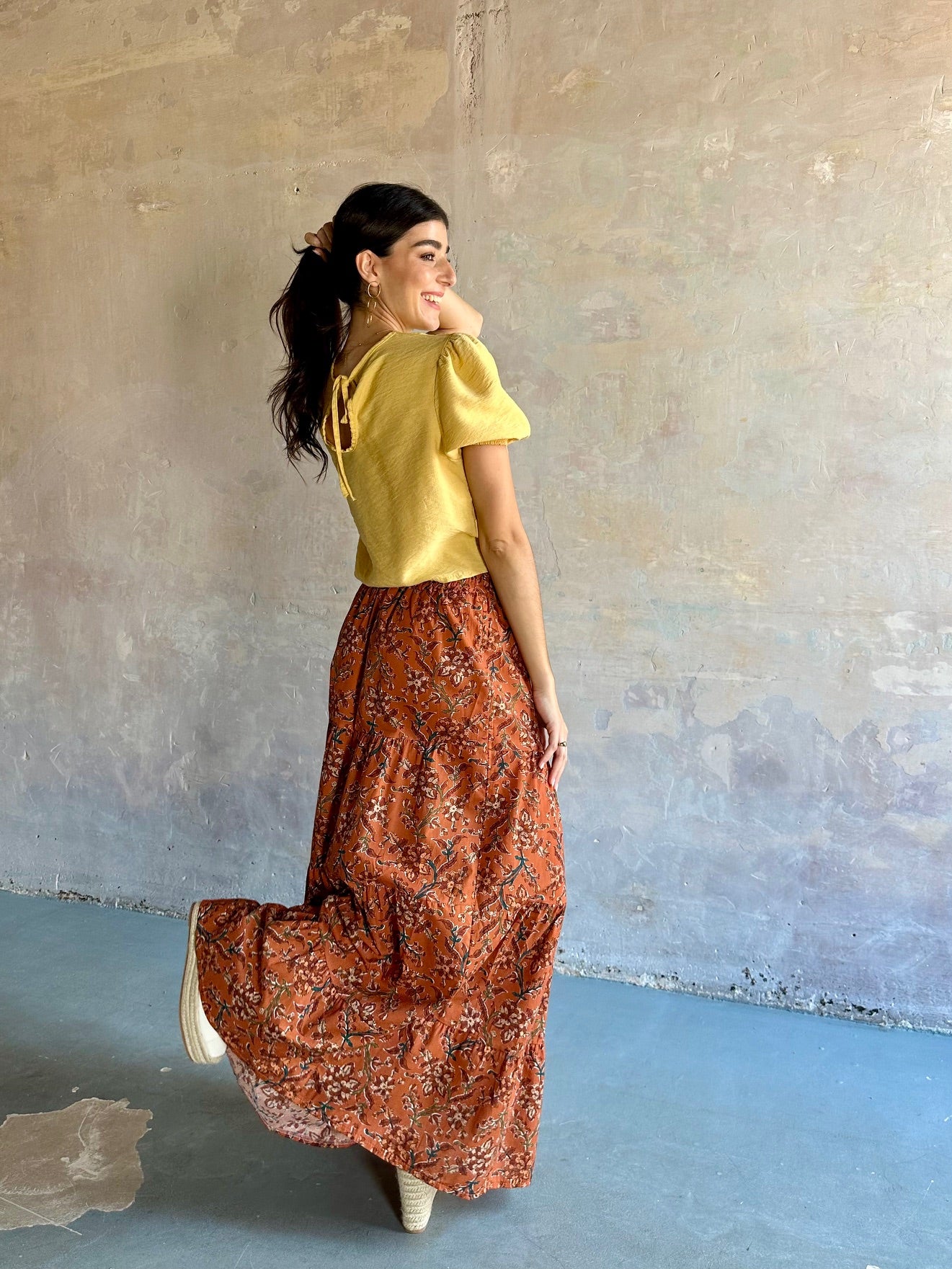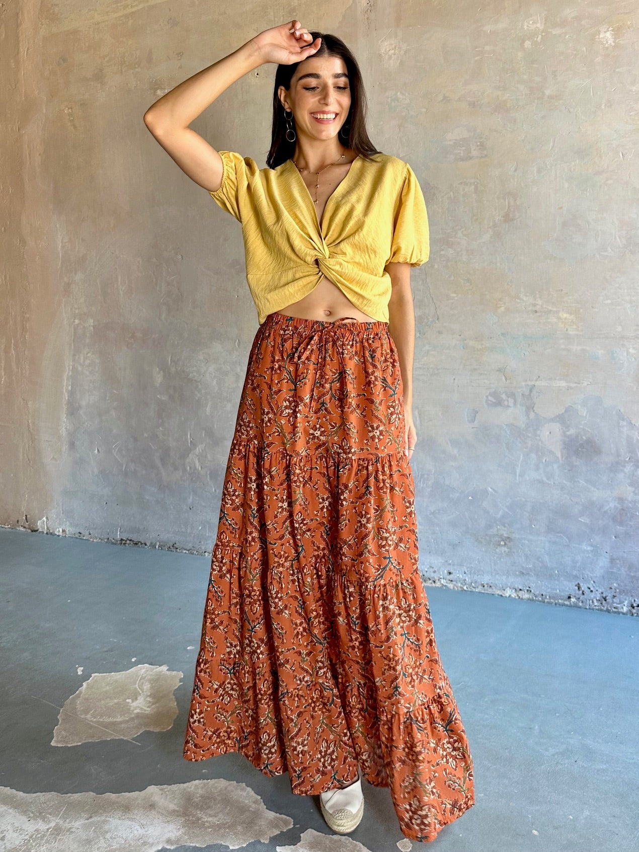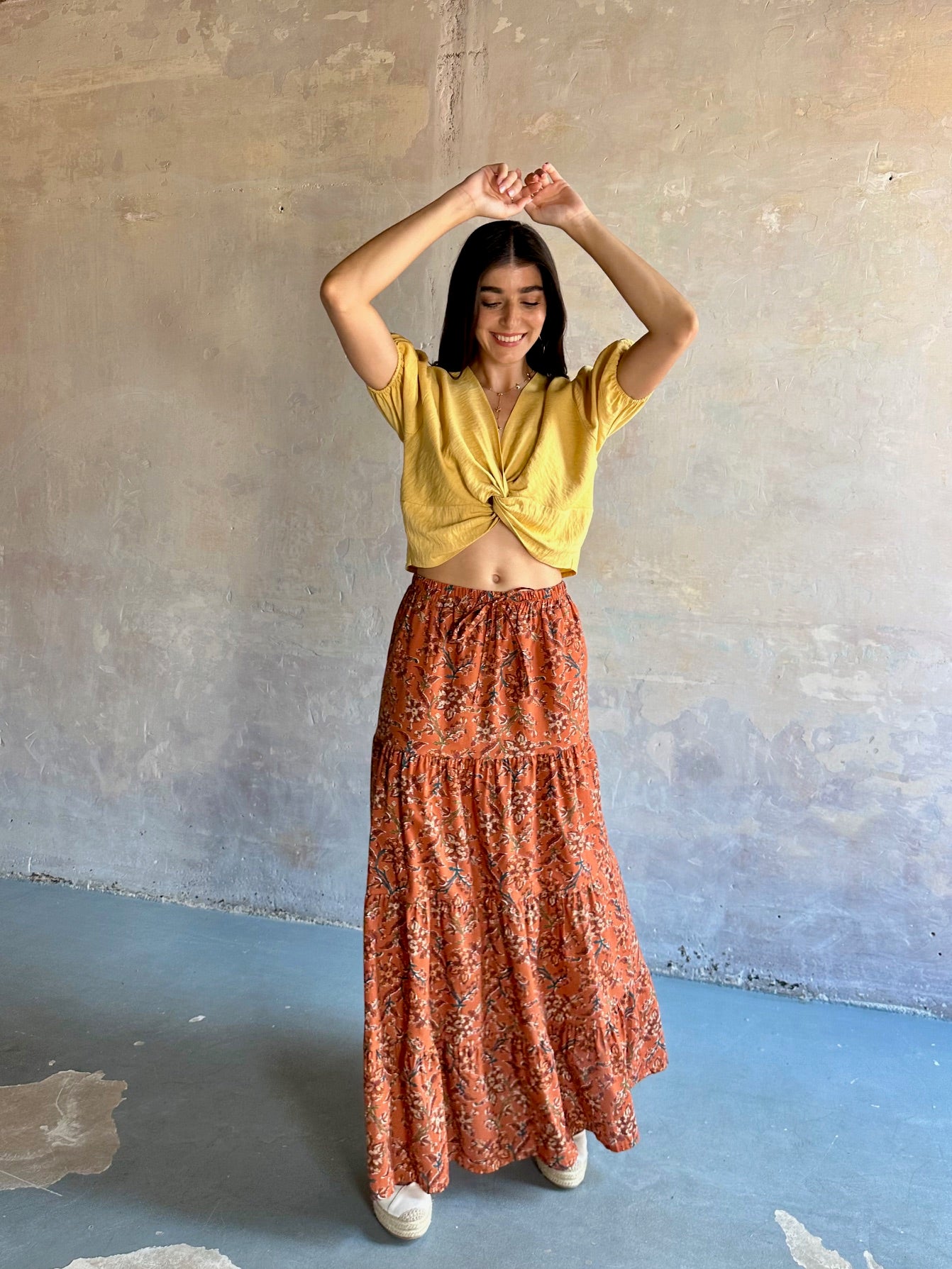 Falda larga, con goma en cintura ajustable. Bajo acabado en volantes.