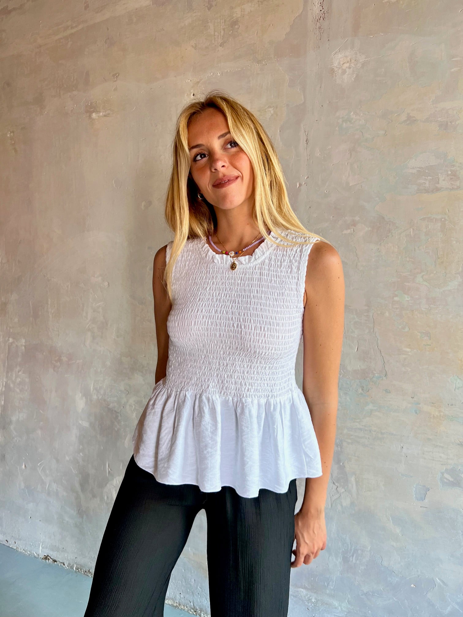 Top fruncido, nido de abeja, acabado en volante. Cuello redondo y sin mangas.
