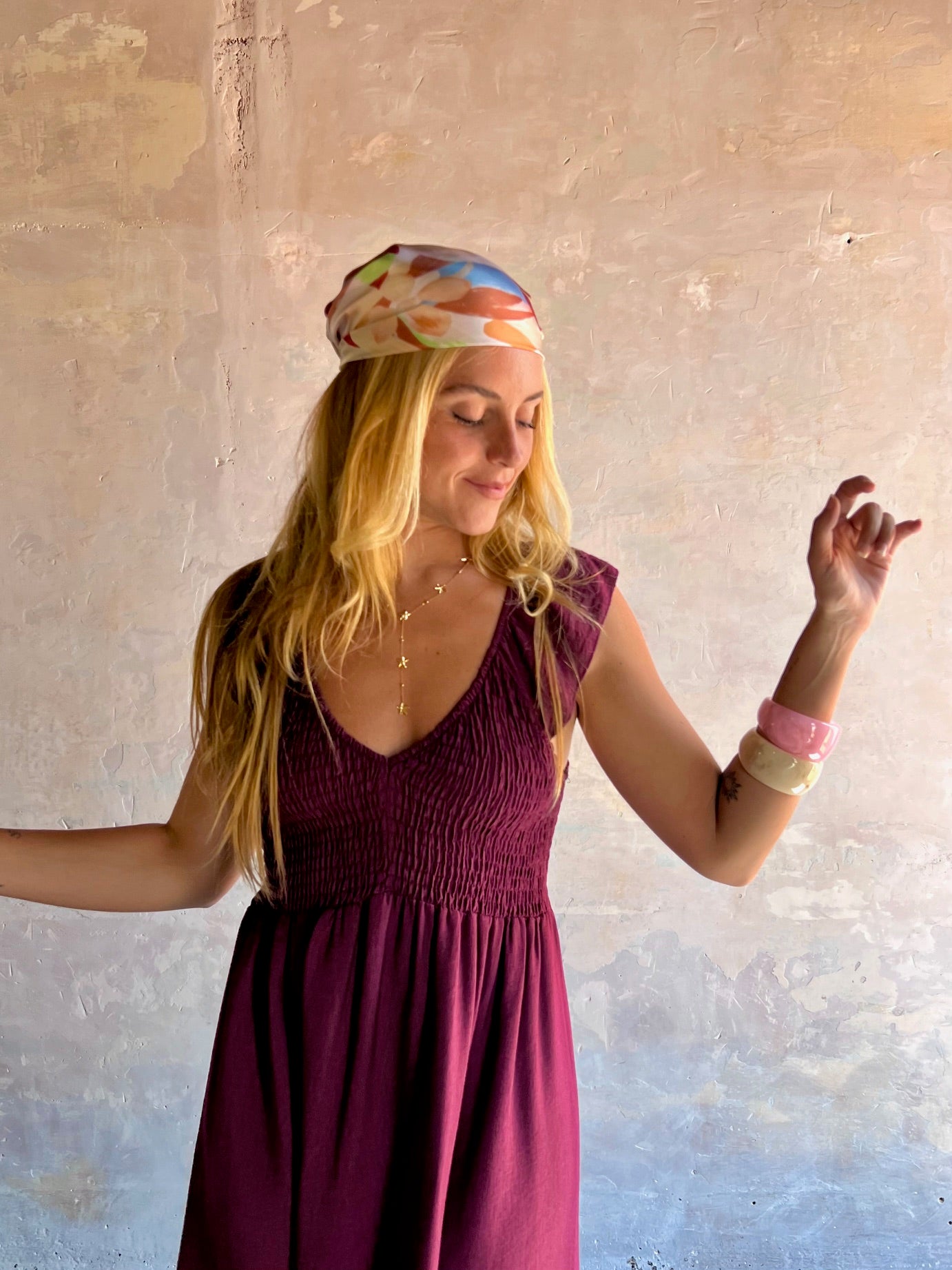 Vestido de corte midi con escote pico y fruncido en la parte superior.