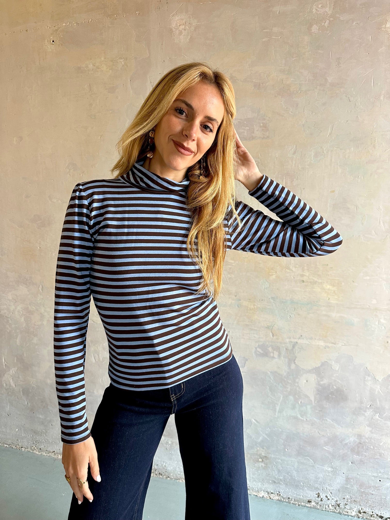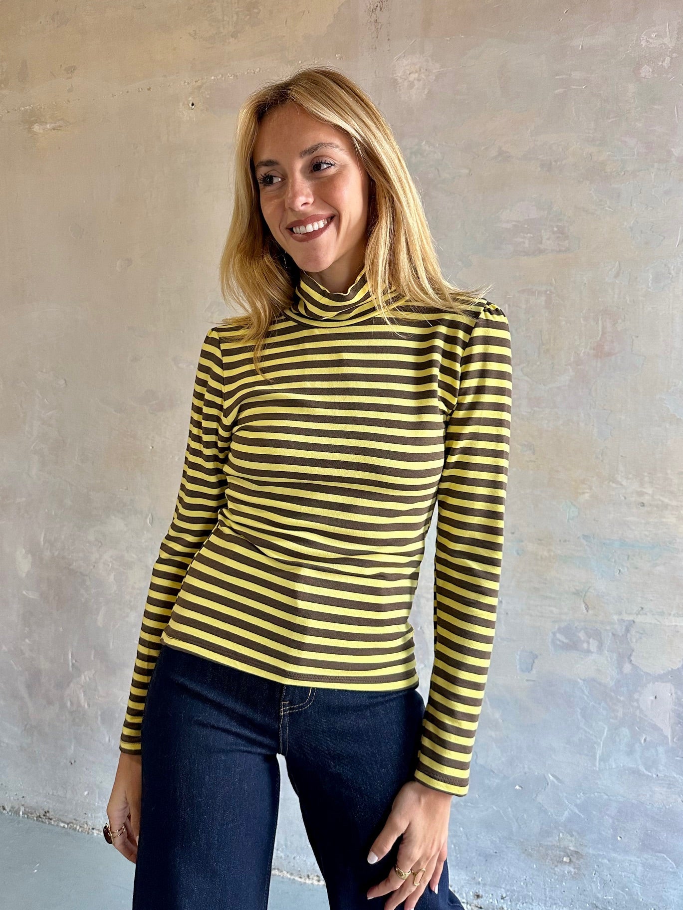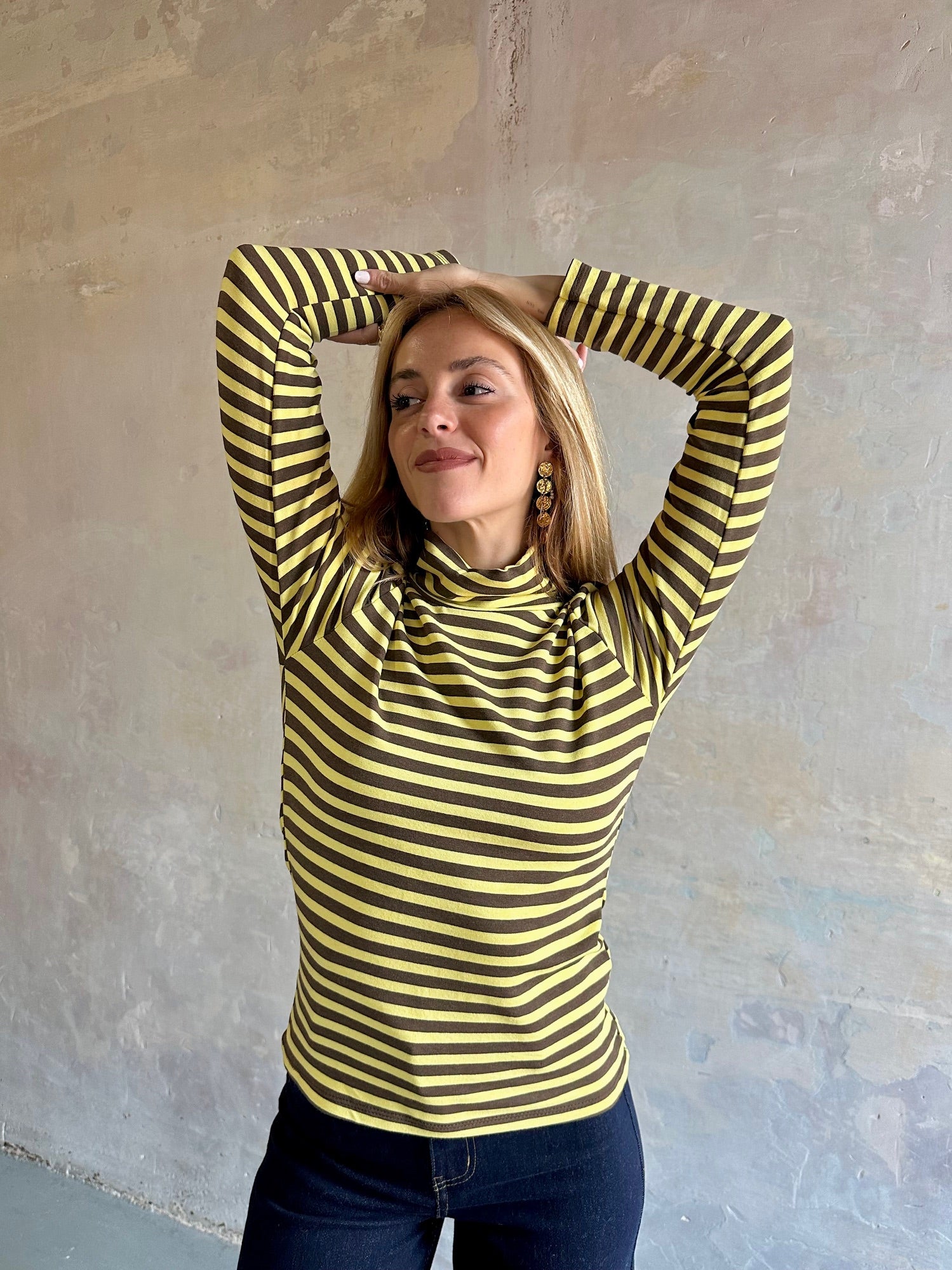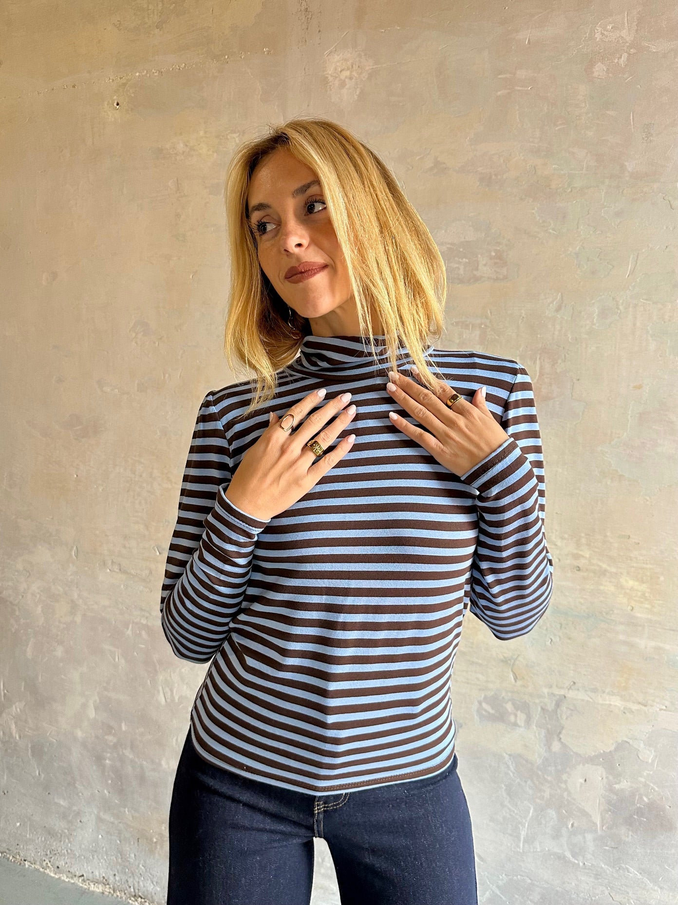 Camiseta de cuello alto con rayas a contraste en oscuro. De manga larga y un ligero fruncido que aporta estructura.