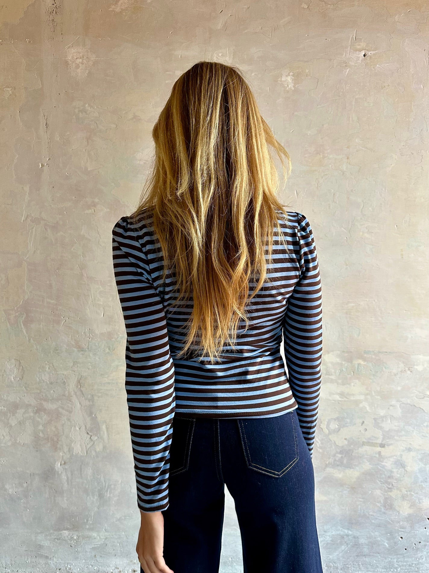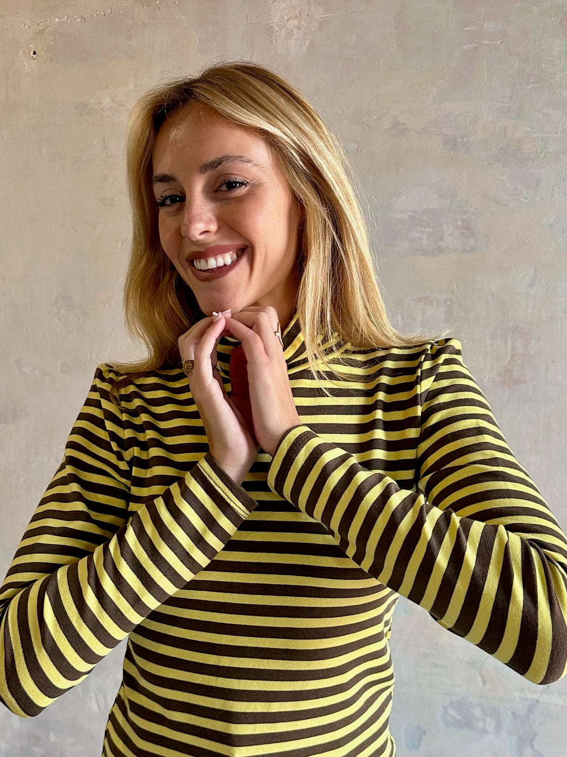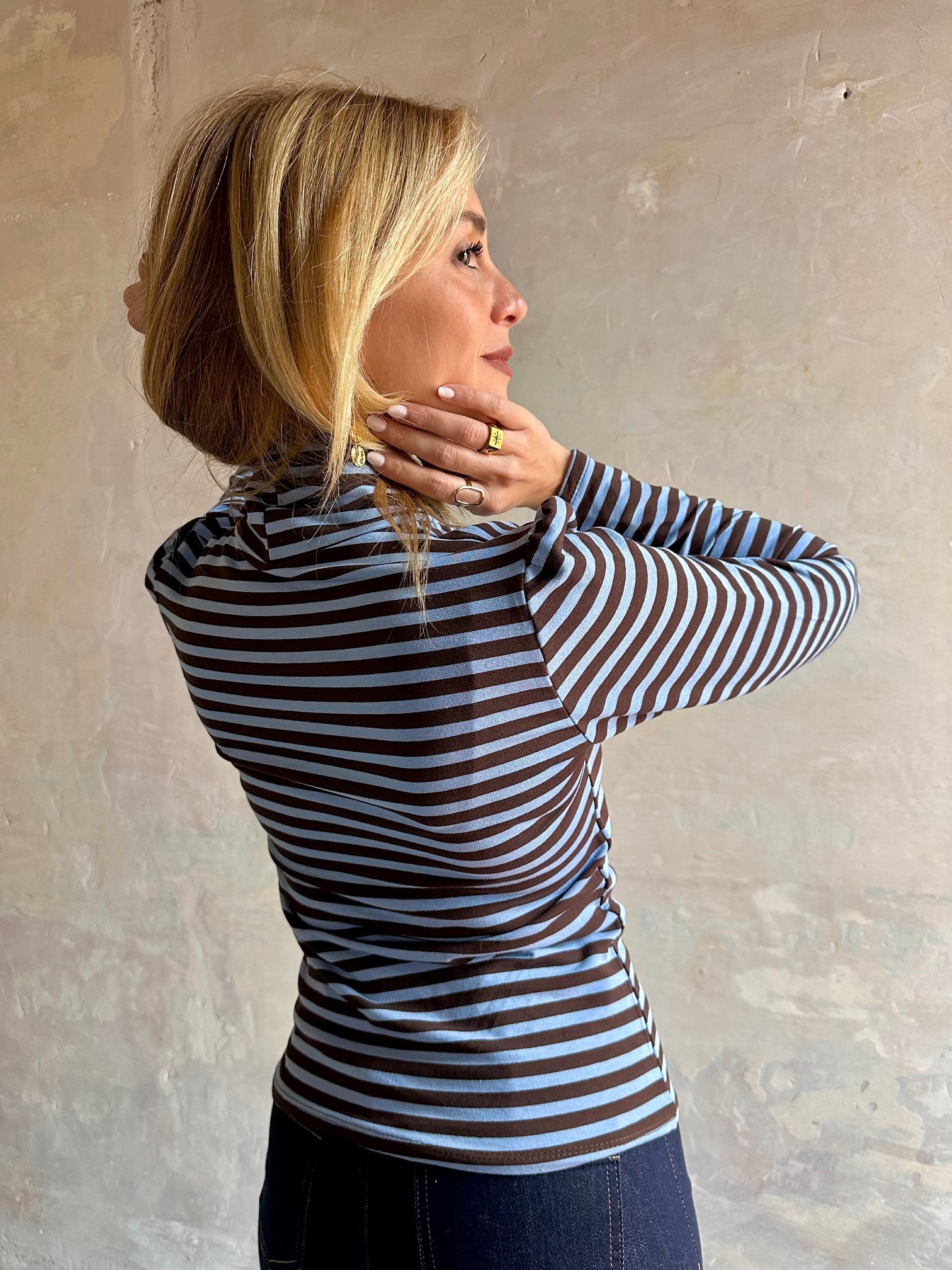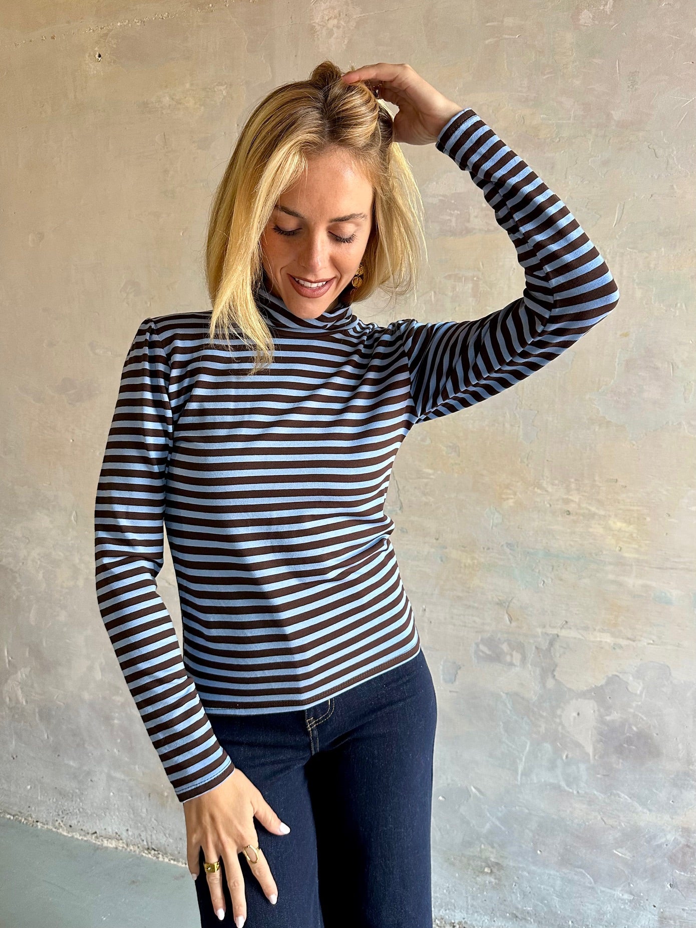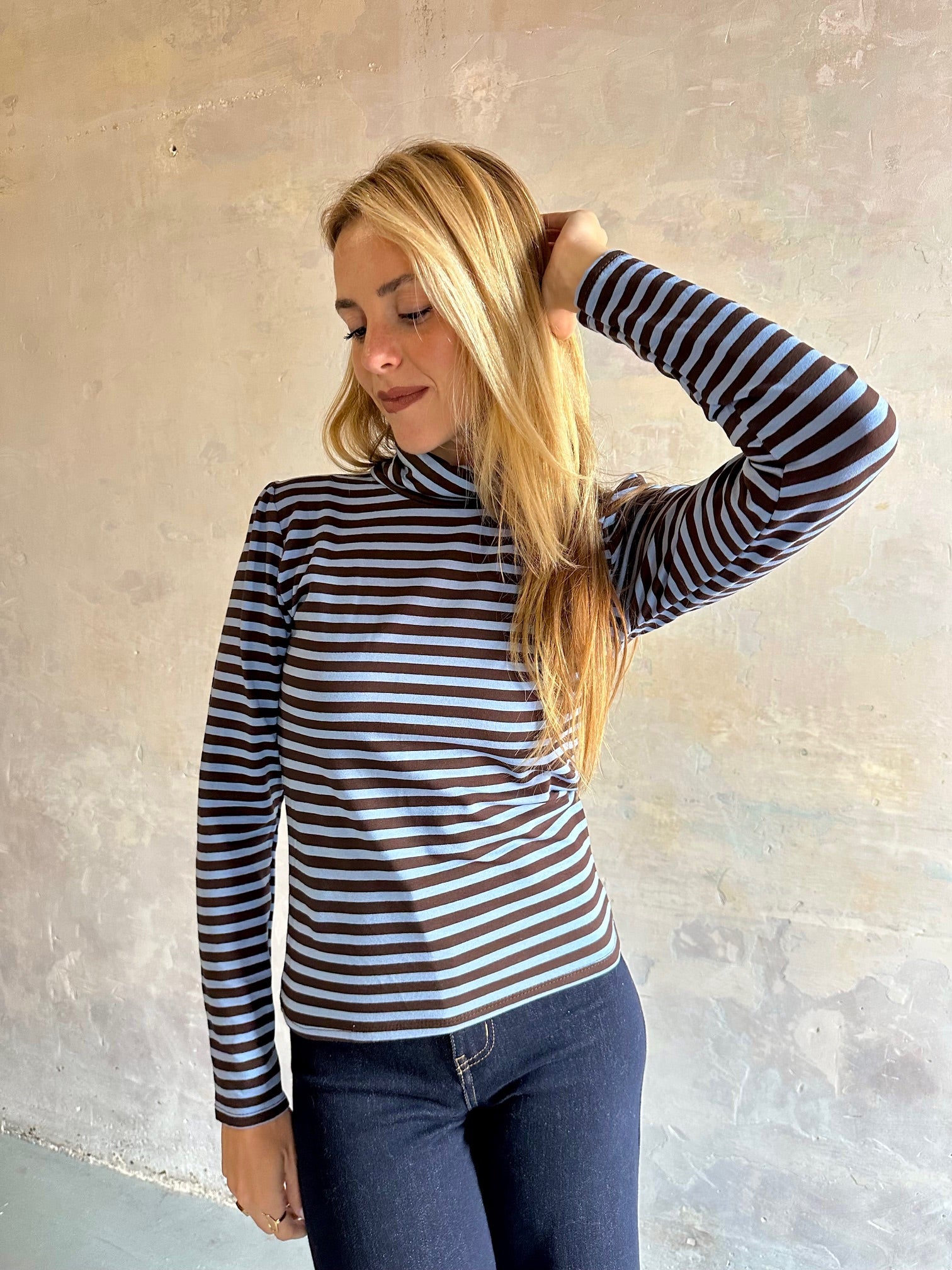 Camiseta de cuello alto con rayas a contraste en oscuro. De manga larga y un ligero fruncido que aporta estructura.