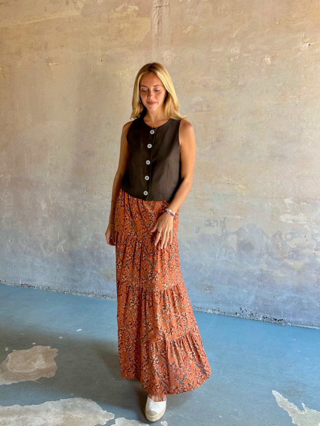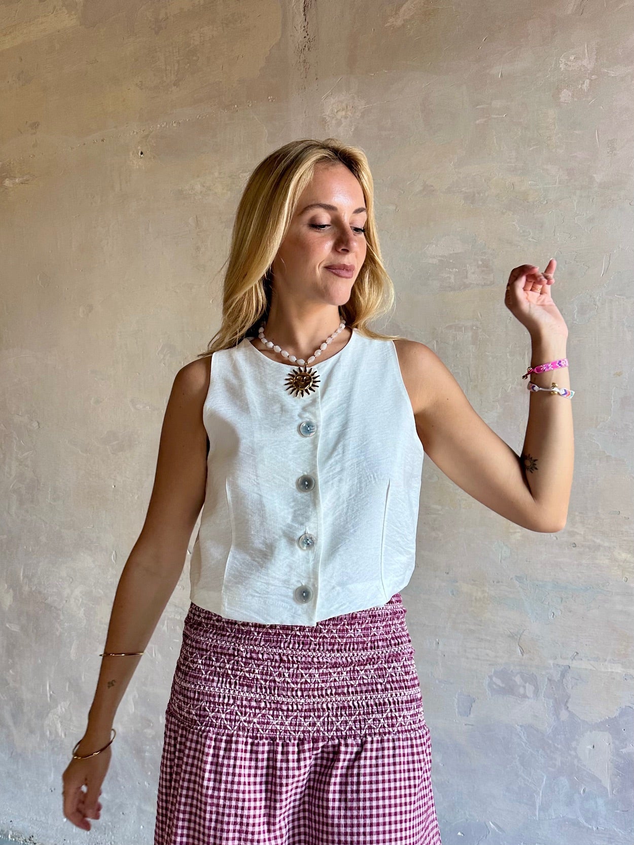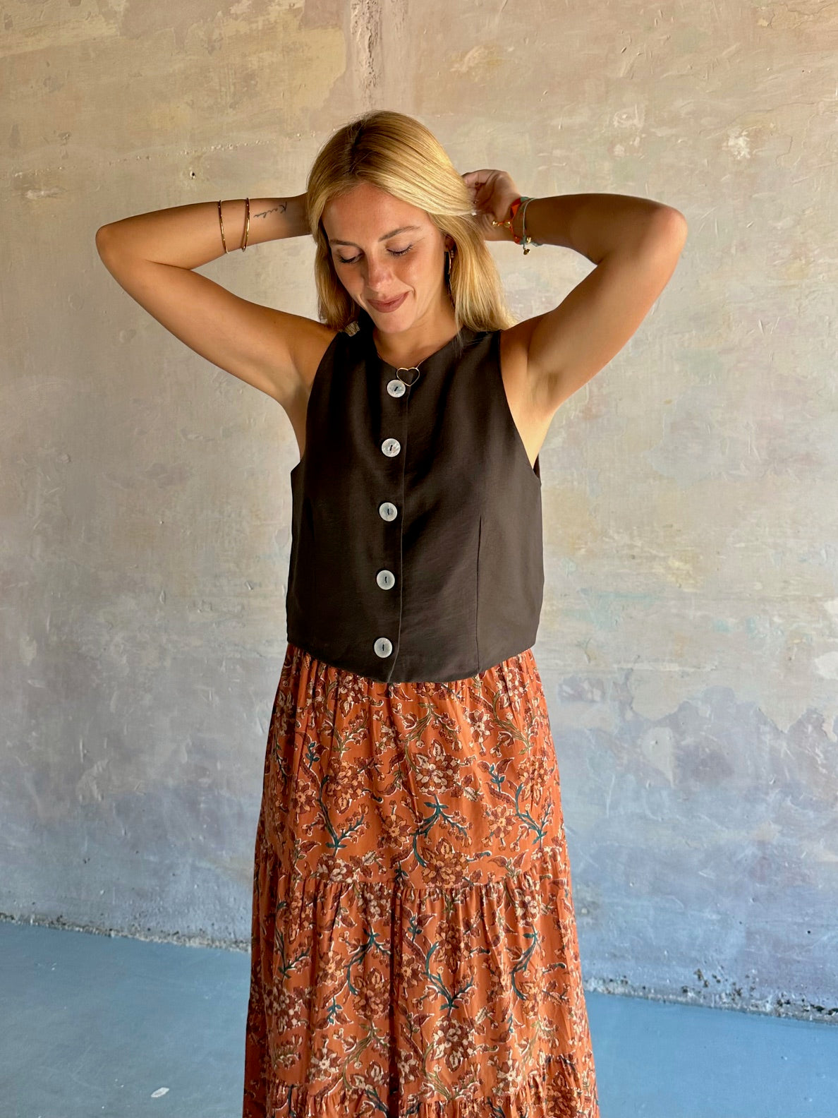 Chaleco de cuello redondo y manga sisa. Cierre frontal con botones.