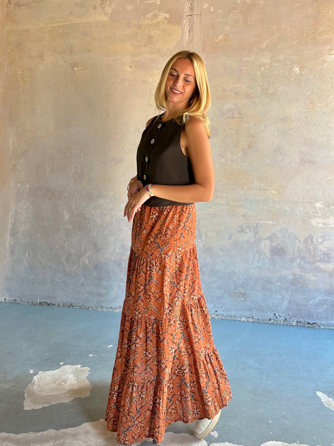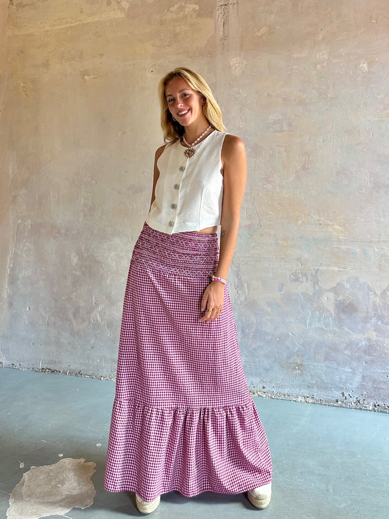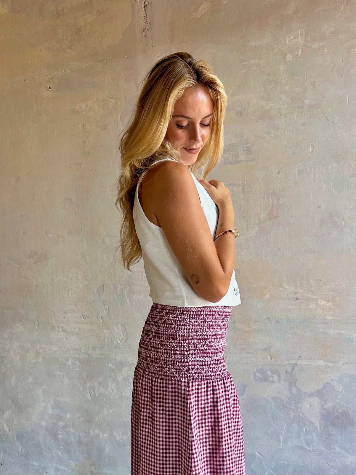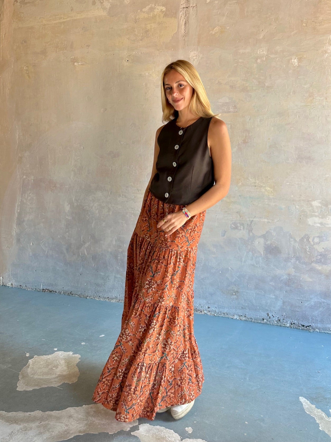 Chaleco de cuello redondo y manga sisa. Cierre frontal con botones.