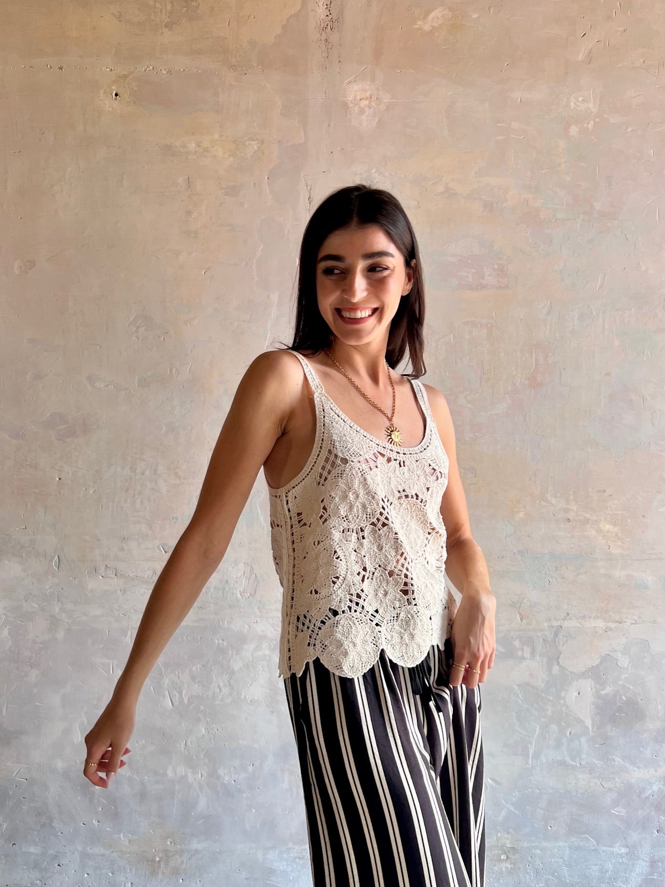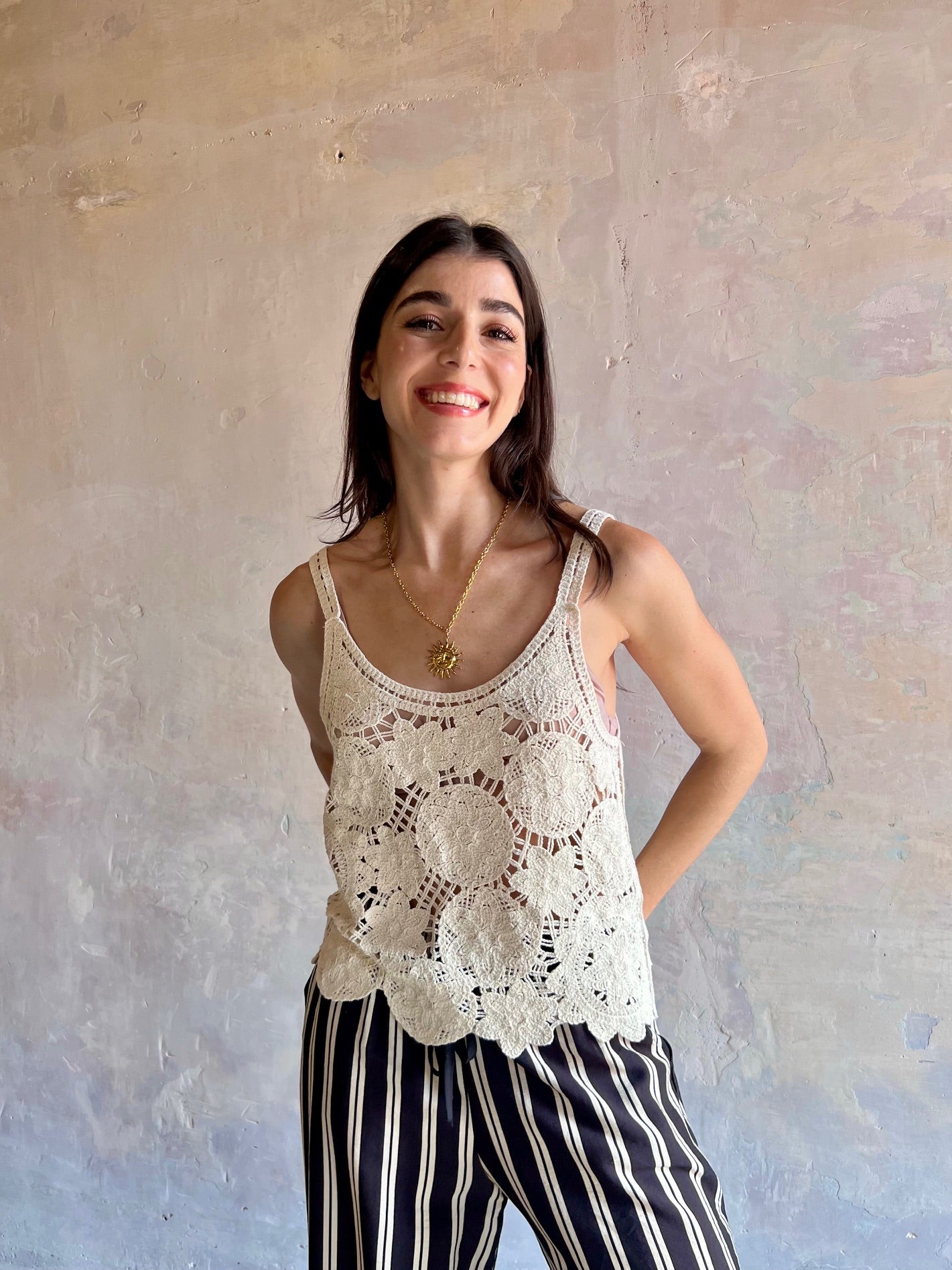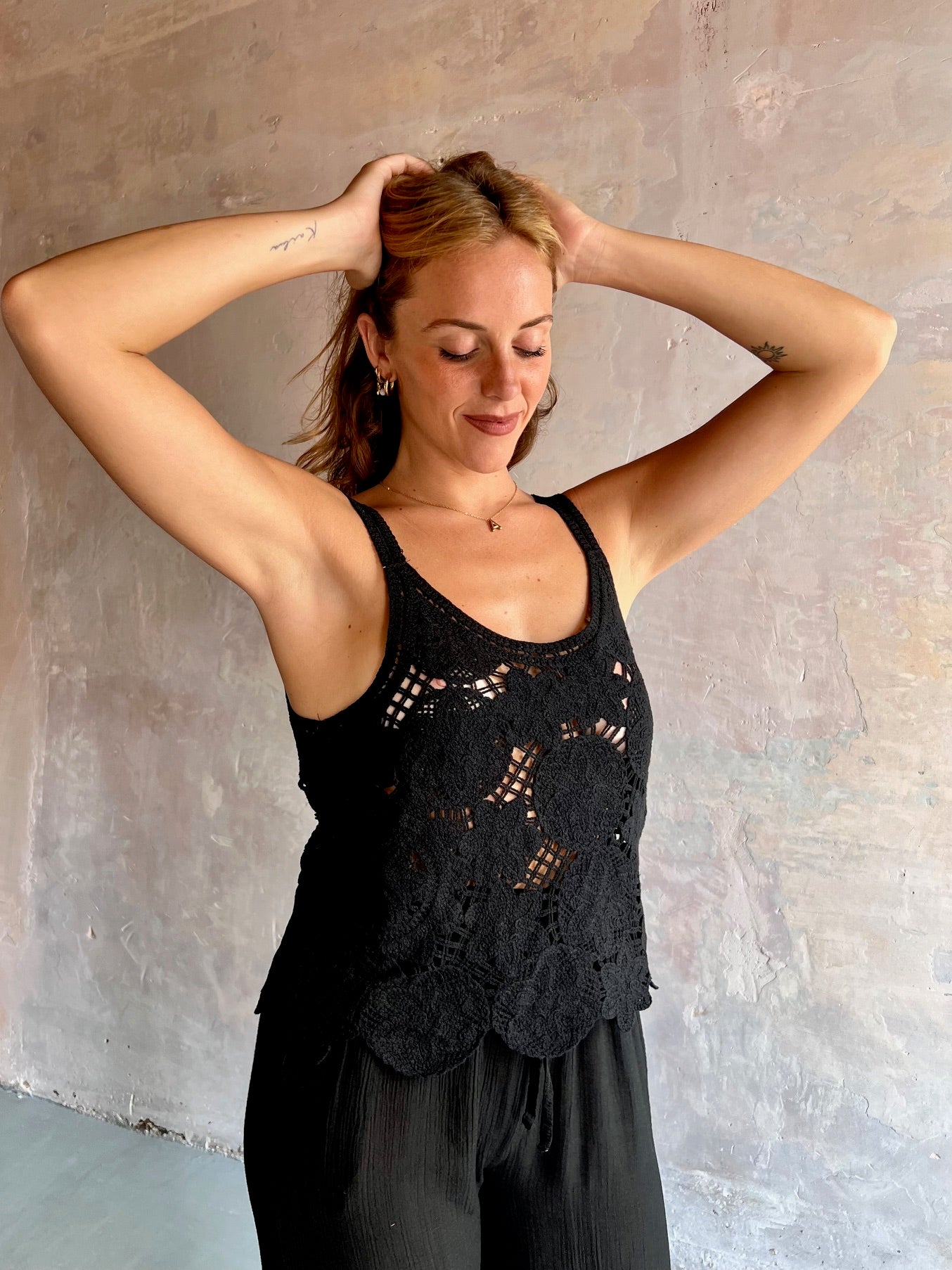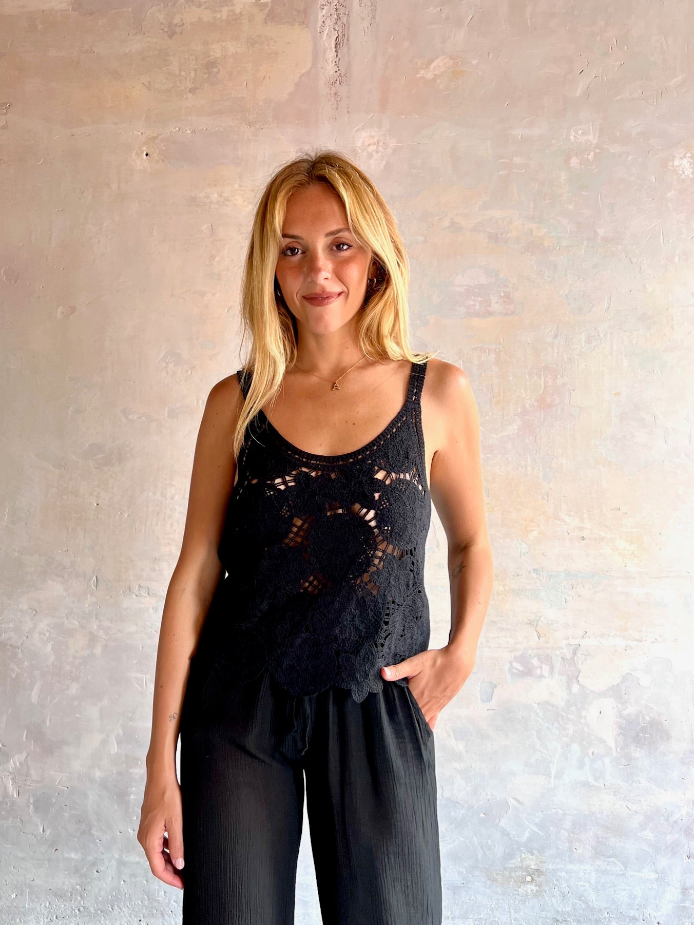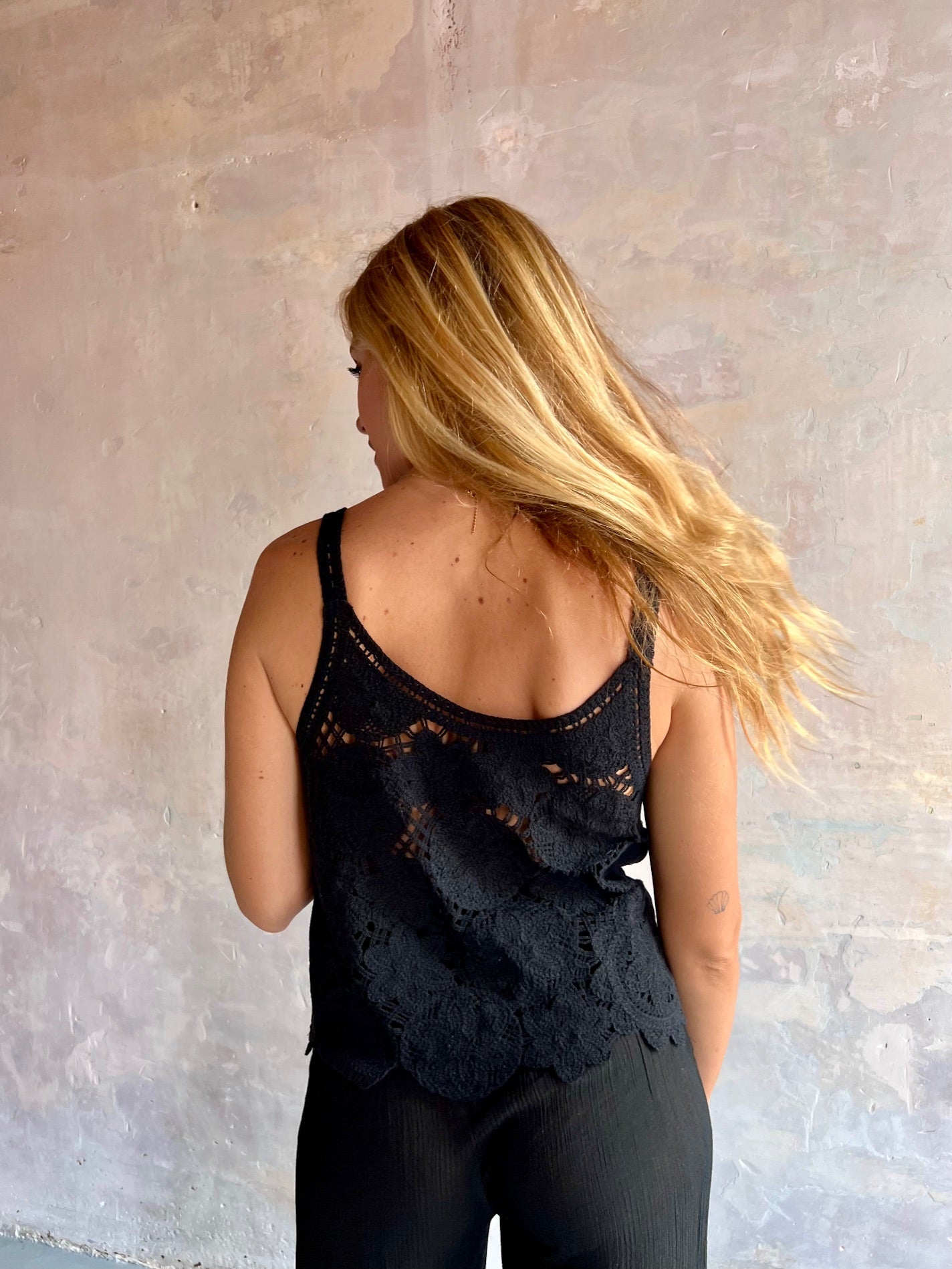 Top crochet de color negro y tirantes finos. Escote redondeado.