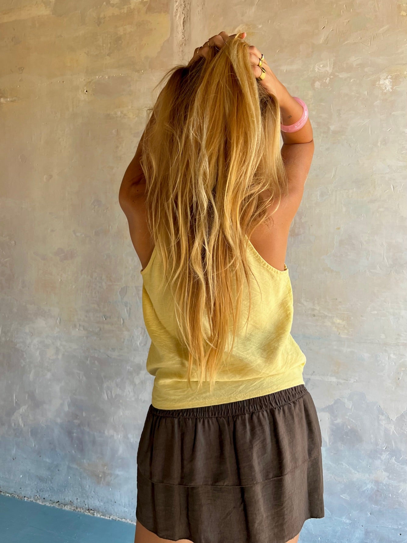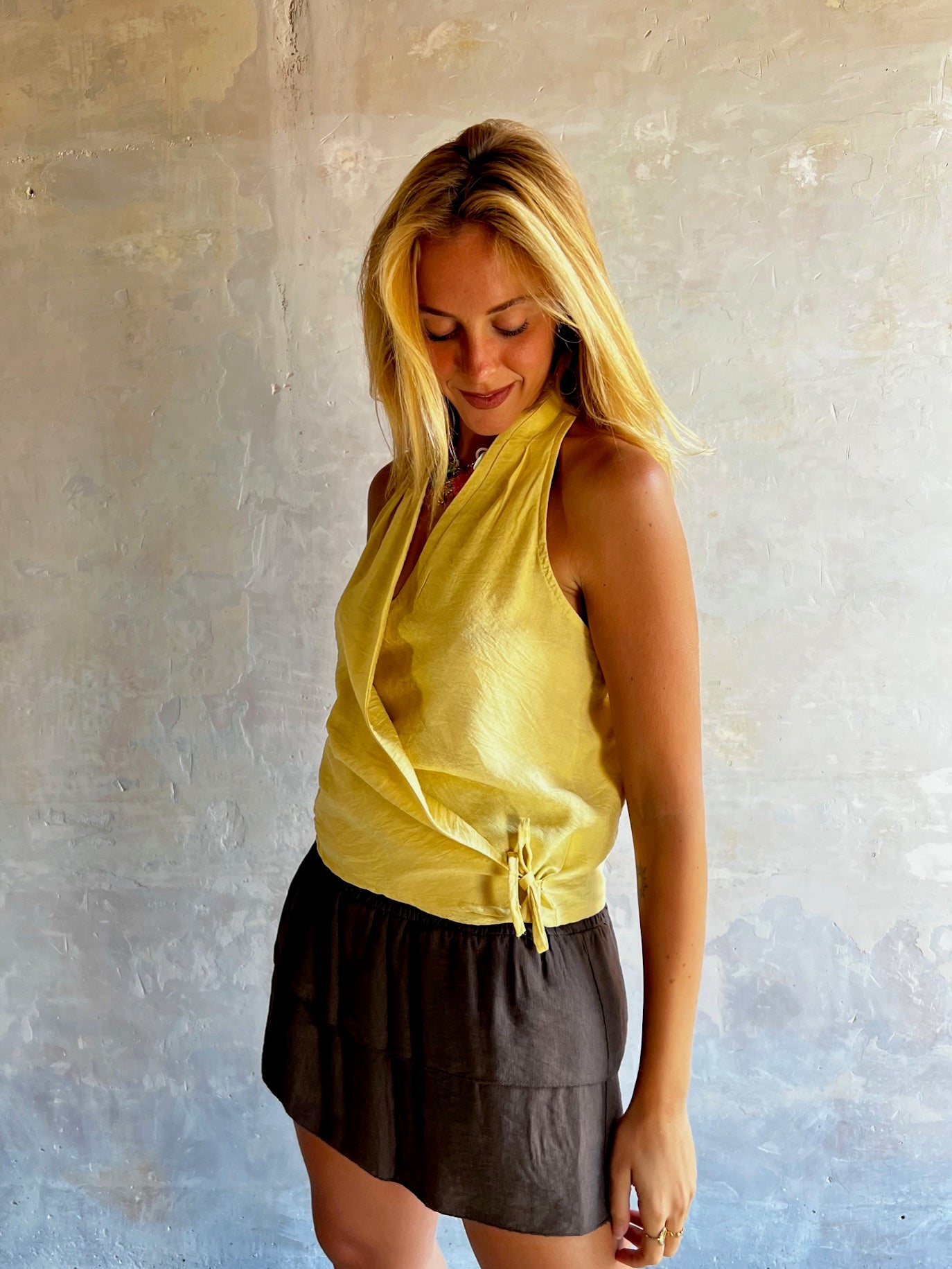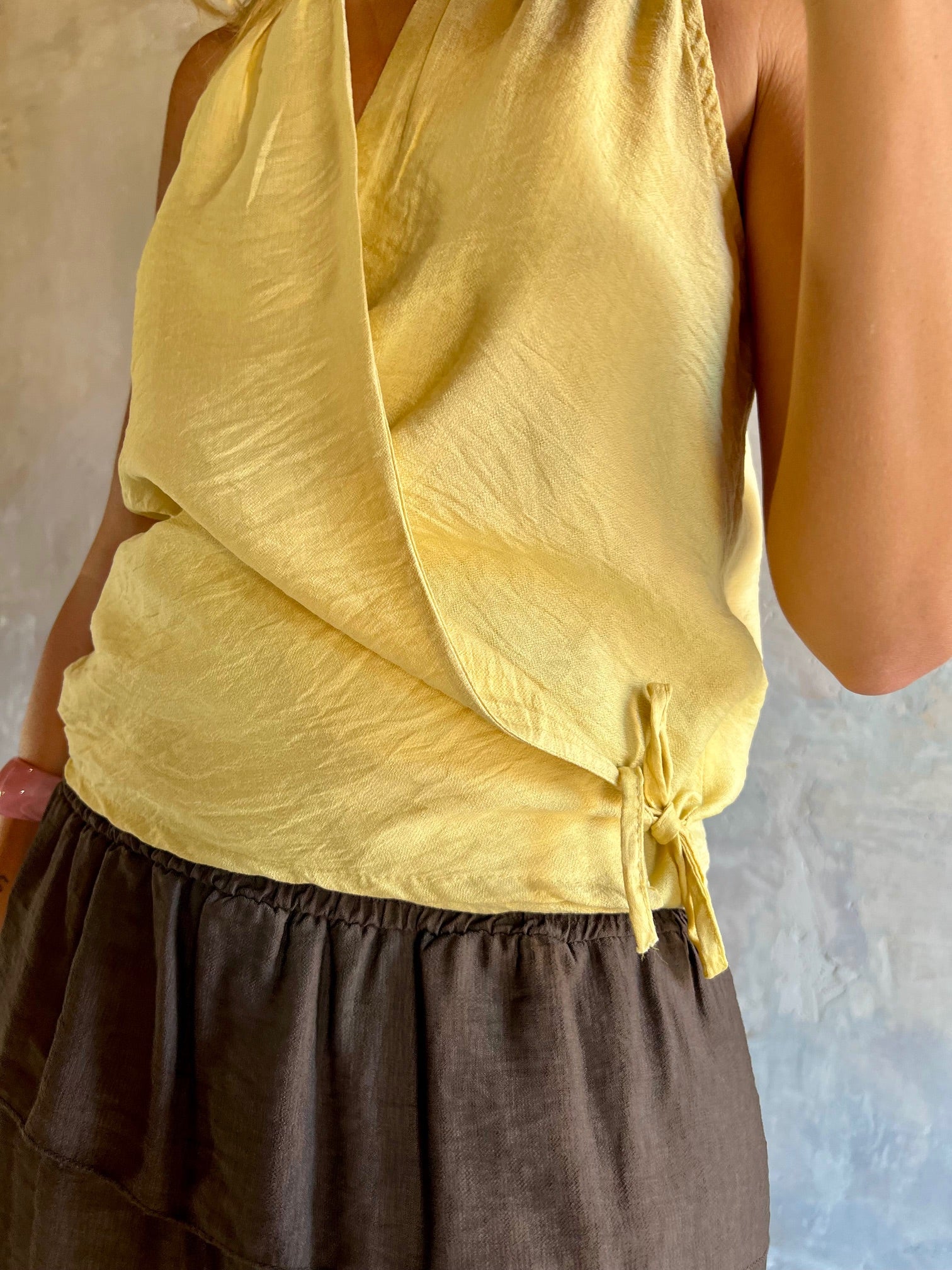 Top fluido de escote pico y sin mangas. Cierre frontal cruzado con lazada lateral.