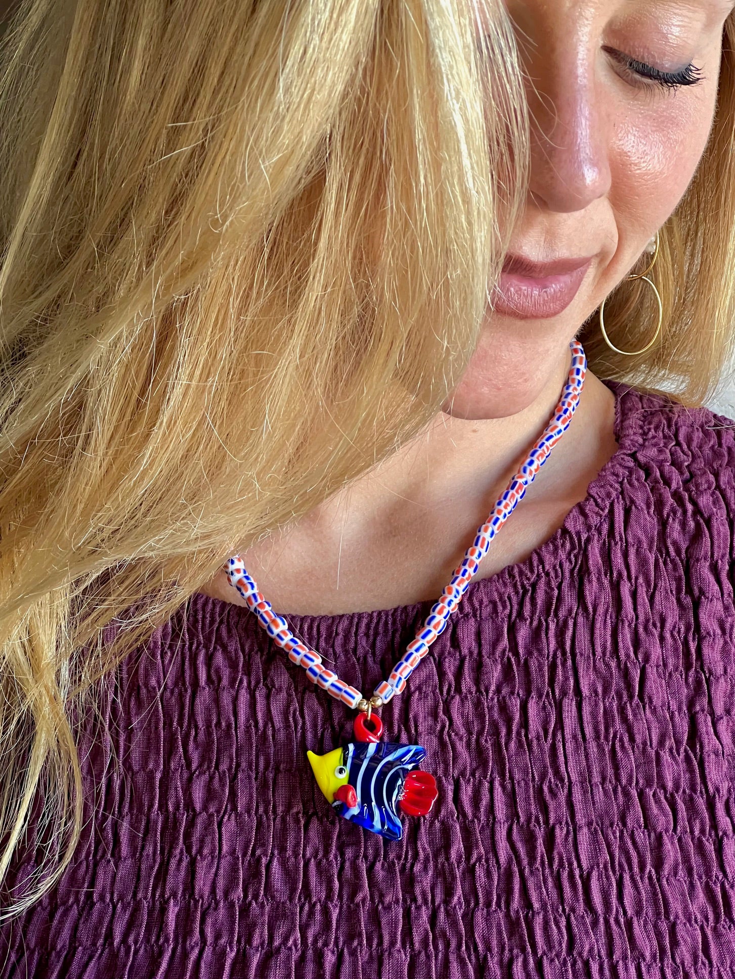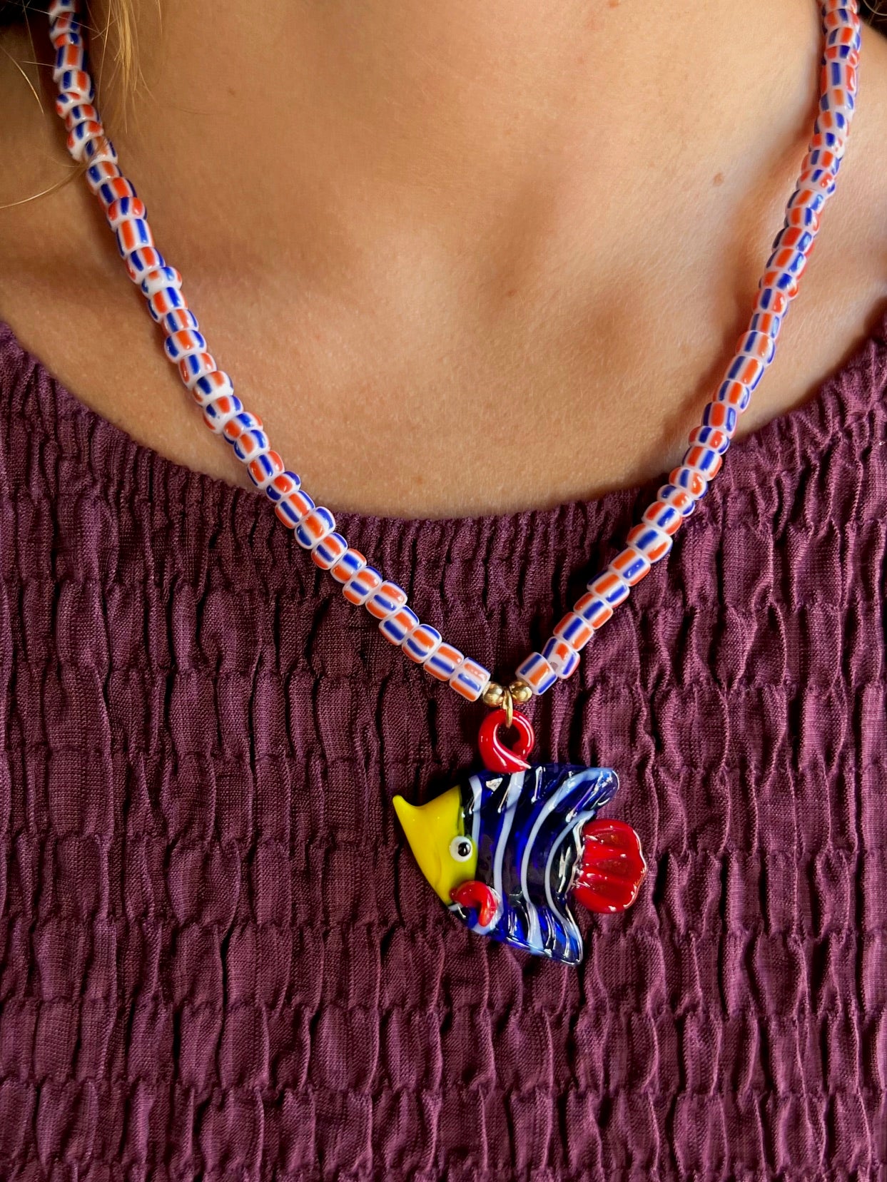 Collar de bolas de cristal y detalle de colgante en forma de pez.