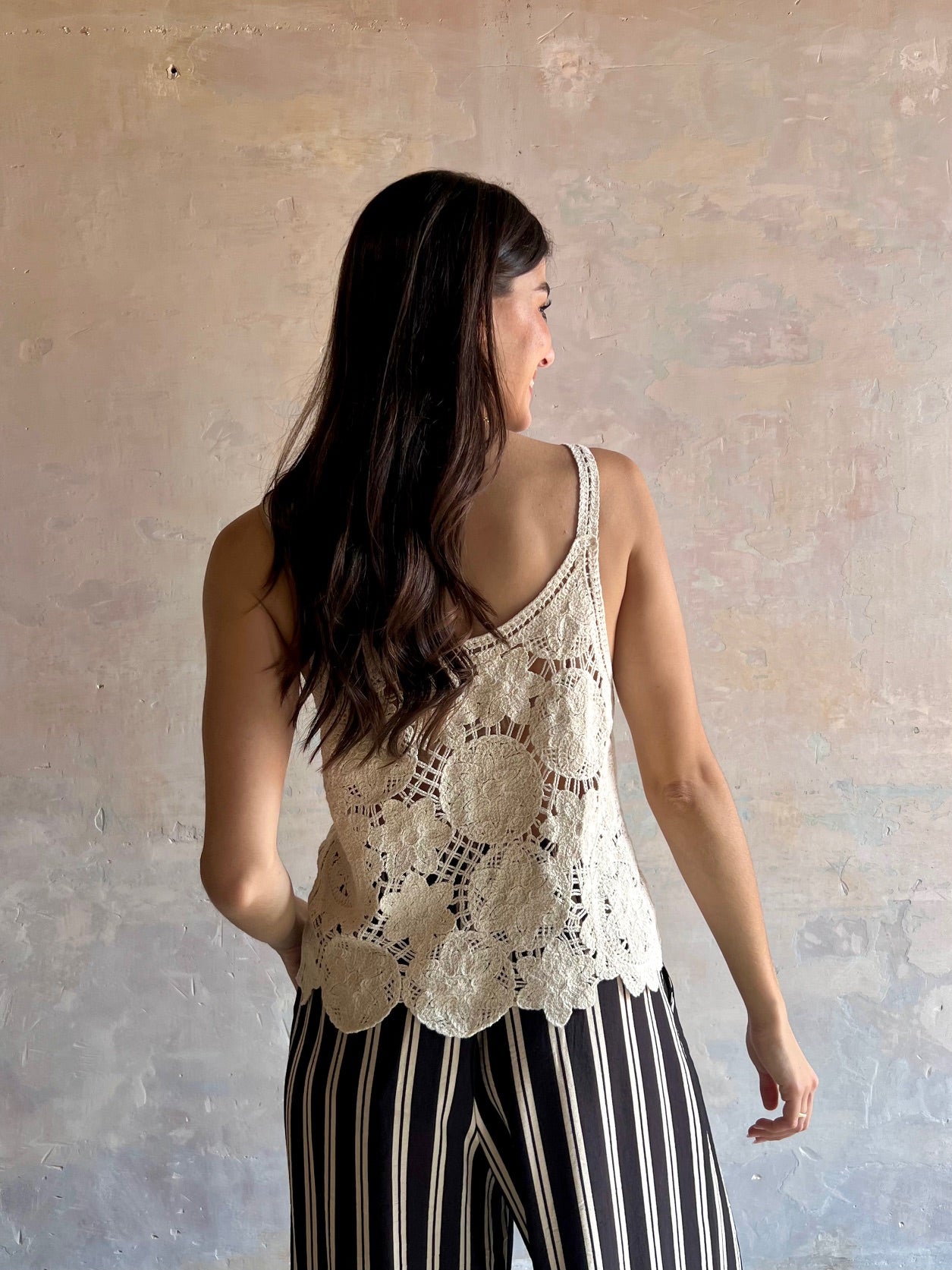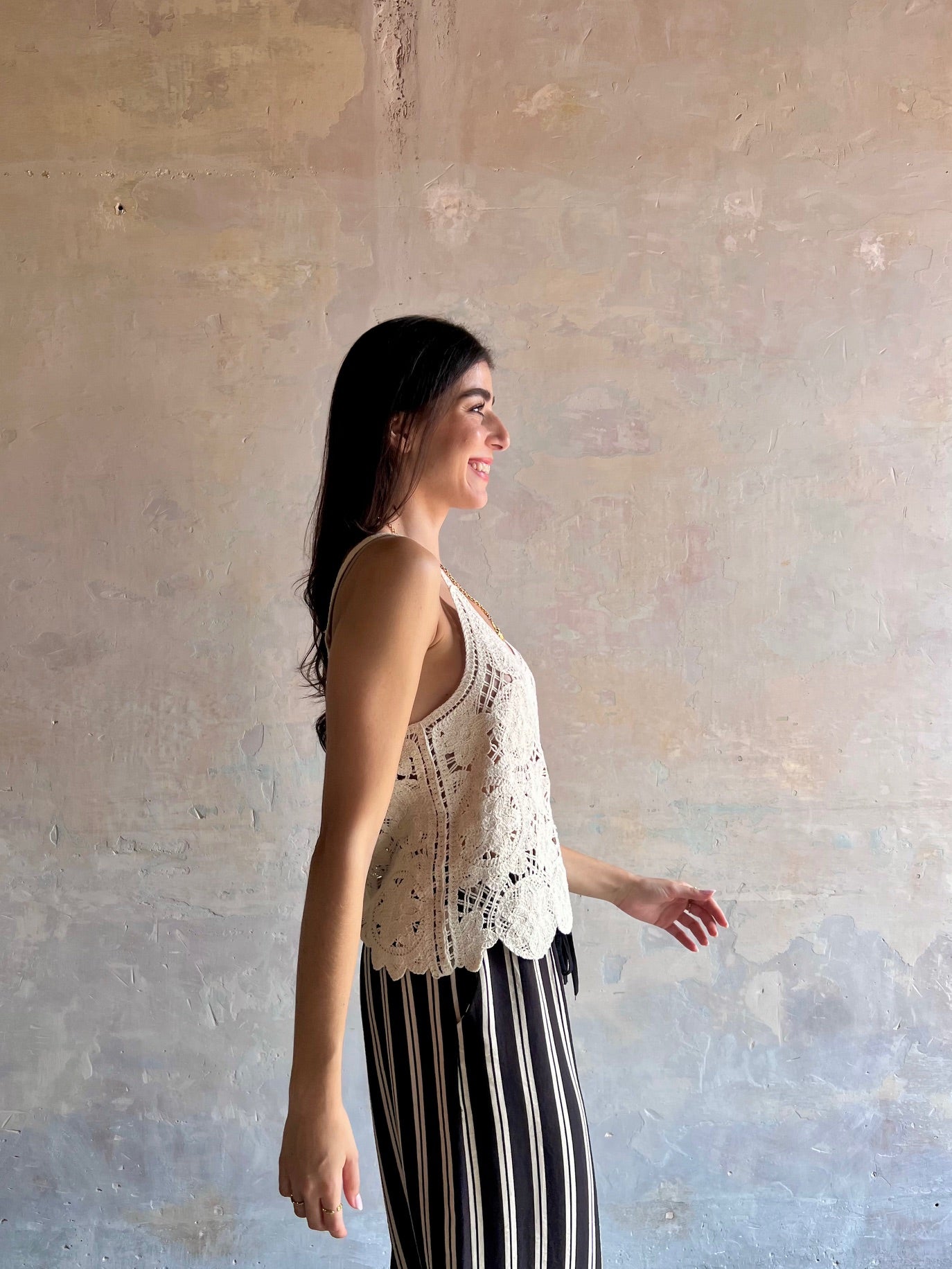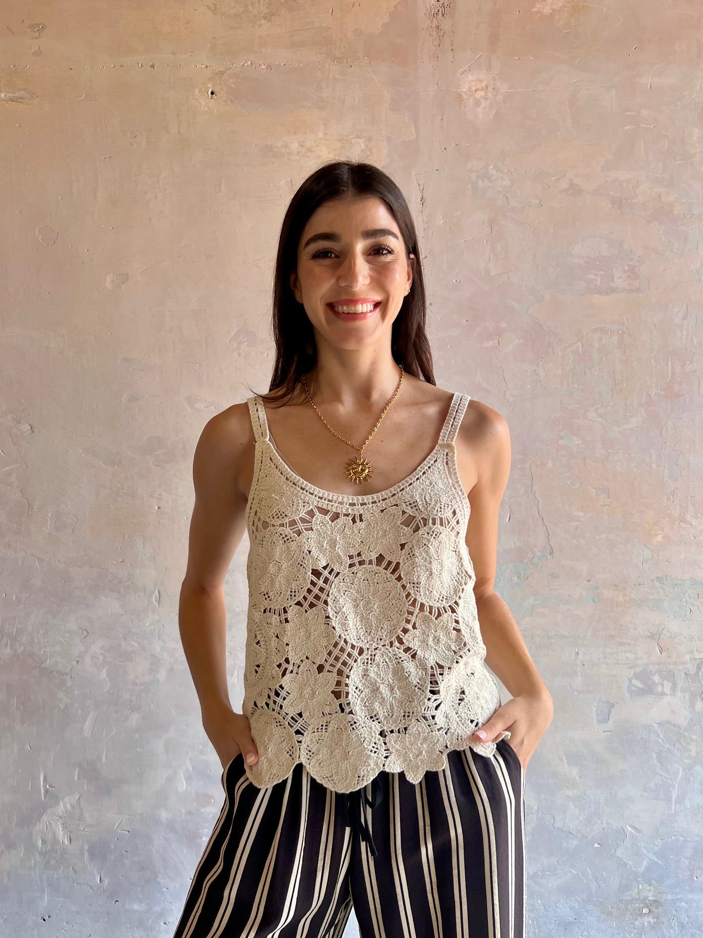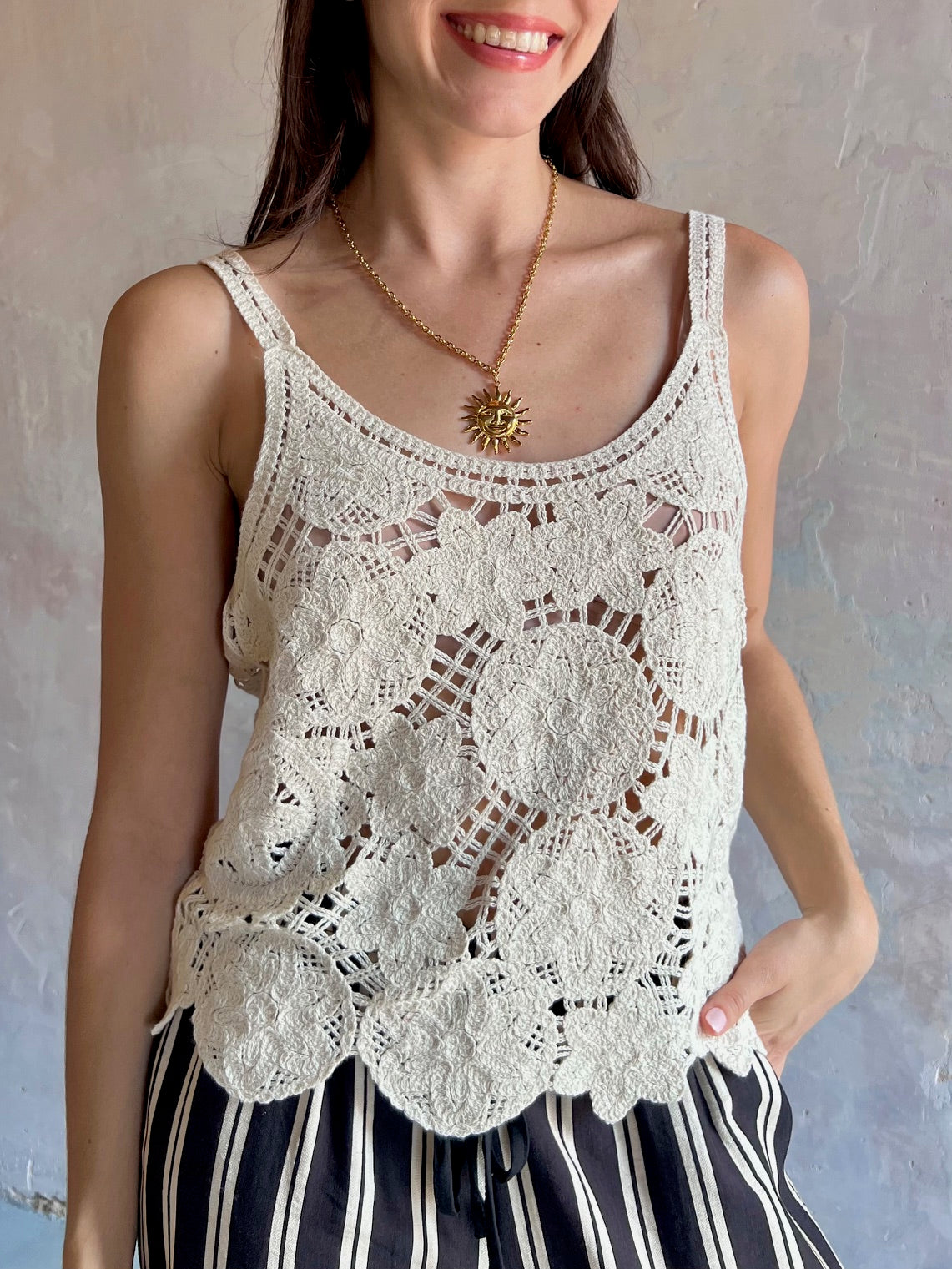Top crochet de color negro y tirantes finos. Escote redondeado.