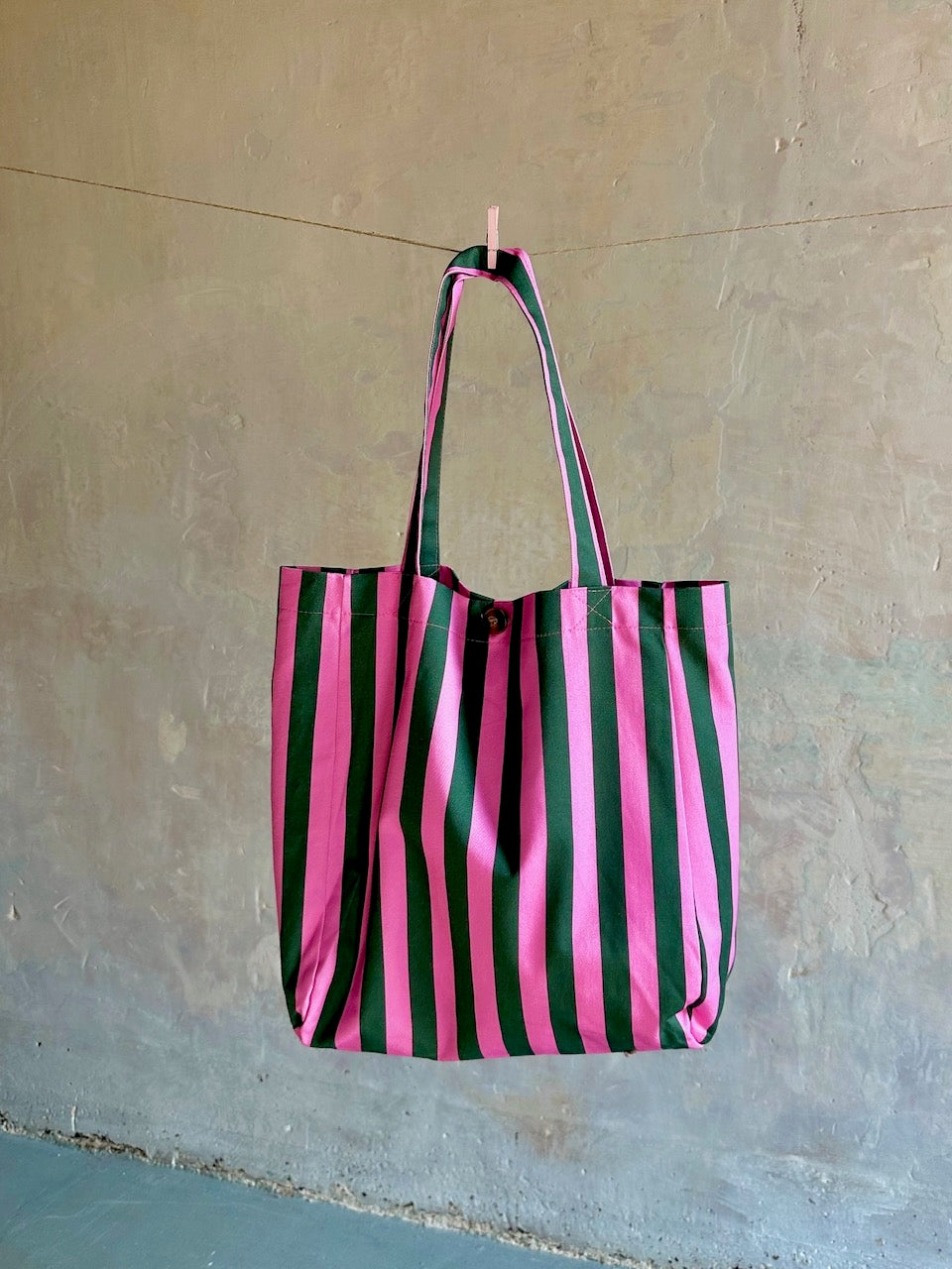 Bolsa de tela con asas largas y cierre mediante botón. Bolsillo interior.