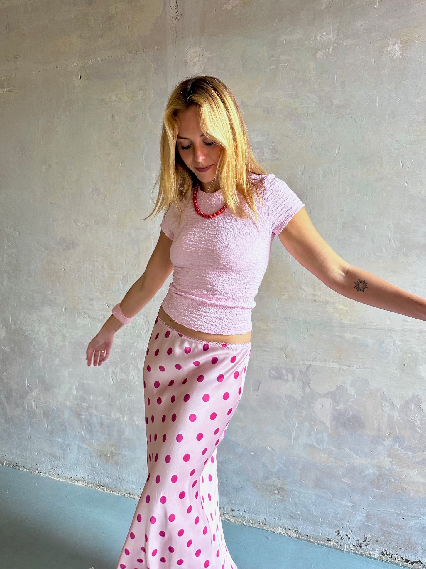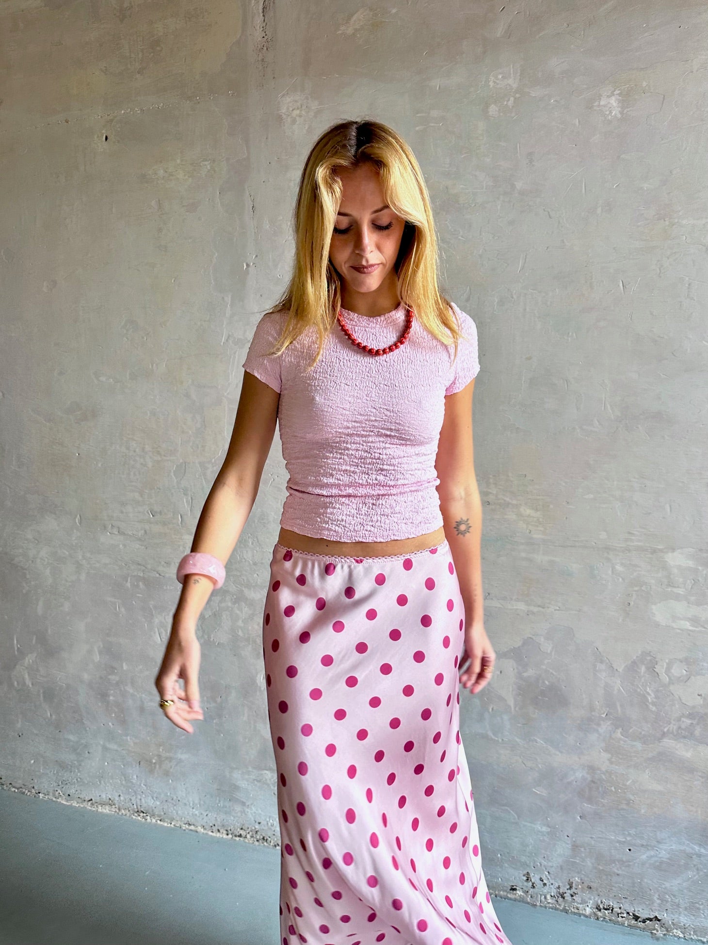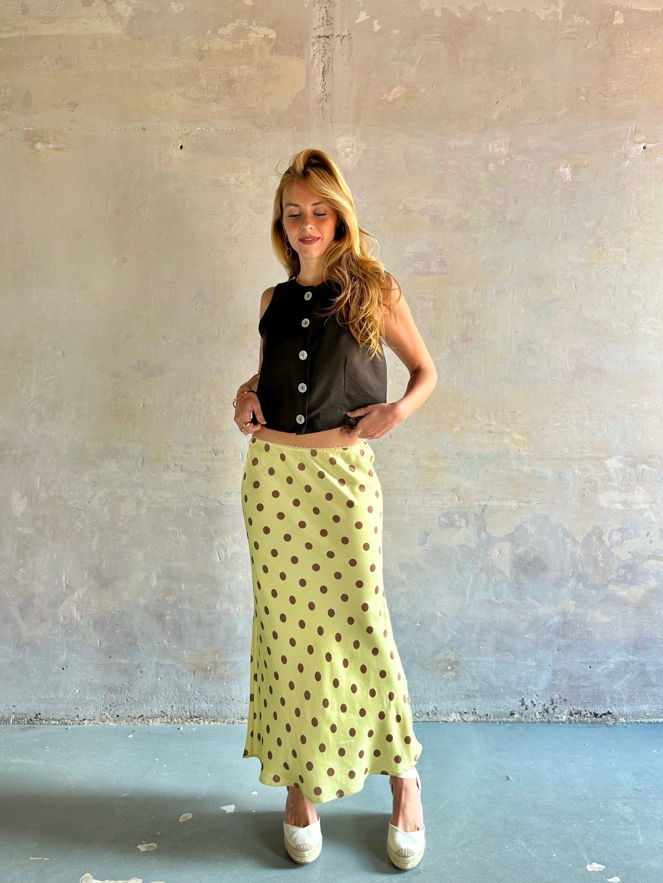 Falda midi fluida de tiro medio con topos.