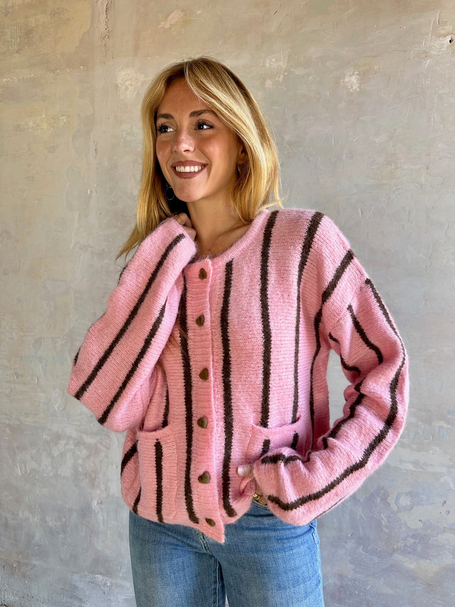 Chaqueta de punto con rayas verticales, cuello redondo y manga larga. Cierre frontal con botones en forma de corazón, aportando un aire "coquette". Dos bolsillos frontales integrados en el diseño.
