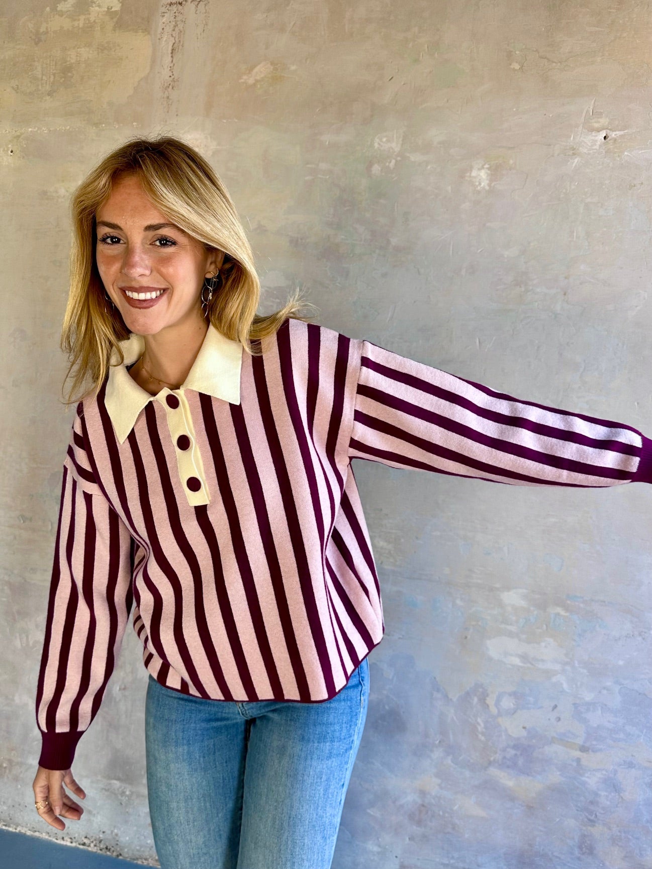 Jersey polo de punto con cuello pico con solapa. Su diseño de rayas verticales en contraste crea un efecto visual estilizado.