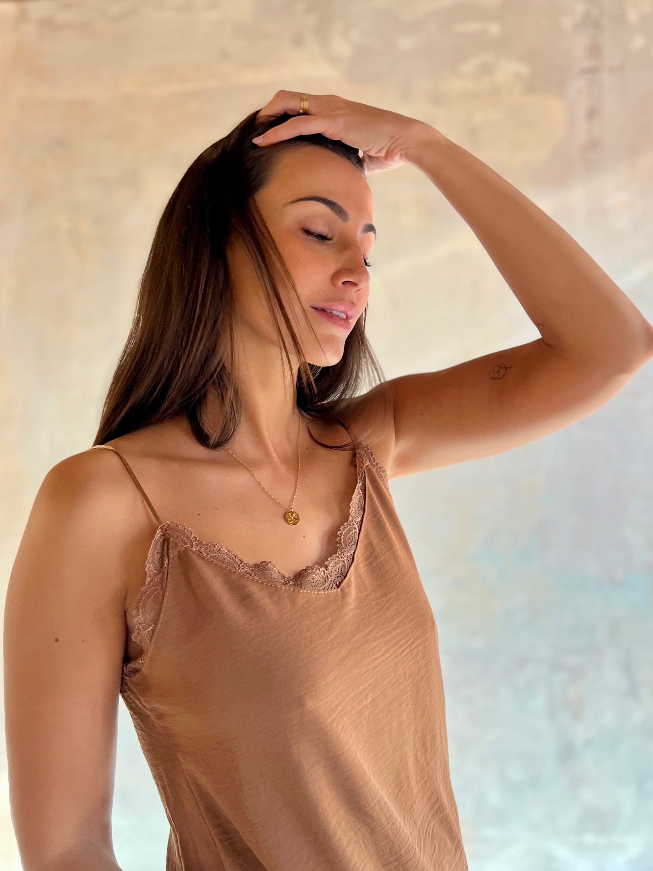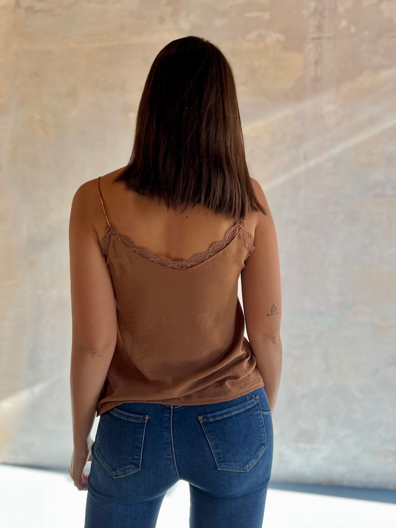 Top large et fluide, à encolure ronde avec empiècement en dentelle et fines bretelles.