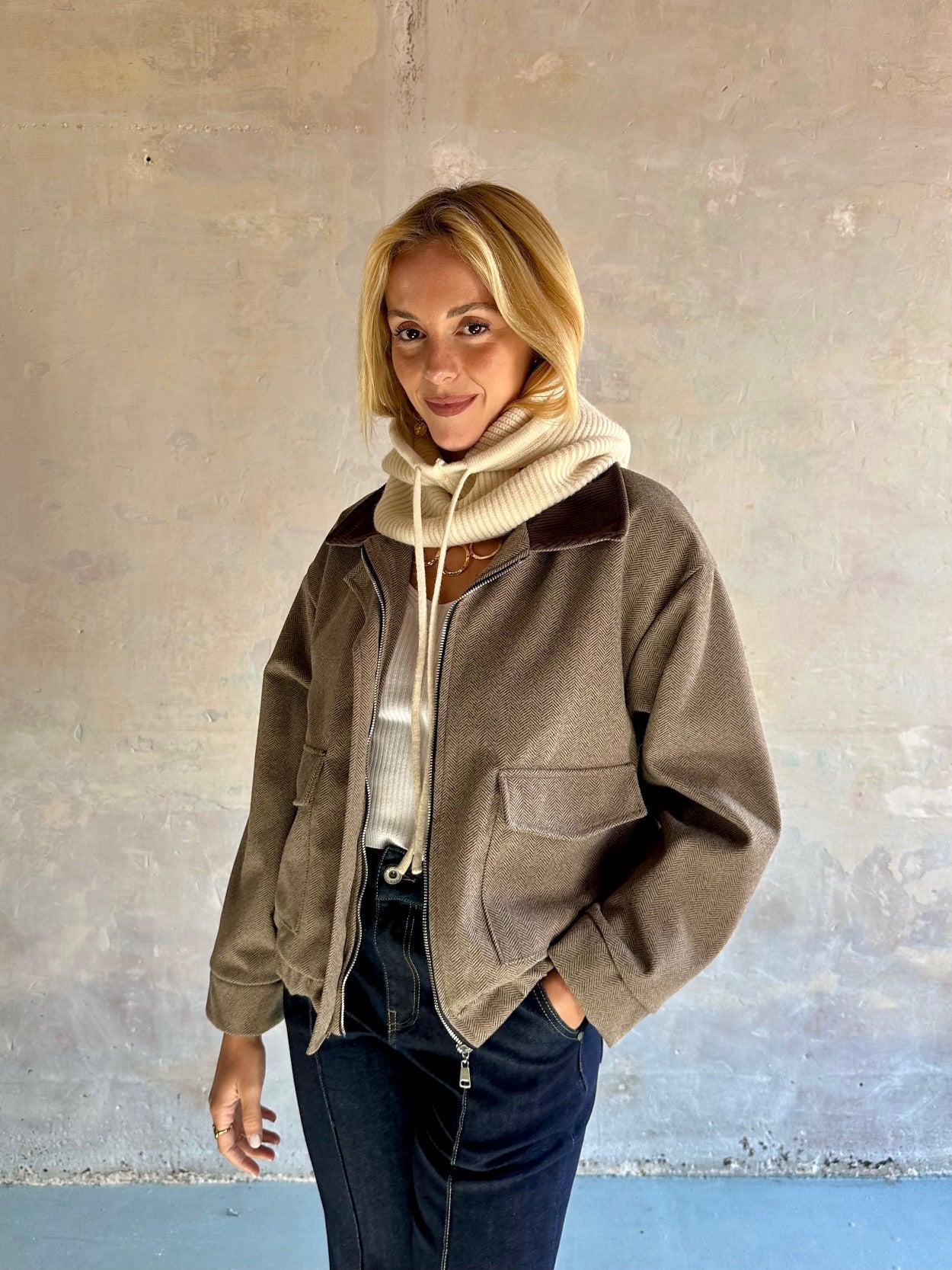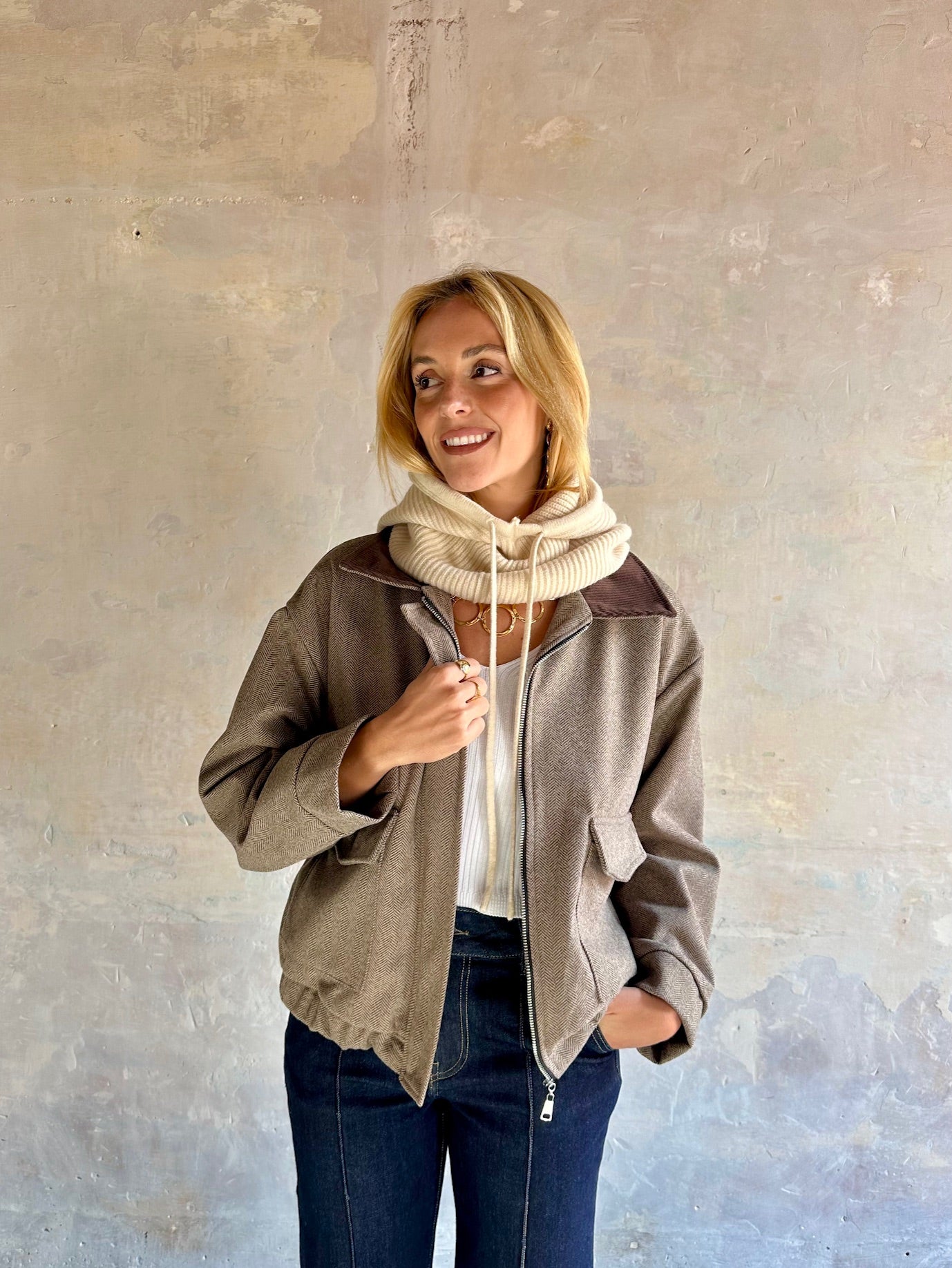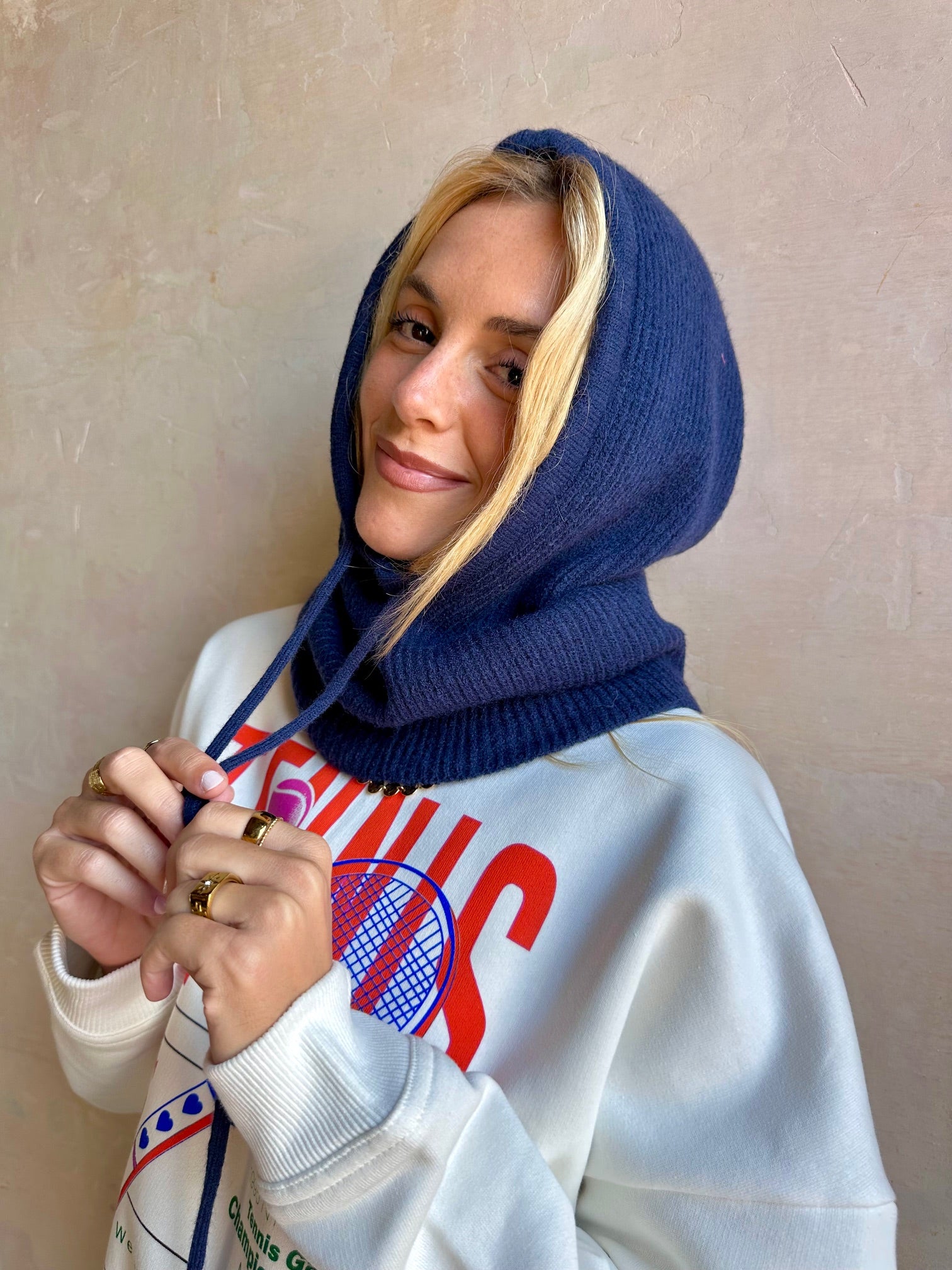 Capucha en punto suave de canalé con cordón ajustable delantero.