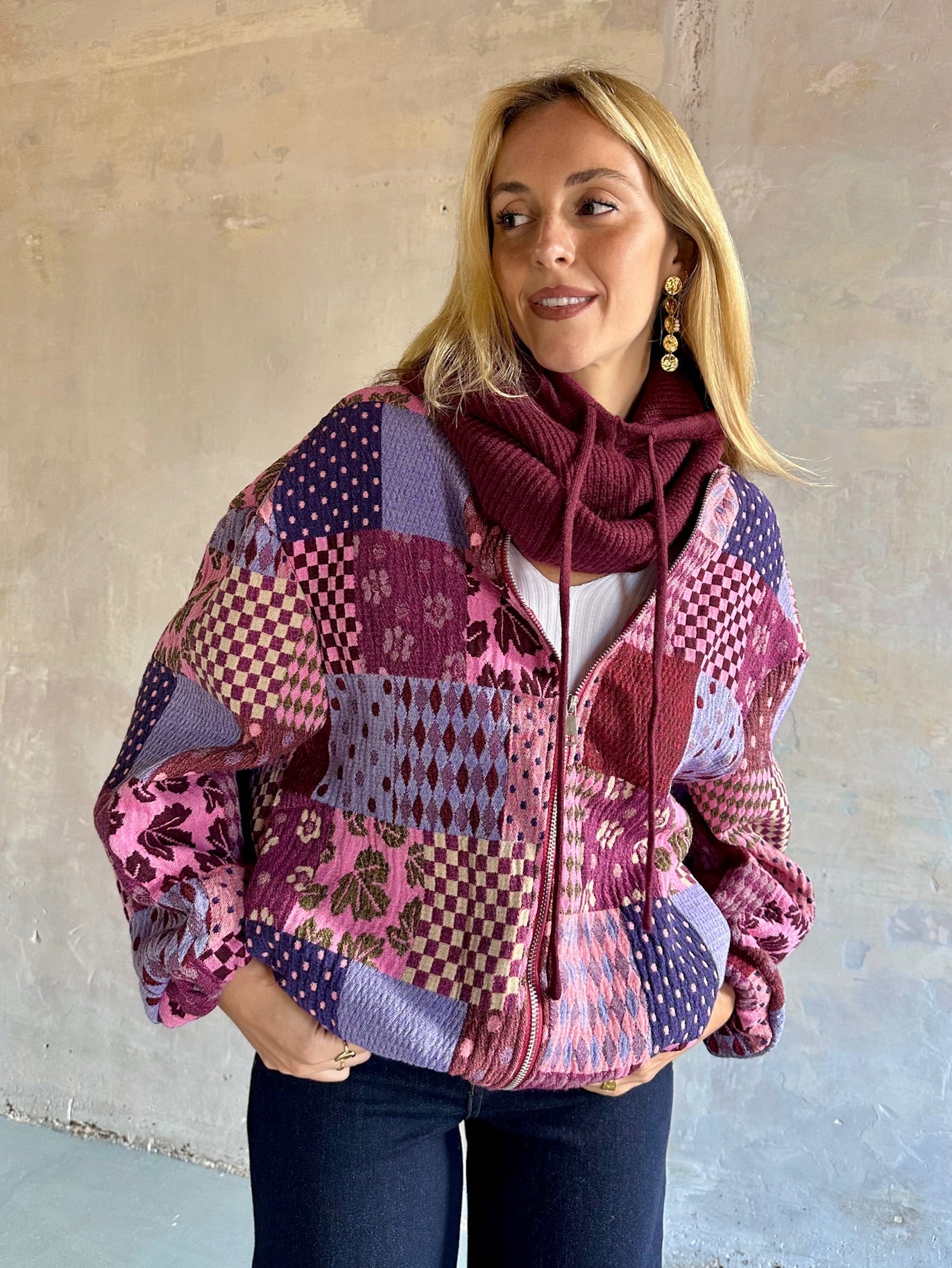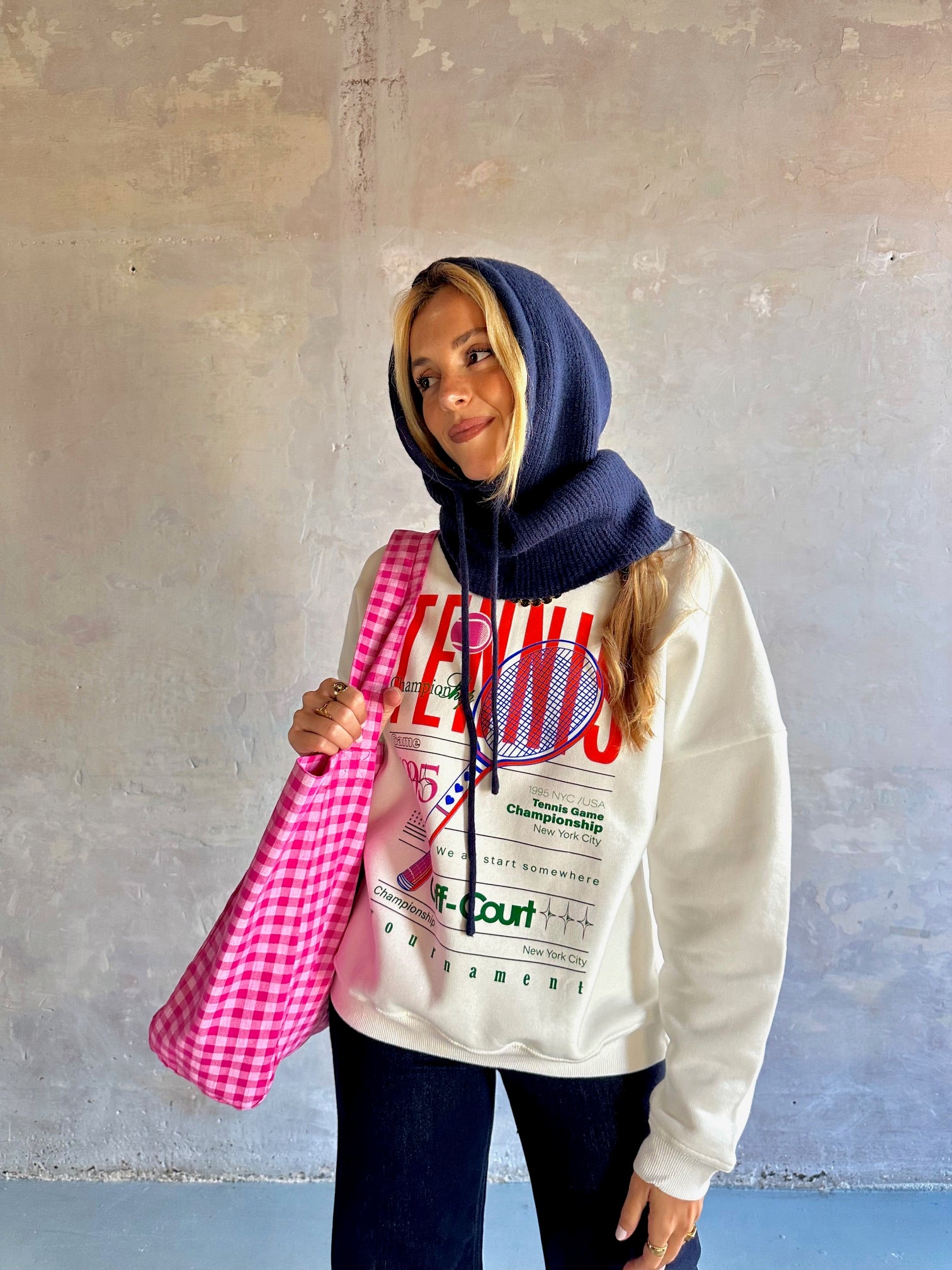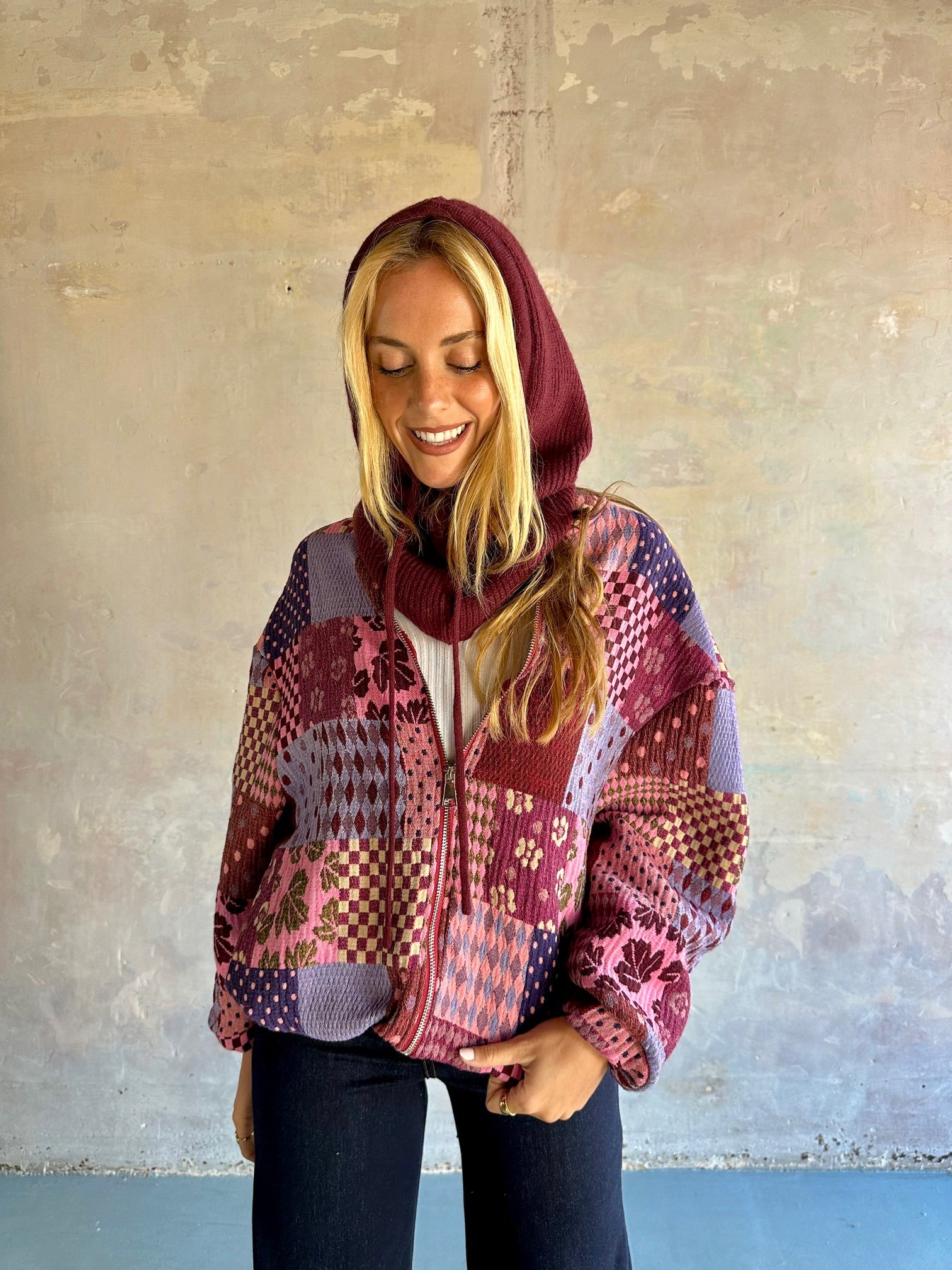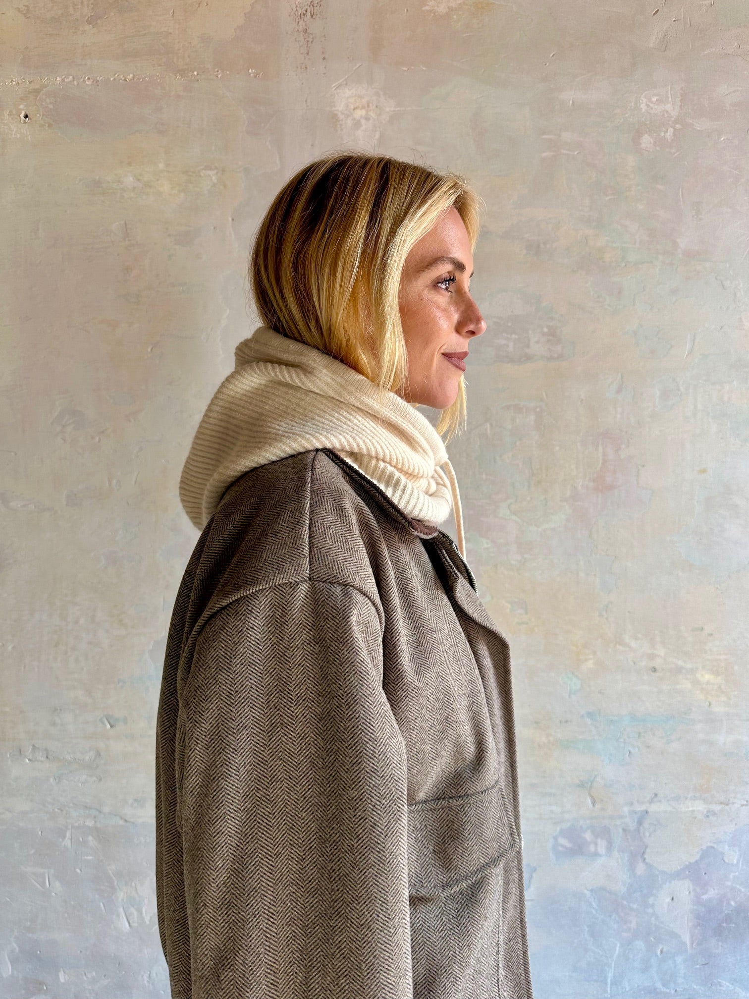Capucha en punto suave de canalé con cordón ajustable delantero.