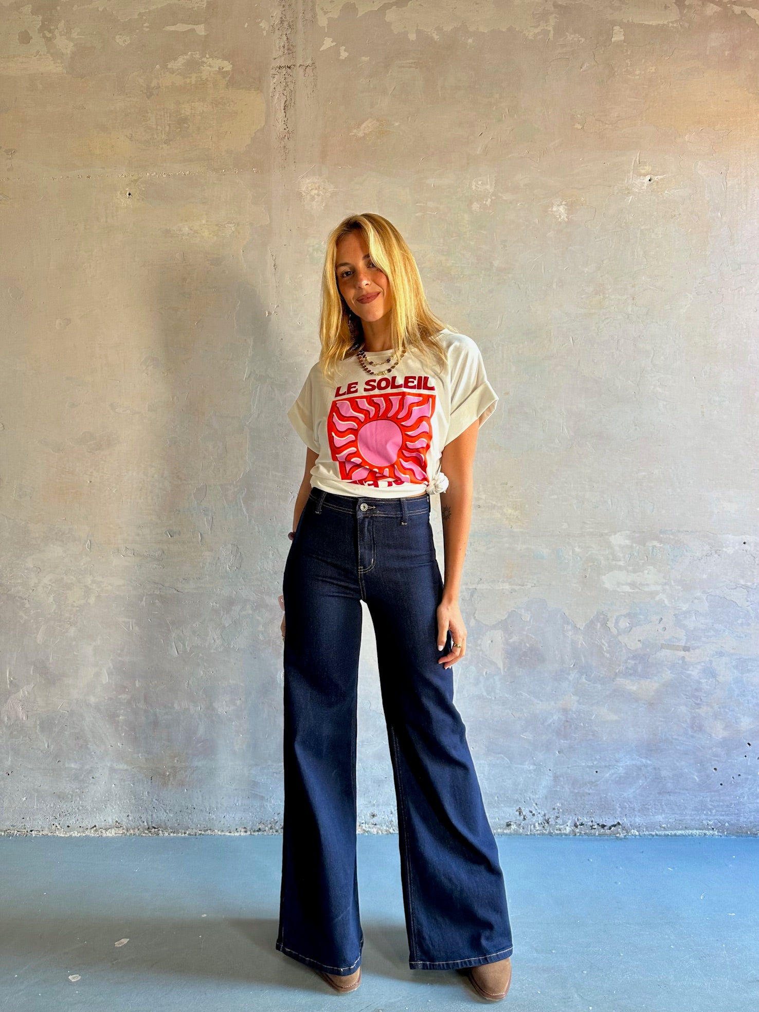 Jeans de tiro alto con bolsillos. Bajo acabado en campana. Cierre frontal con cremallera y botón metálico.