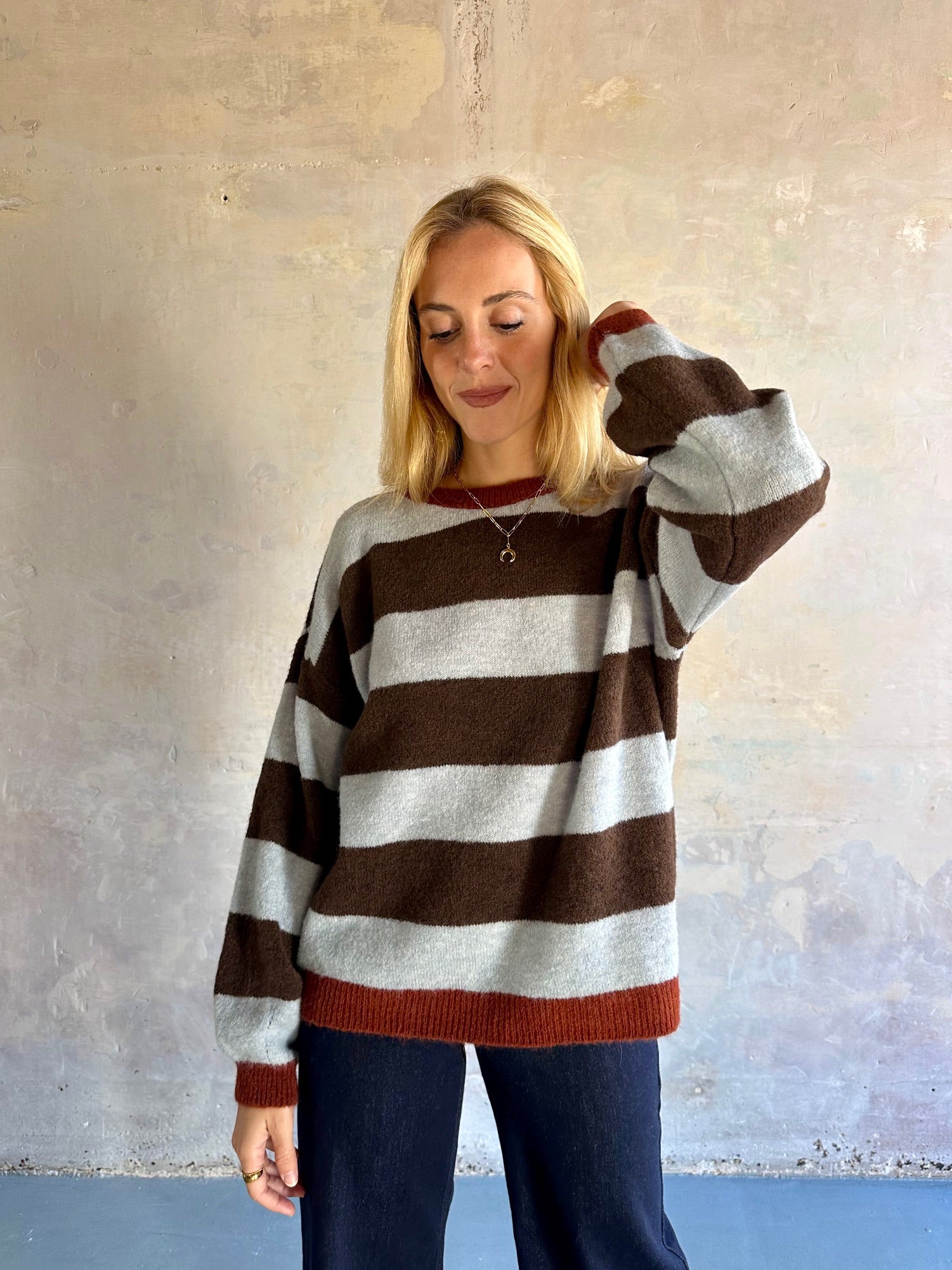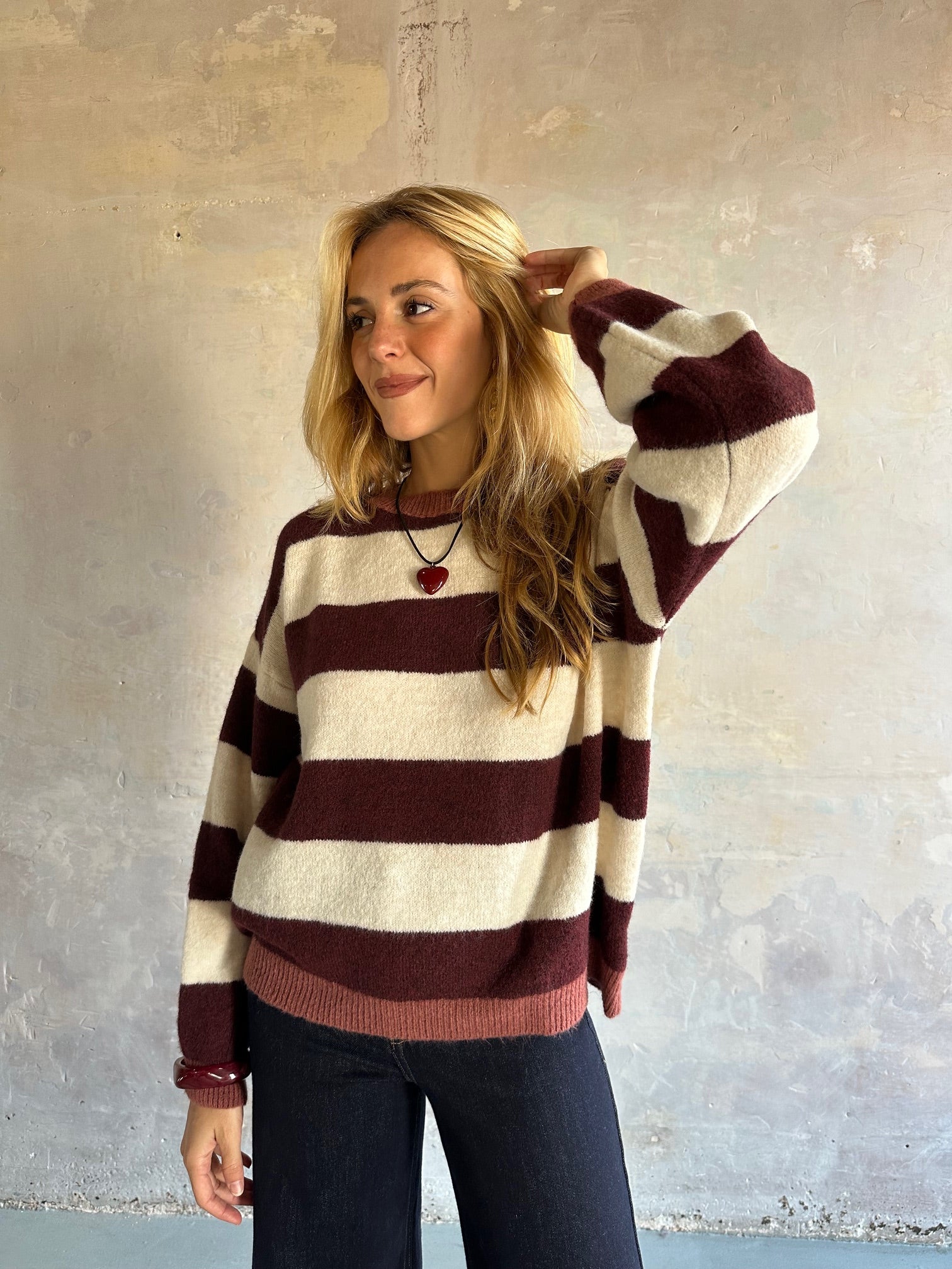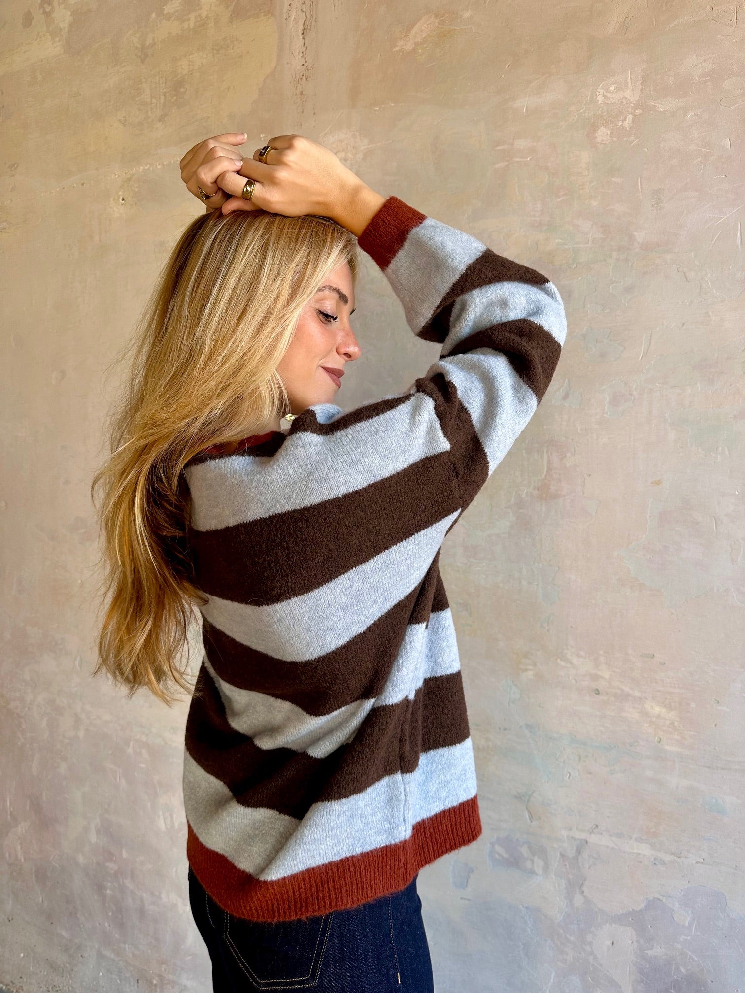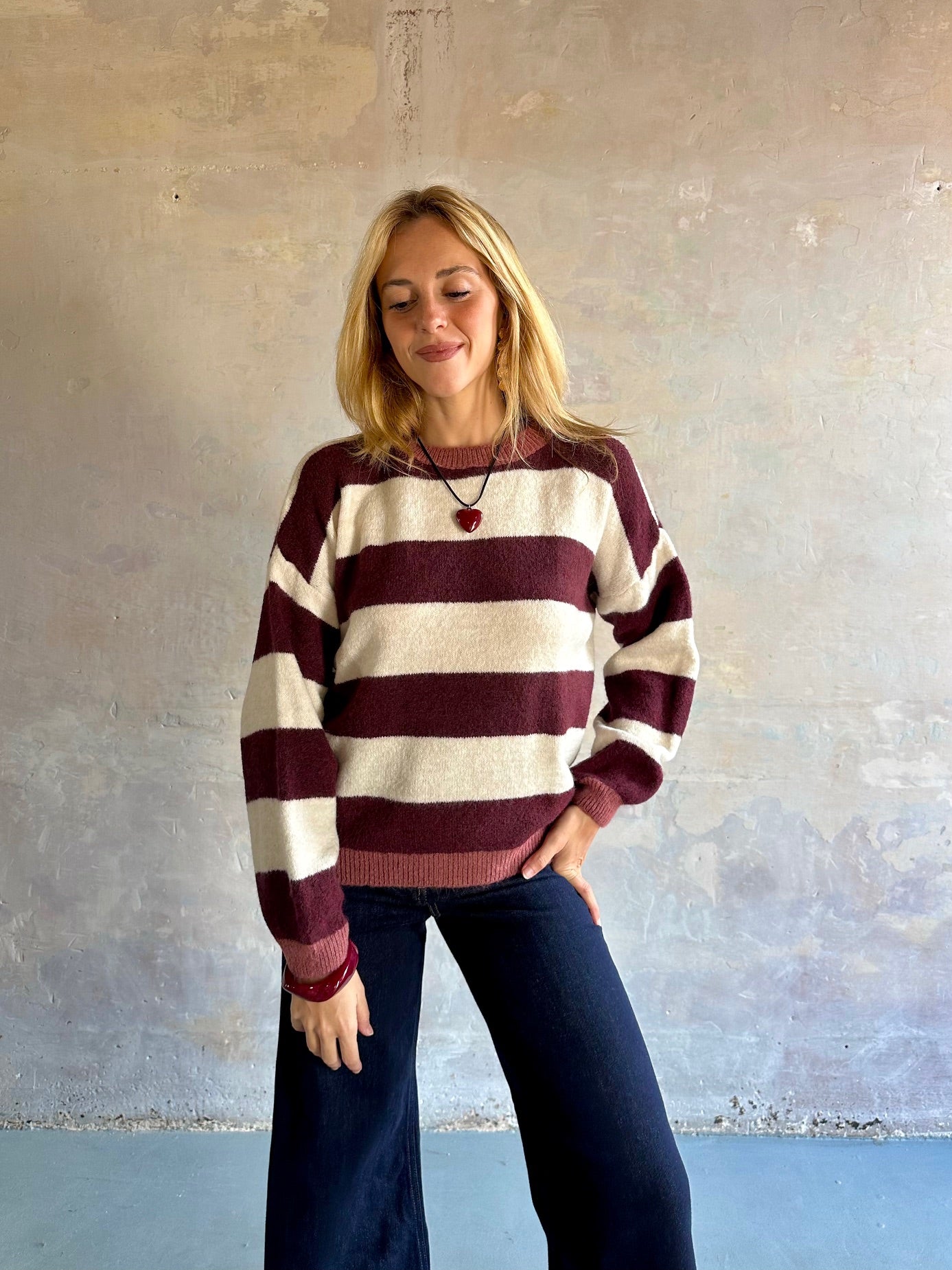 Jersey de punto con rayas anchas, con detalles en rib de cuello, puños y bajo a contraste. De tacto suave y corte recto, perfecto para un look relajado con un toque moderno. Ideal para esos días en los que queréis estar cómoda, calentita y con estilo sin pensarlo demasiado. 🤎✨