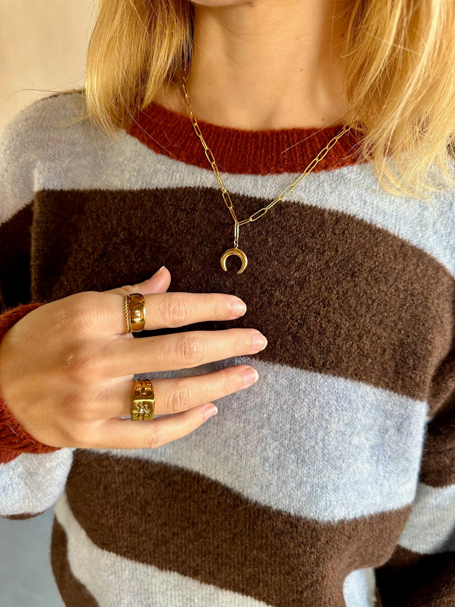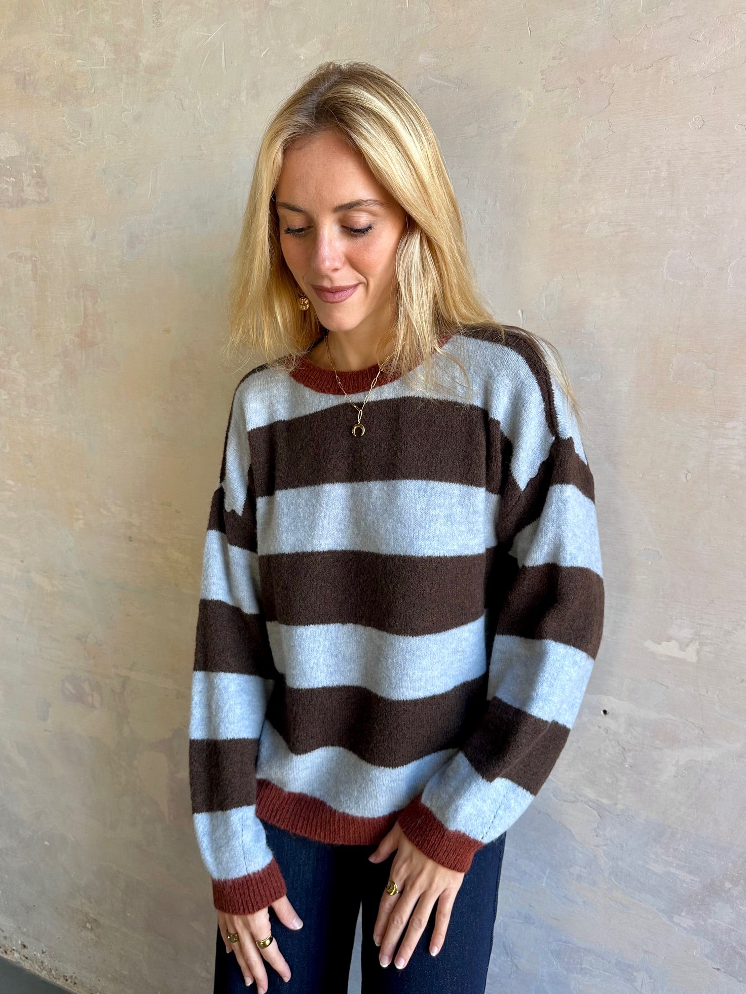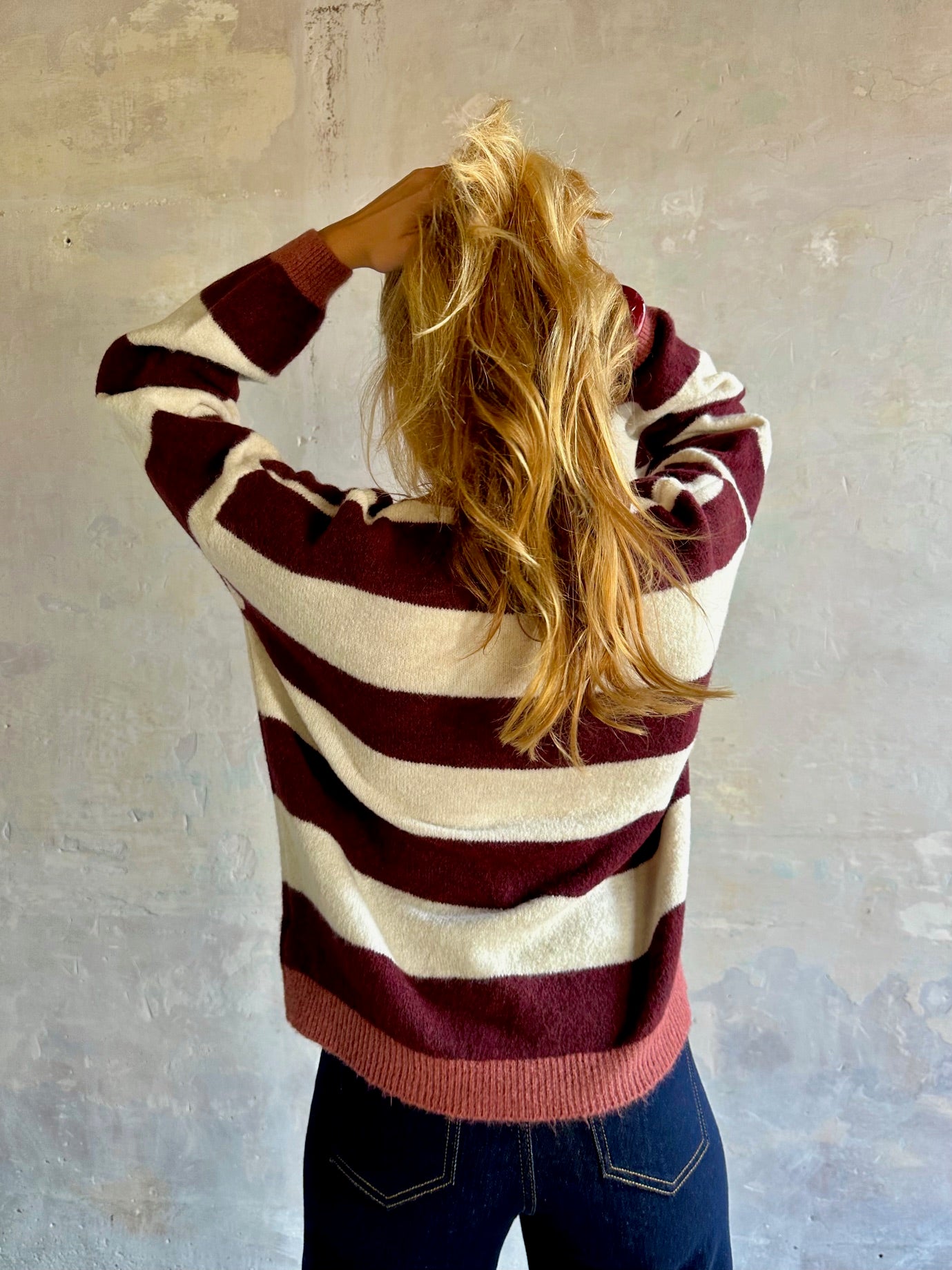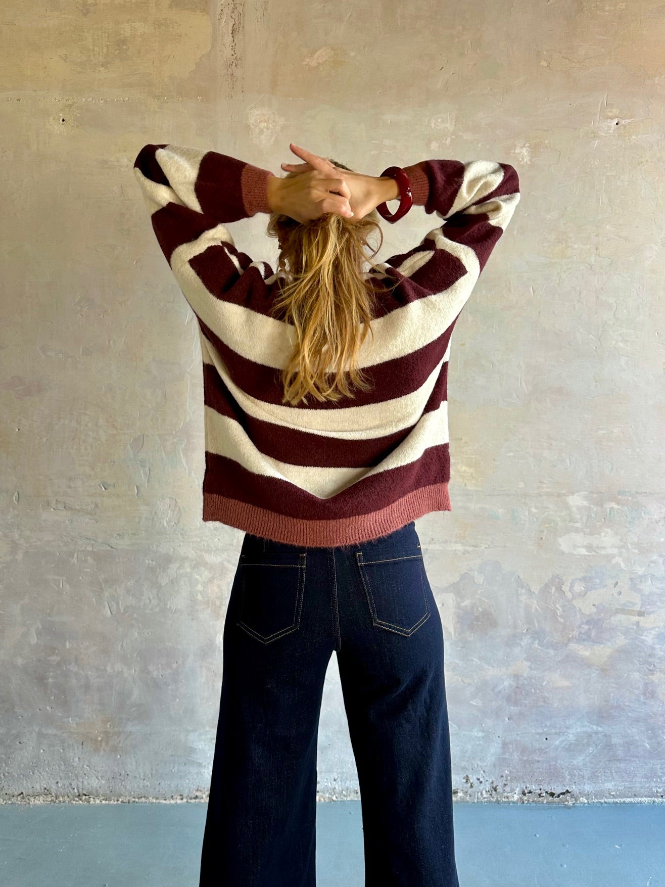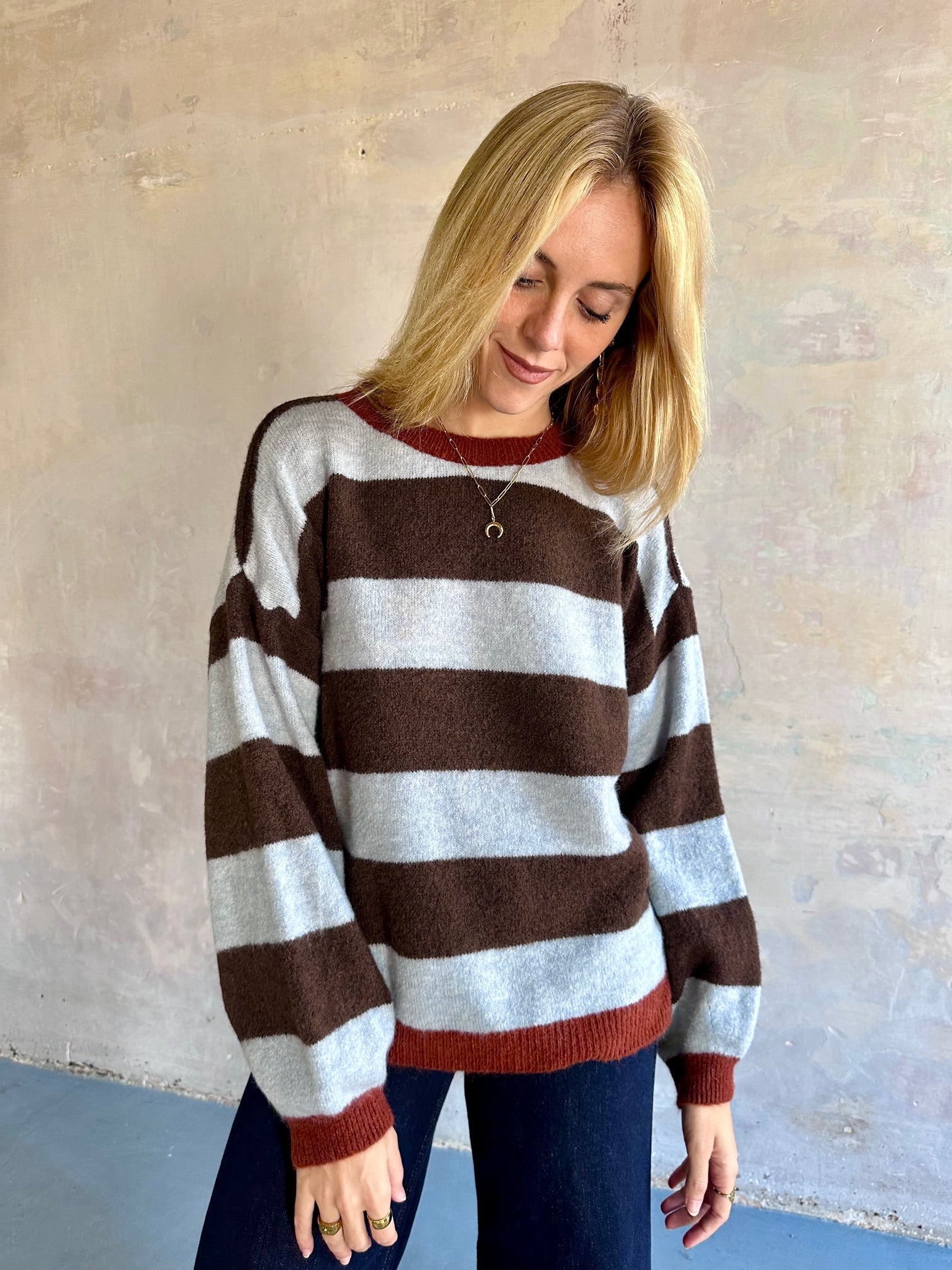 Jersey de punto con rayas anchas, con detalles en rib de cuello, puños y bajo a contraste. De tacto suave y corte recto, perfecto para un look relajado con un toque moderno. Ideal para esos días en los que queréis estar cómoda, calentita y con estilo sin pensarlo demasiado. 🤎✨