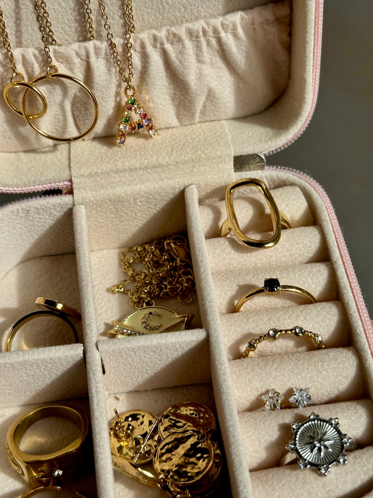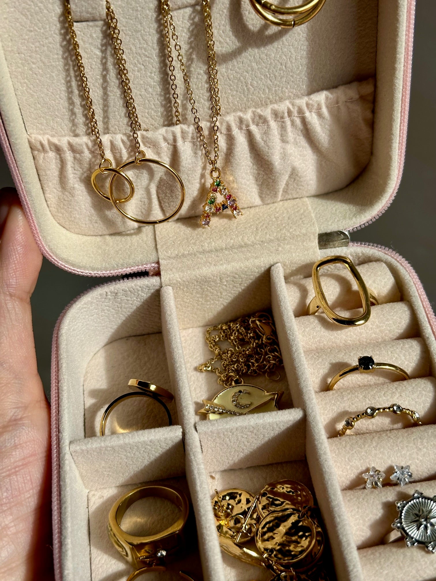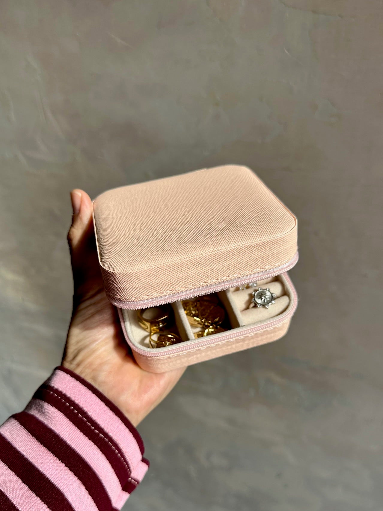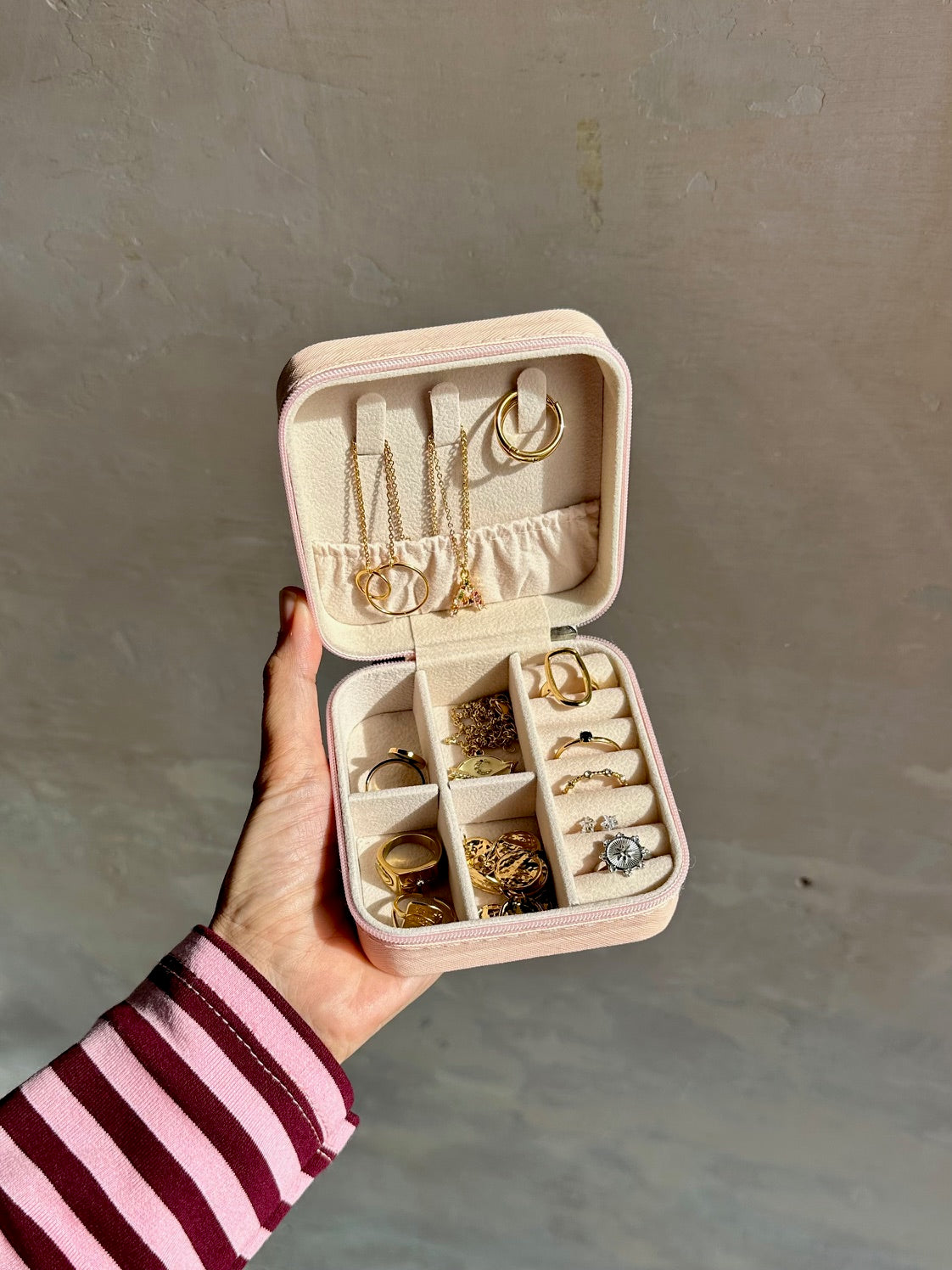 Joyero cuadrado perfecto para tus viajes. Abertura con cierre de cremallera. .Enganches para collares o pulseras. Compartimento con elástico y espacios separados para anillos y pendientes.