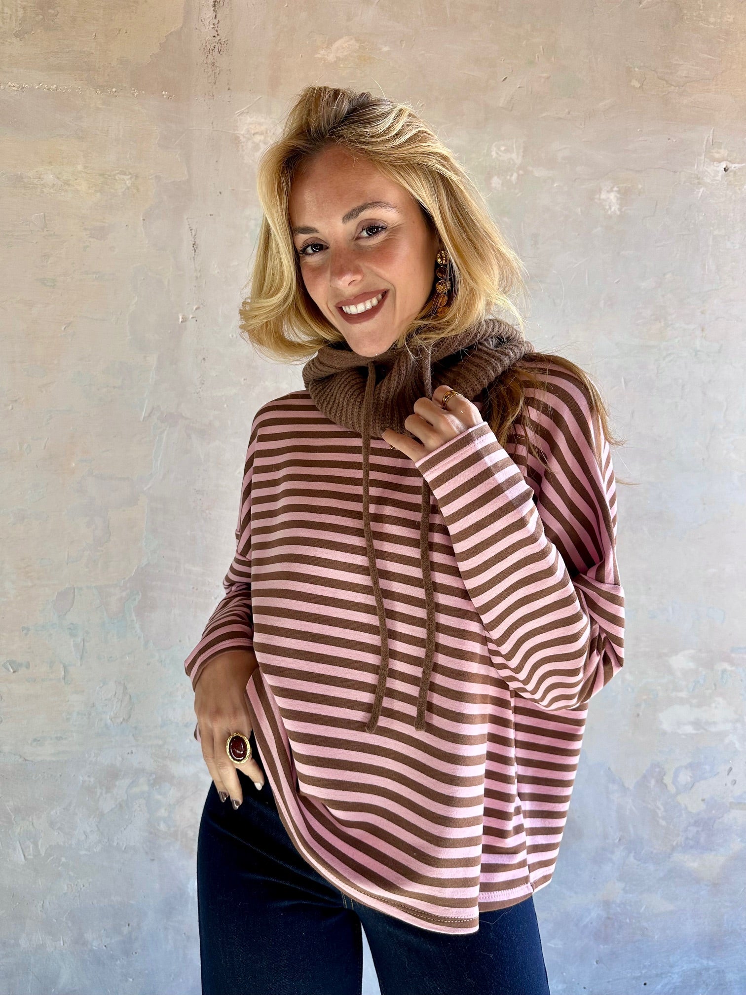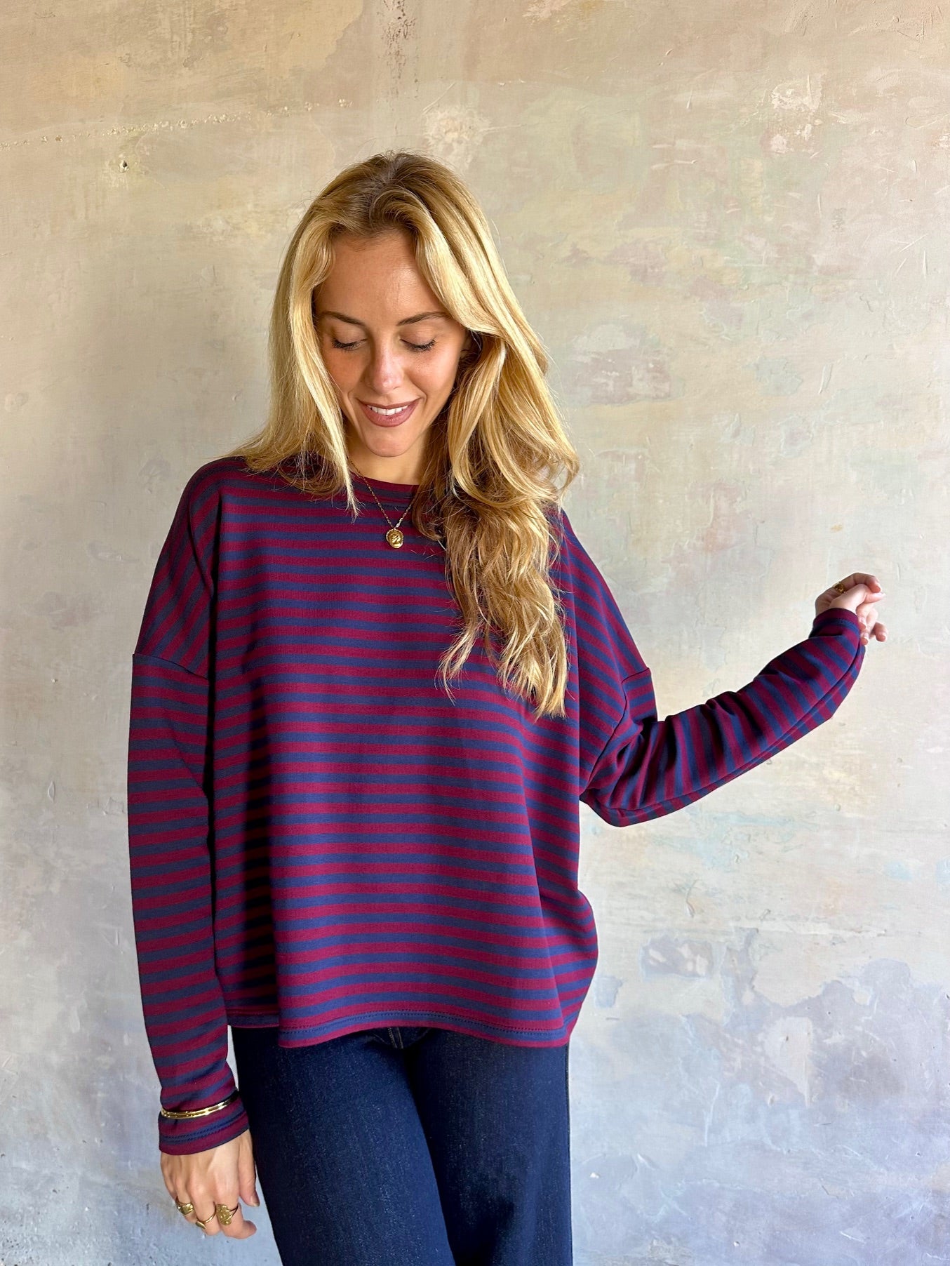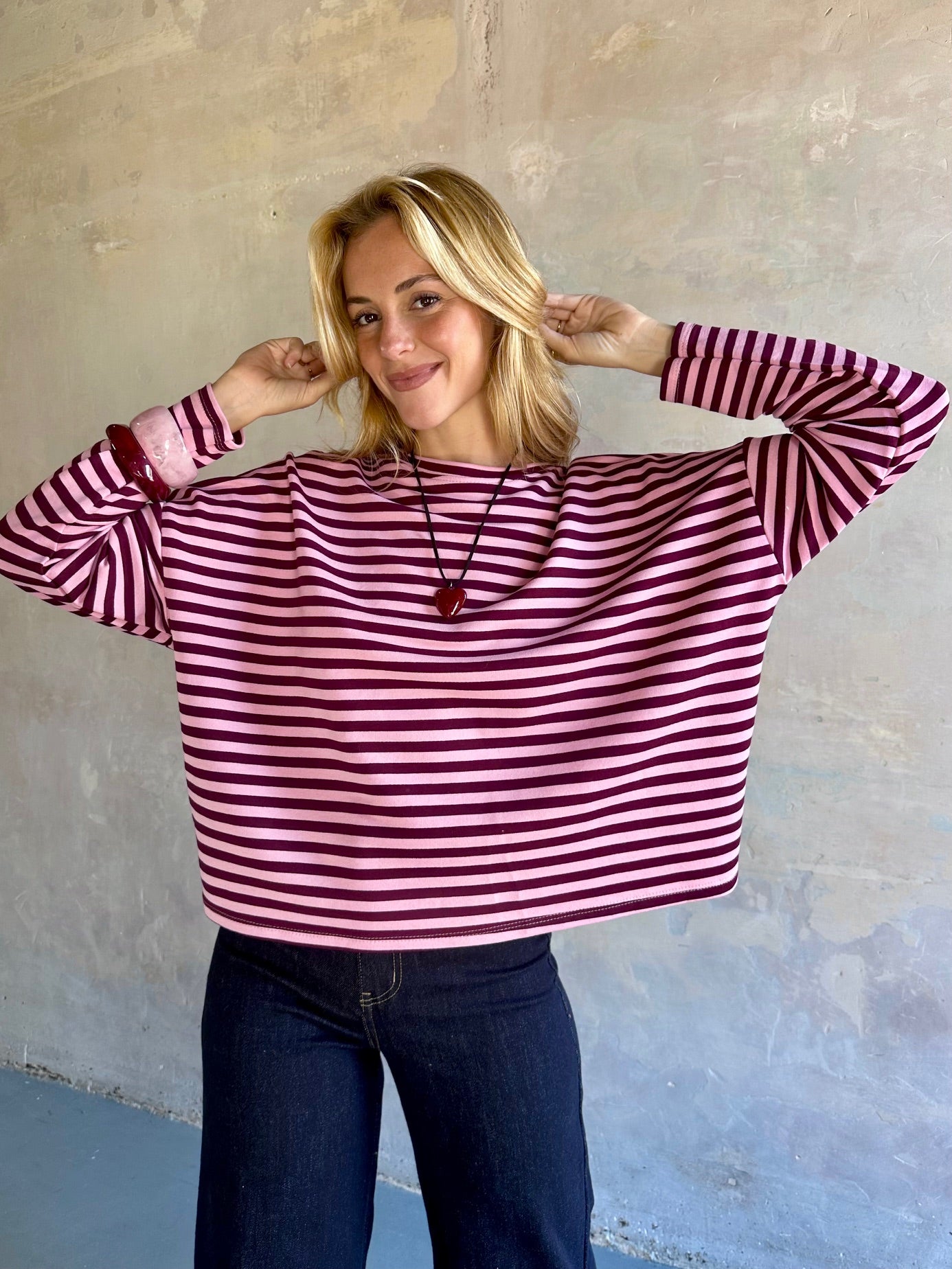 Sudadera de rayas con cuello redondo y manga larga. Su corte amplio le da un toque relajado pero con estilo —perfecta para looks casuales, días cómodos o planes espontáneos. 💫❤️