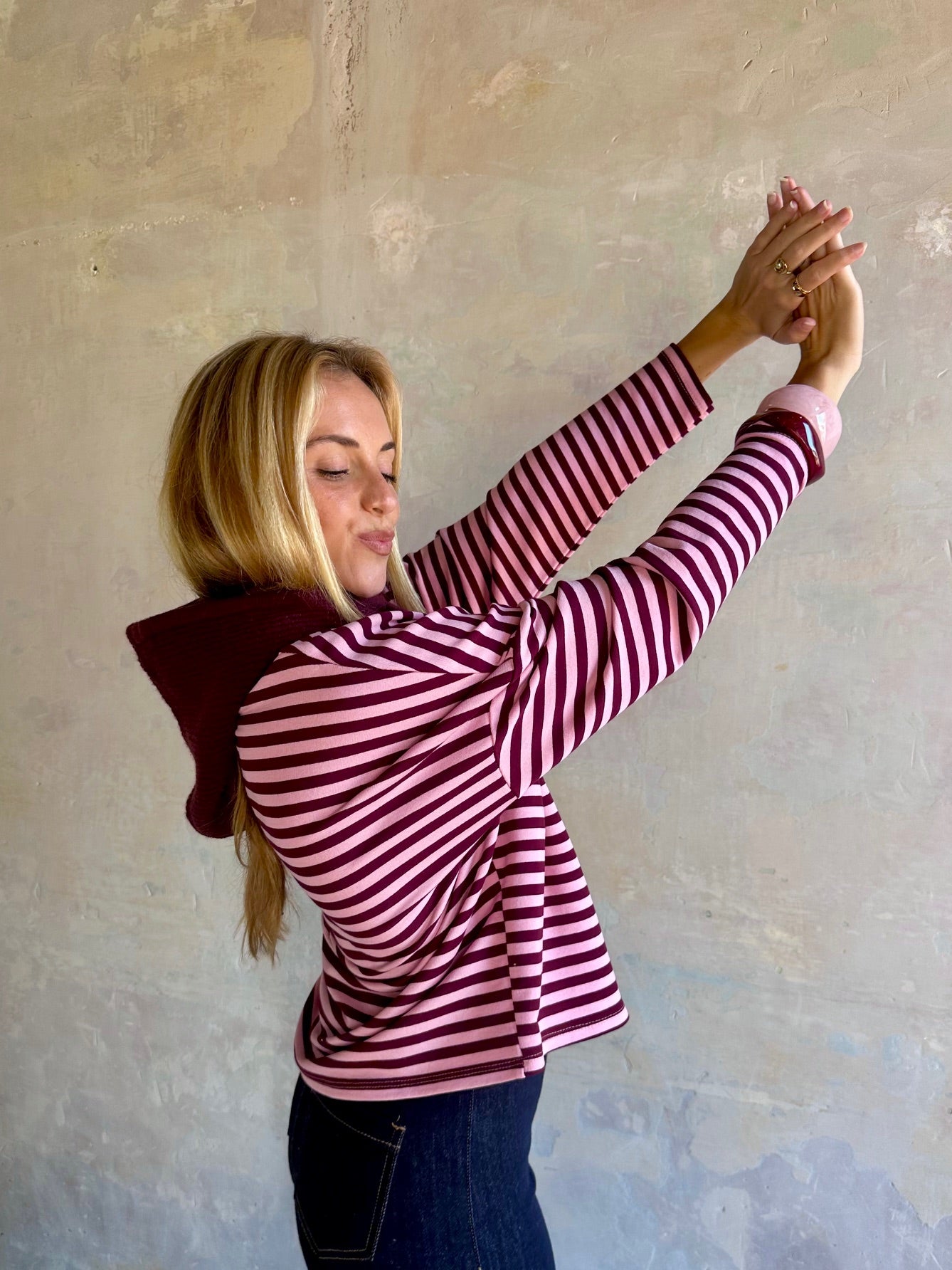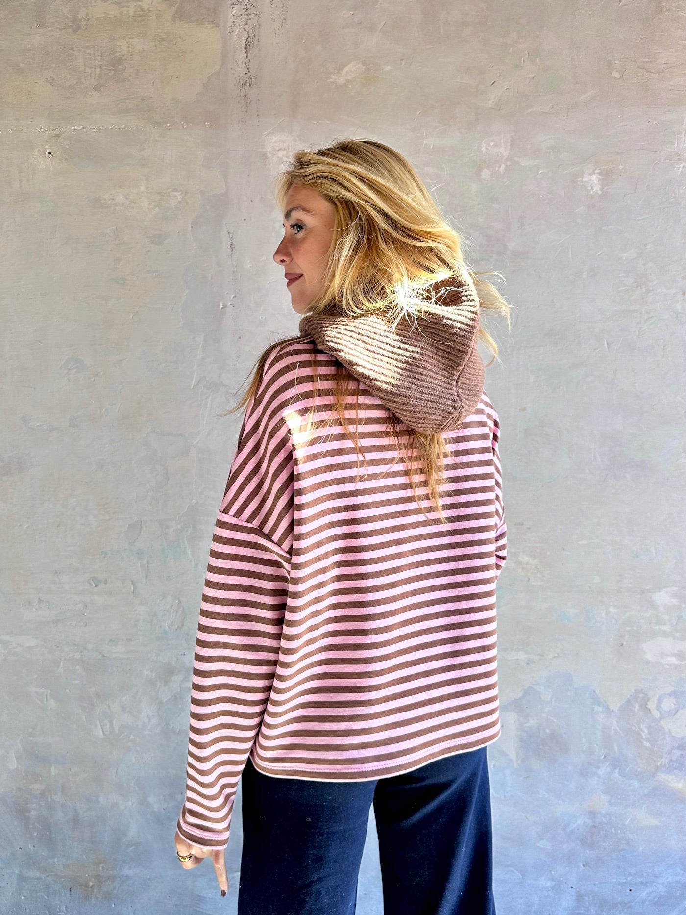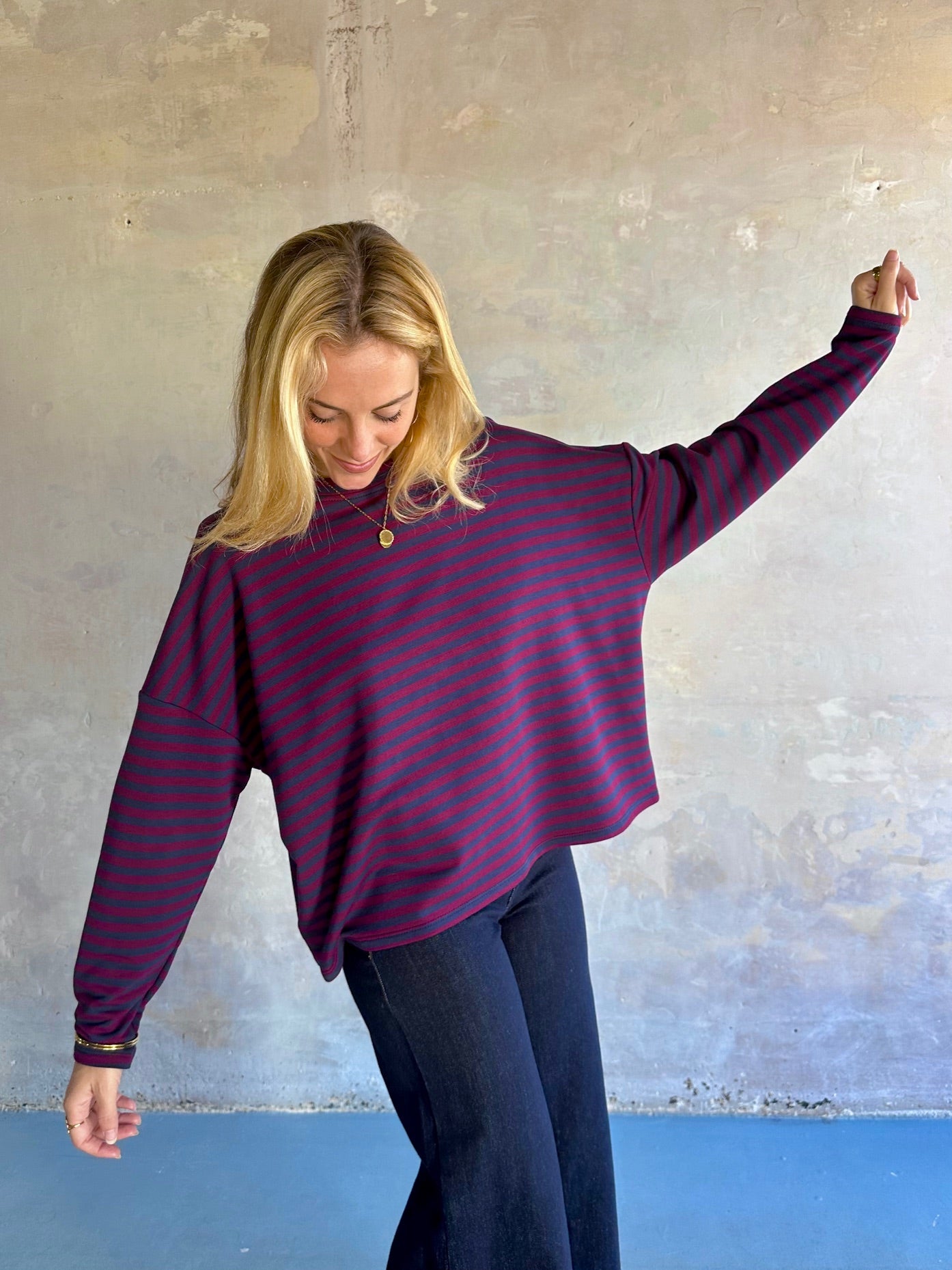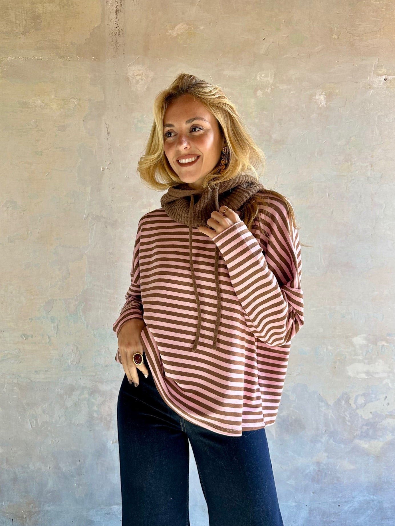 Sudadera de rayas con cuello redondo y manga larga. Su corte amplio le da un toque relajado pero con estilo —perfecta para looks casuales, días cómodos o planes espontáneos. 💫❤️