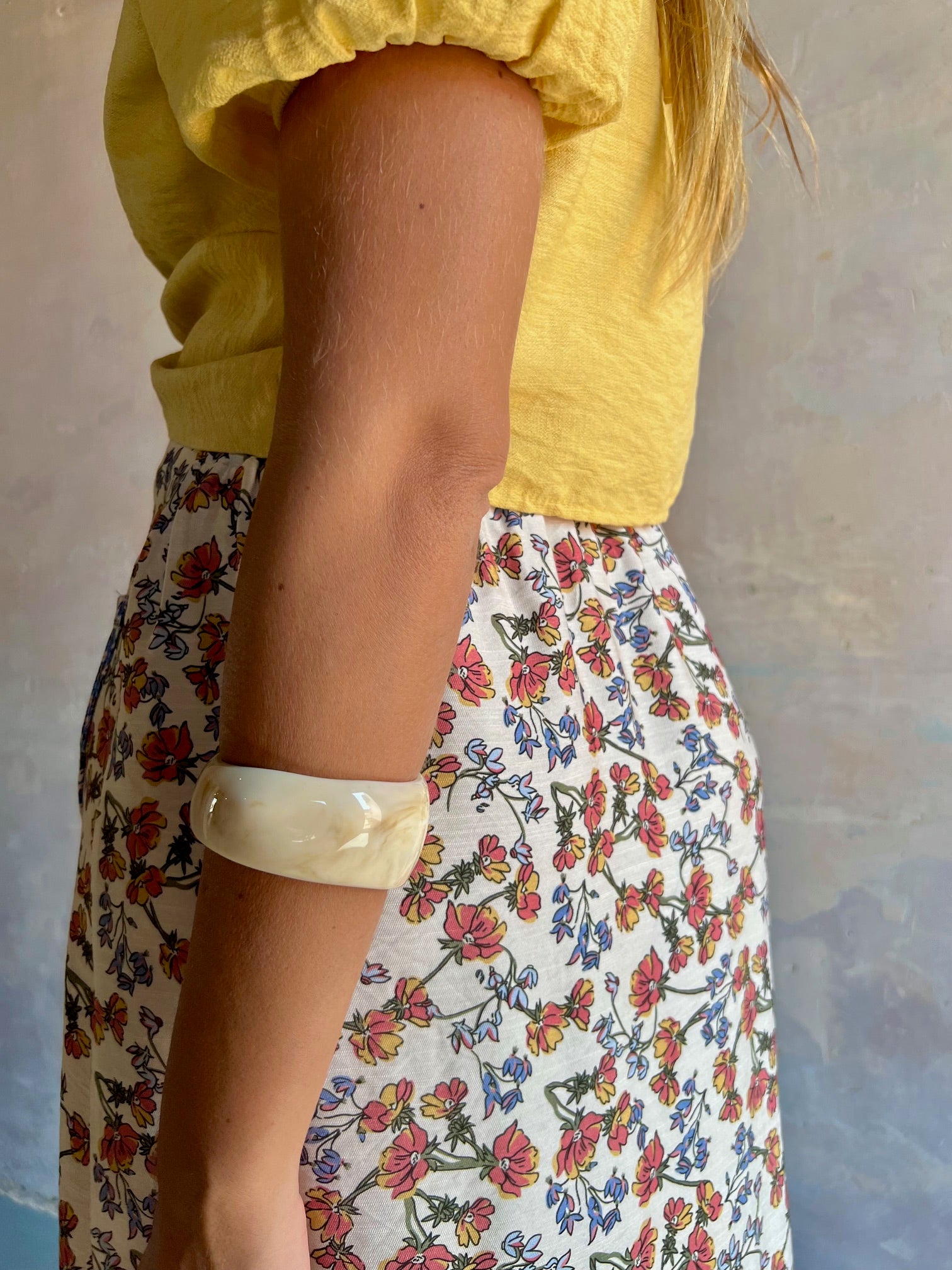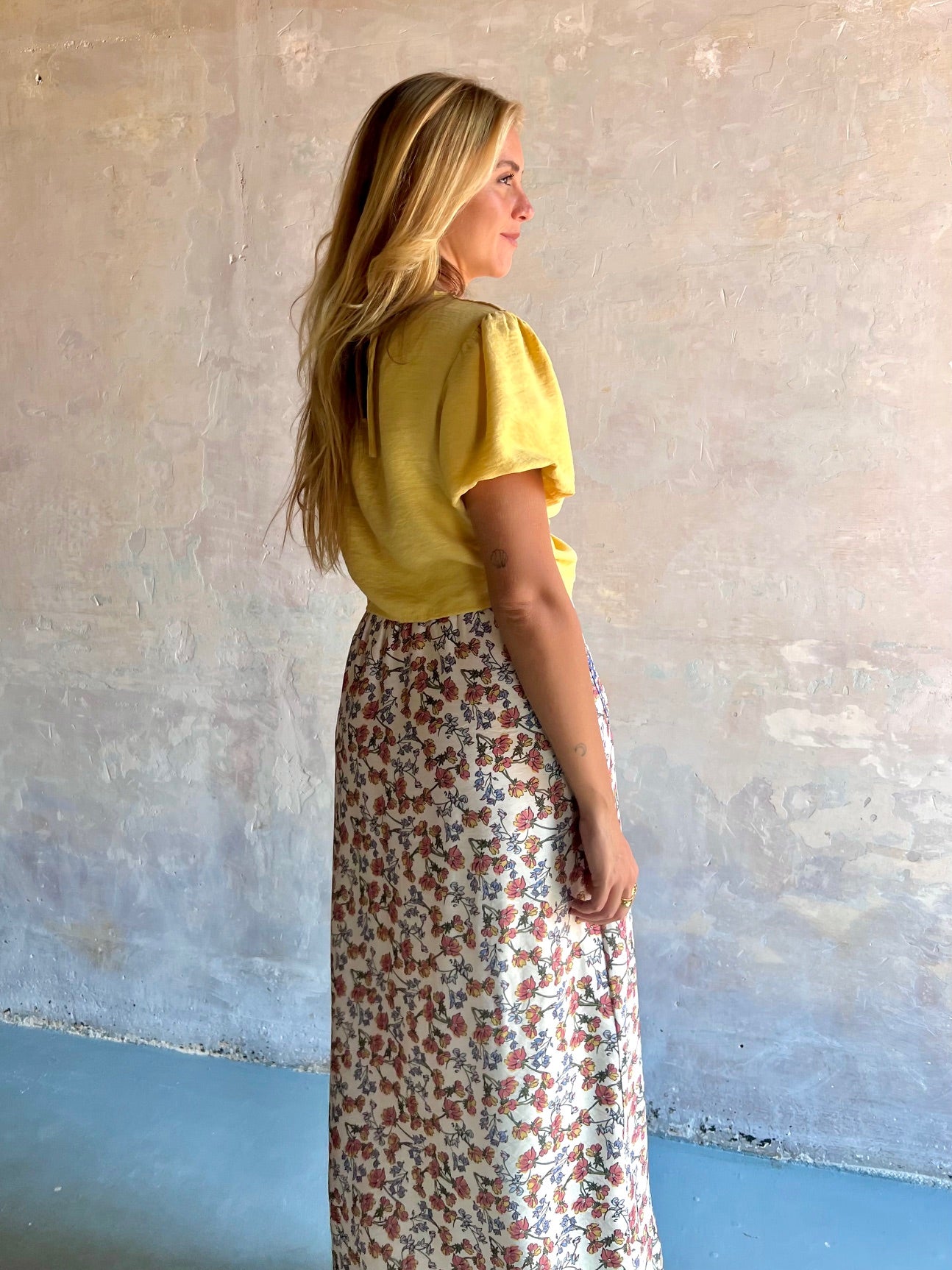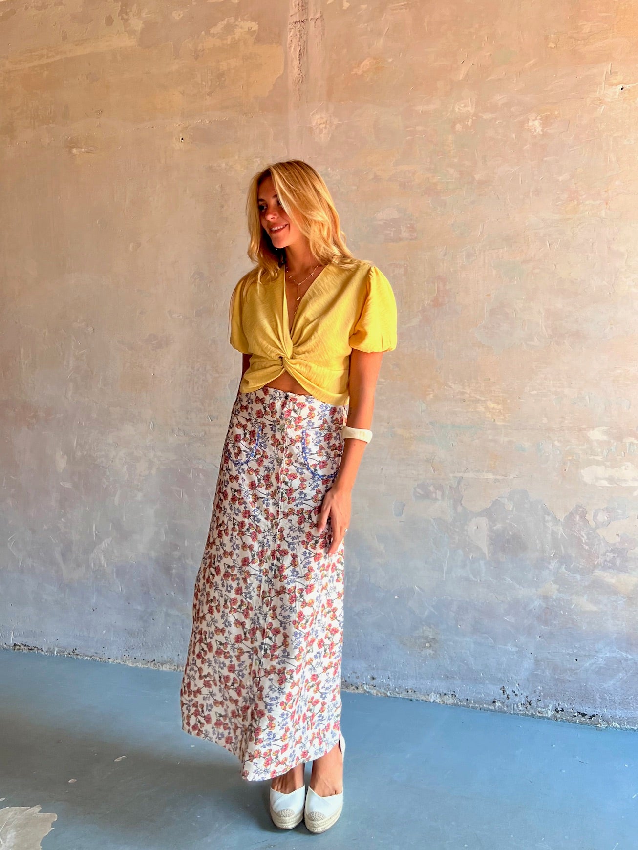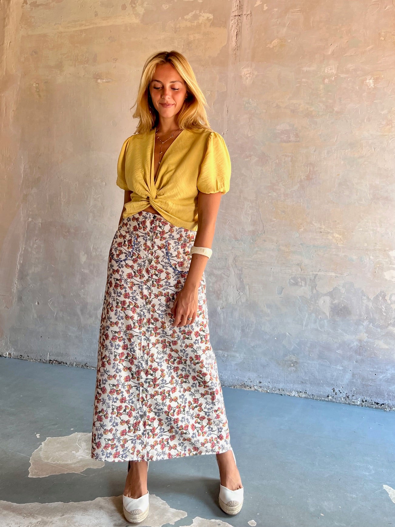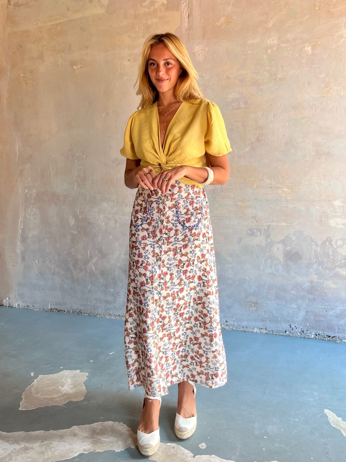 Falda larga con goma en cintura. Cierre frontal con botones y bolsillos delanteros.