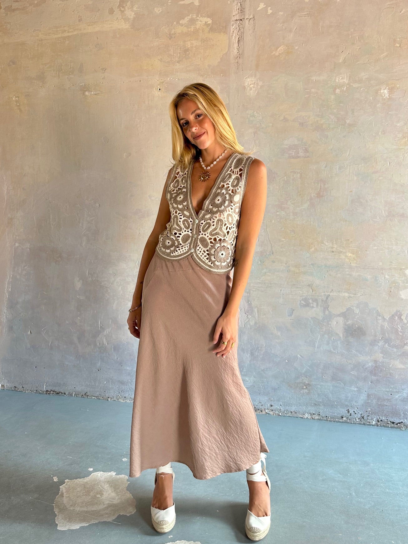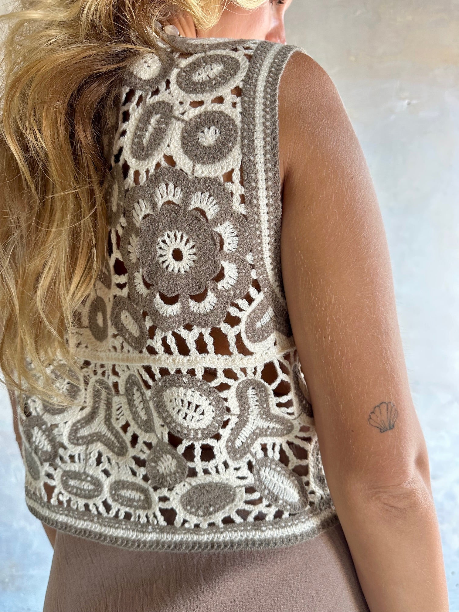 Chaleco de estilo crochet con cuello pico. Cierre frontal con botones.