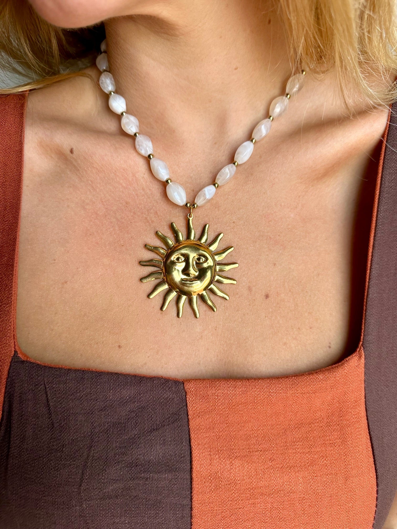Collar de perlas con colgante de sol, cierre con mosquetón.