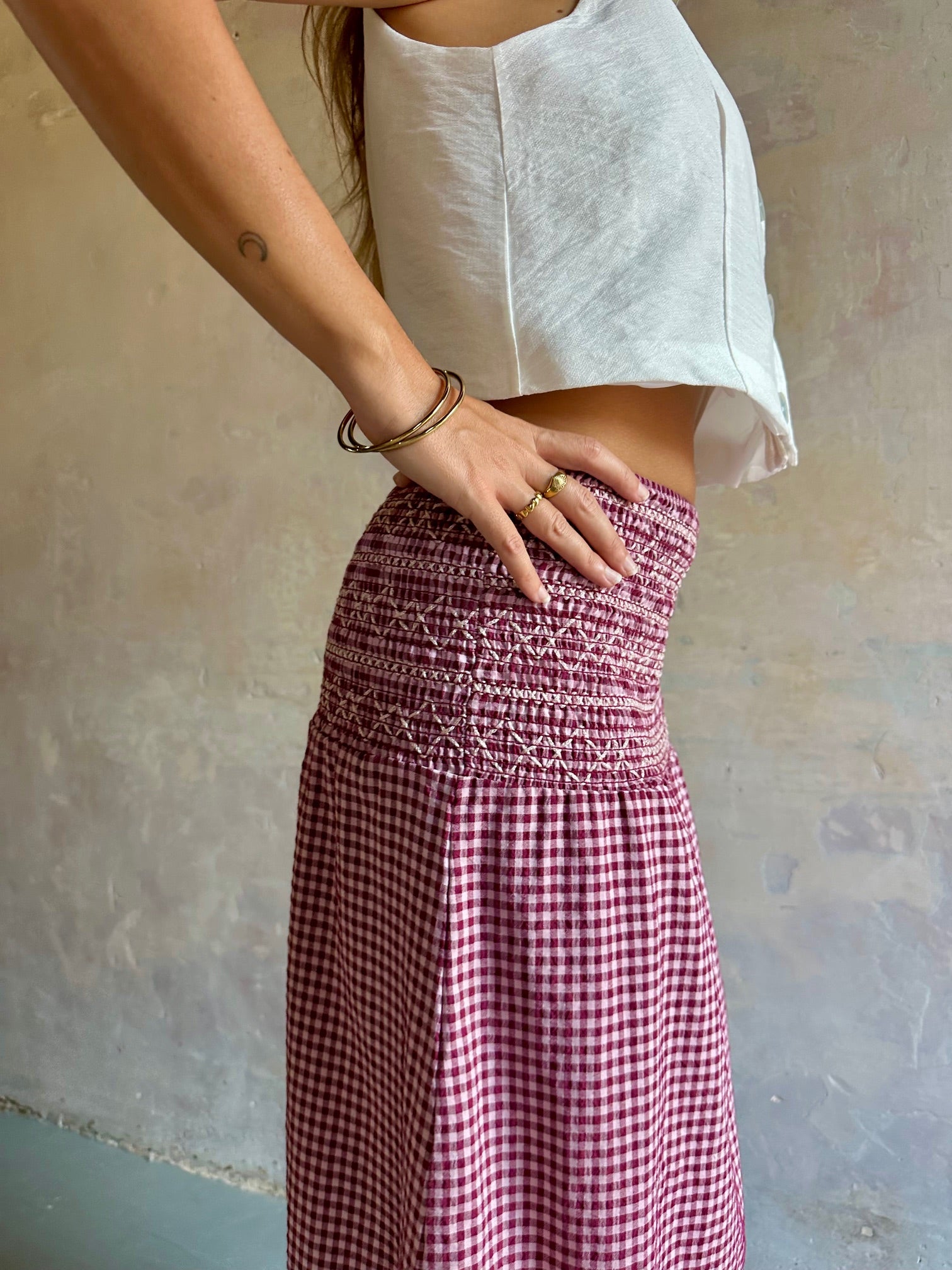 1-Falda midi de tiro medio con cintura elástica tipo nido de abeja.